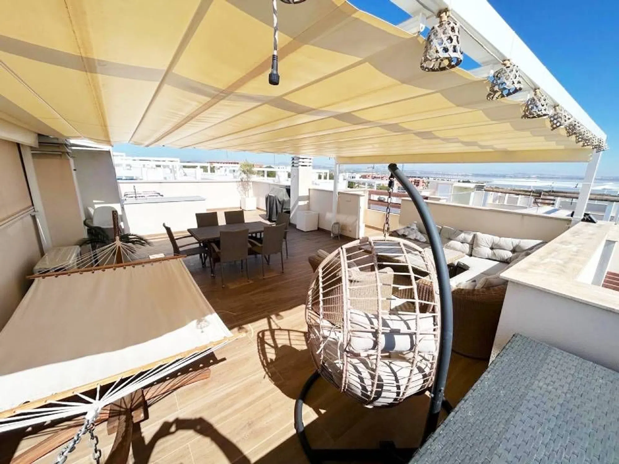 Impresionante ático en venta en Los Balcones, cerca de todos los servicios, parada de autobús y a un corto trayecto en coche del mar, playas y campos de golf. Construido en 2023, este apartamento le ofrece todo lo que necesita. Dispone de 3 dormitorios, 2 baños, un luminoso salón-comedor con cocina abierta, terraza y solárium de 57 m² con cocina de verano y pérgola. El precio incluye plaza de aparcamiento subterráneo y trastero. El apartamento se vende parcialmente amueblado y equipado con persianas eléctricas, aire acondicionado y suelo radiante en los baños. Listo para entrar a vivir, no deje pasar esta oportunidad.