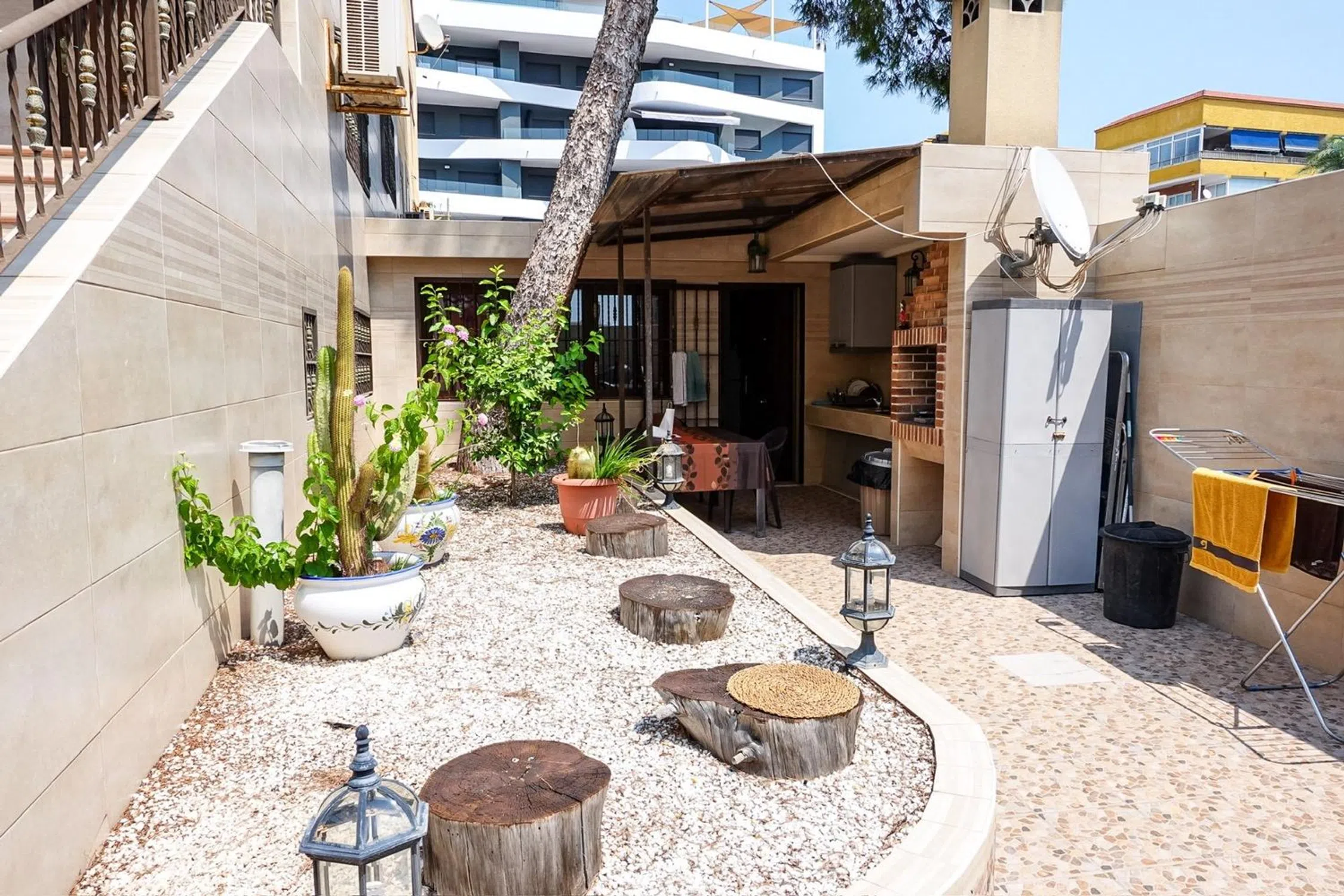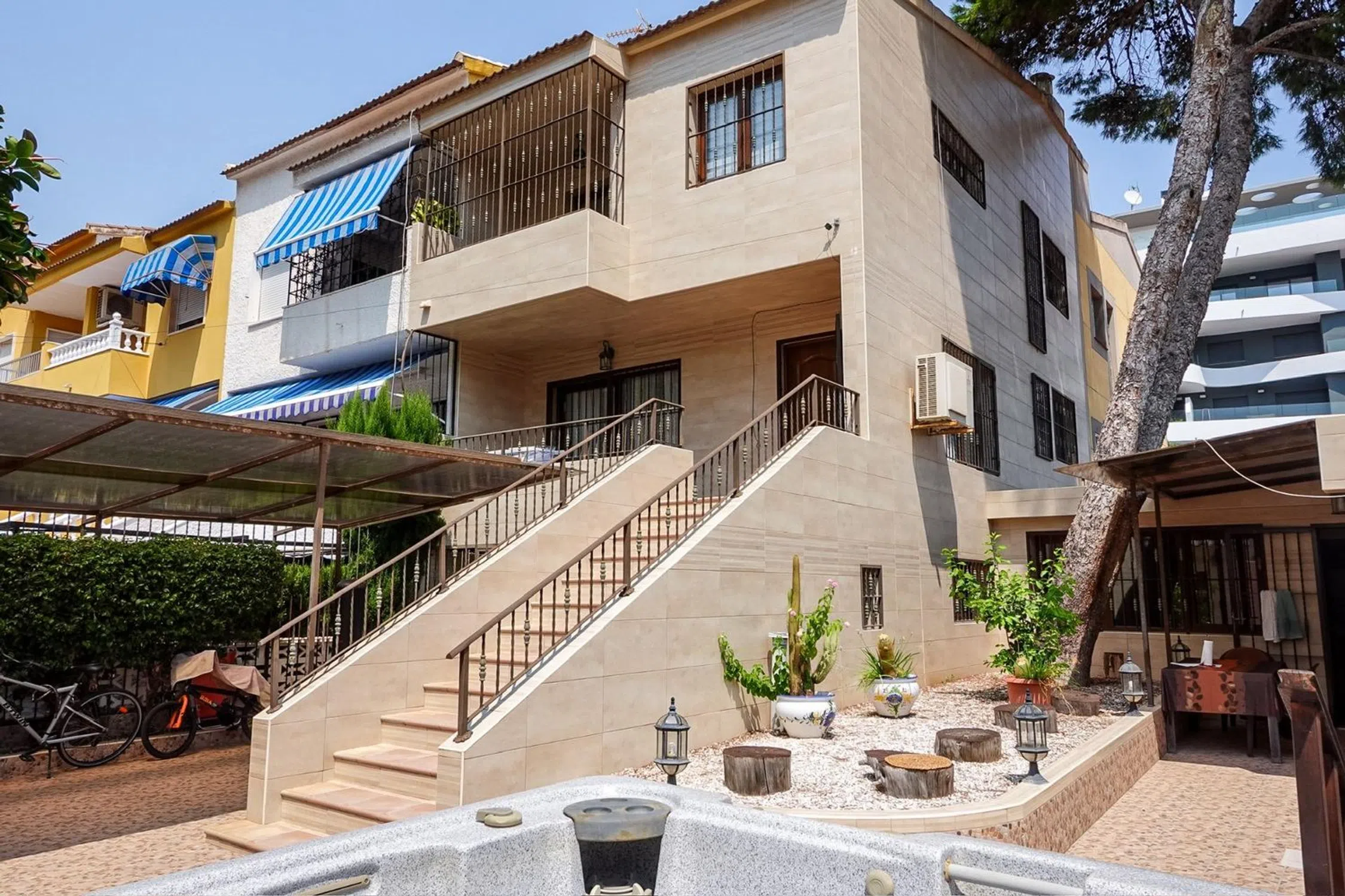 Se ofrece en venta una amplia vivienda de esquina en la zona de Punta Prima (Torrevieja), situada a tan solo 250 metros del mar. La casa, distribuida en tres plantas con accesos independientes, suma una superficie construida de 202 m², de los cuales 162 m² corresponden a la vivienda principal y 25 m² a un estudio independiente, ideal para invitados o como opción de alquiler adicional. En su interior dispone de cuatro dormitorios de gran tamaño y tres baños completos con ducha. Todas las estancias cuentan con aire acondicionado Mitsubishi, y las ventanas y balcones están equipados con rejas decorativas en hierro con acabados en latón. La vivienda goza de un patio privado muy acogedor, rodeado por una valla de más de dos metros de altura que aporta privacidad. Un gran pino en la parcela ofrece sombra natural y un ambiente fresco con aroma a resina. Además, se puede disfrutar de jacuzzi, barbacoa, cocina exterior totalmente equipada y cochera cubierta. Las superficies exteriores —fachada, muros y patio— están revestidas con azulejos de alta calidad, lo que garantiza un mantenimiento duradero y estético. Gracias a su excelente localización junto al mar, esta propiedad es perfecta tanto como residencia habitual como para inversión con alta rentabilidad por alquiler. La cercanía a la playa, la buena comunicación y la disponibilidad de servicios convierten a Punta Prima en una de las áreas más exclusivas y demandadas de Torrevieja. En las inmediaciones se encuentran restaurantes emblemáticos como Nautilus, zonas de paseo marítimo, supermercados, playas, paradas de autobús y todos los servicios necesarios para el día a día. Una oportunidad única para quienes buscan una vivienda espaciosa, versátil y con una ubicación privilegiada en la costa mediterránea.