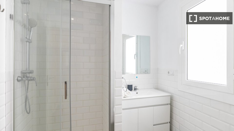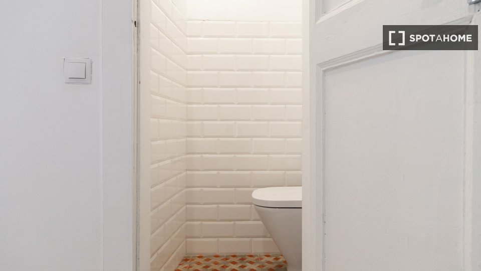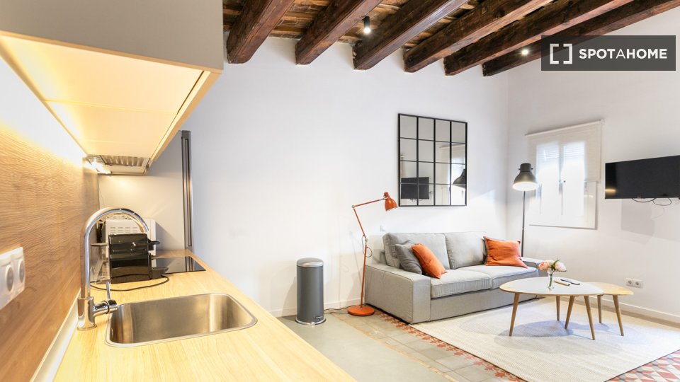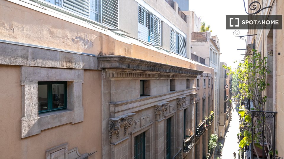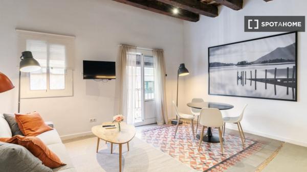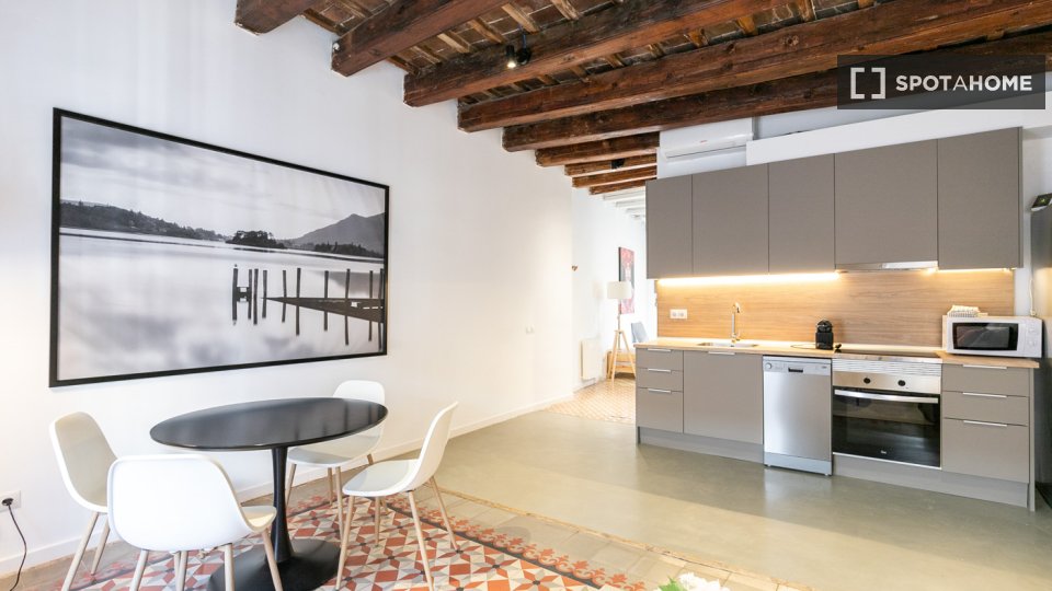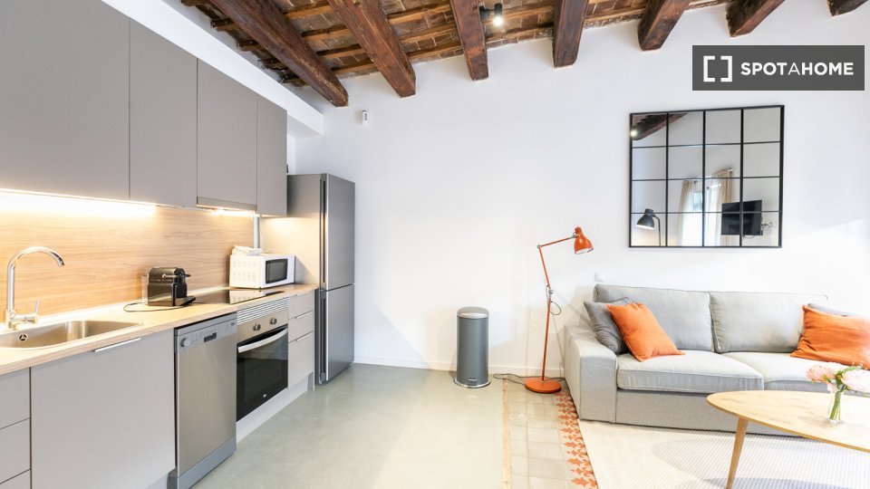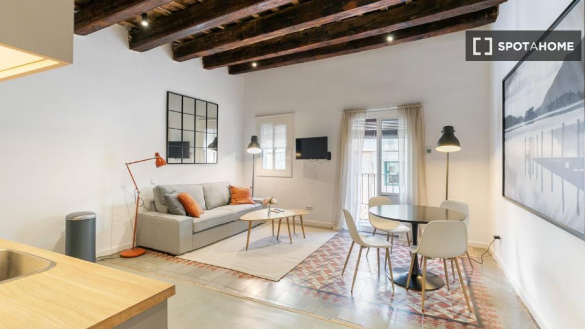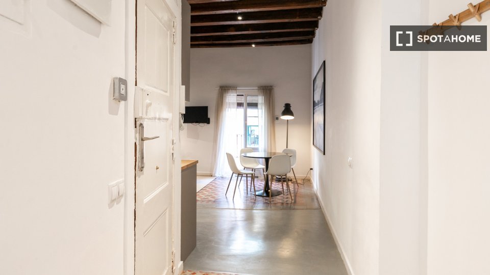 Este apartamento en la calle Tallers combina el encanto del centro histórico con una distribución cómoda y funcional. La sala de estar cuenta con un amplio salón-comedor con sofá, televisión y mesa de comedor, y tiene acceso directo a un balcón que proporciona luz natural y permite disfrutar del vibrante ambiente del barrio. La cocina, integrada en el mismo espacio, está equipada con todos los electrodomésticos necesarios y también cuenta con una zona de trabajo con escritorio, ideal para quienes estudian o teletrabajan.