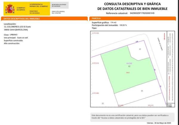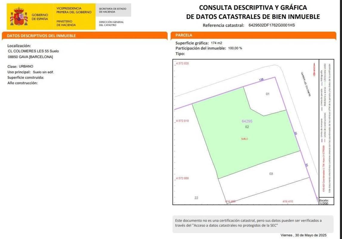 Suelo urbano consolidado de 174 m² en Calle Colomeres Les, 55, Gavà, 08850 Barcelona Se ofrece en venta un excelente suelo urbano consolidado de __ m² de parcela, situados en Calle Colomeres Les, 55, Gavà, 08850 Barcelona, en el municipio de Gava, Barcelona. Esta parcela se compone de referencia catastral: 6429502DF1762G0001HS, con una superficie de 174 m² de parcela Ofrece múltiples posibilidades para desarrollos residenciales o terciarios, según normativa vigente. Se trata de una zona en crecimiento, bien comunicada y con todos los servicios cercanos: transporte público, centros educativos, comercios y zonas verdes. Ideal para promotores, inversores o particulares que deseen construir en un entorno urbano consolidado y con excelente proyección. Para más información urbanística o visitas, no dudes en contactar.
