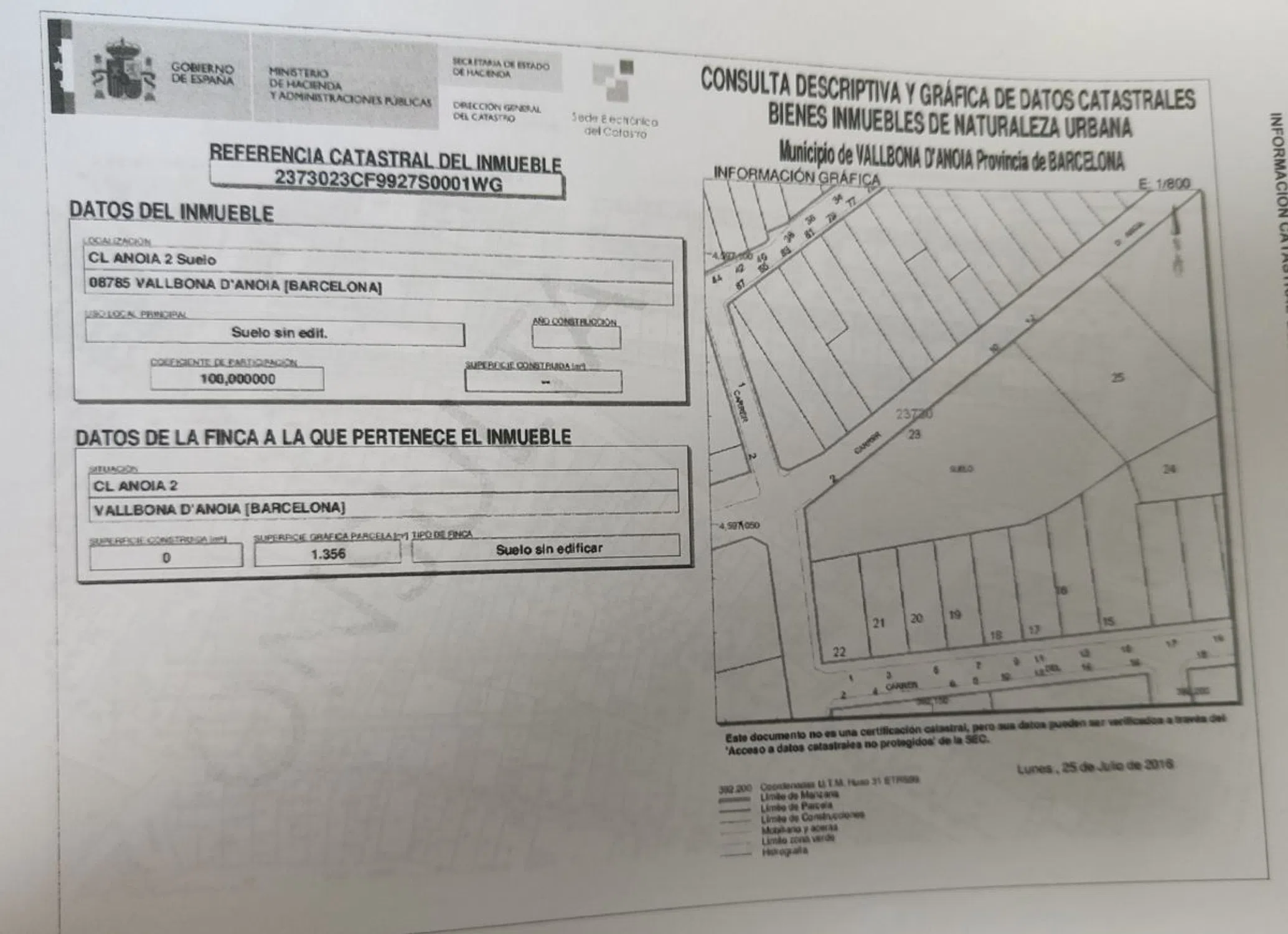 OPORTUNIDAD INVERSORES O CONSTRUCTORES SOLAR UBRANO EN ZONA CENTRO PUEBLO DE VALLBONA D`ANOIA LISTO PARA EMPEZAR A CONSTRUIR Se vende magnifico y espectacular solar Urbano consolidado en zona inmejorable de Vallbona D` Ainoa pueblo ( C/ Anoia ) TODA LA DOCUMENTACION AL DIA y TOTALMENTE PLANO, consta de una superficie de 1559m2 construidos y útil de 1345m2, todo urbanizado ( luces, agua, gas natural, aceras, alcantarillado ), ideal para hacer casas unifamiliares o bloque de piso, tiene la clave 7b para el ayuntamiento de Vallbona de lo que se podría construir ( CONDICIONES DE EDIFICACION ), totalmente vallado y plano. Se encuentra muy bien ubicado a tan solo 5 minutos de estación de FGC de Vallbona d Anoia, colegios, ayuntamiento, supermercados bancos. a 5 minutos de capellades y 10 minutos de Igualada. Listo para empezar a construir! Gran oportunidad! No duden en llamar para solicitar mas información o preguntar al / ( Cristian ).