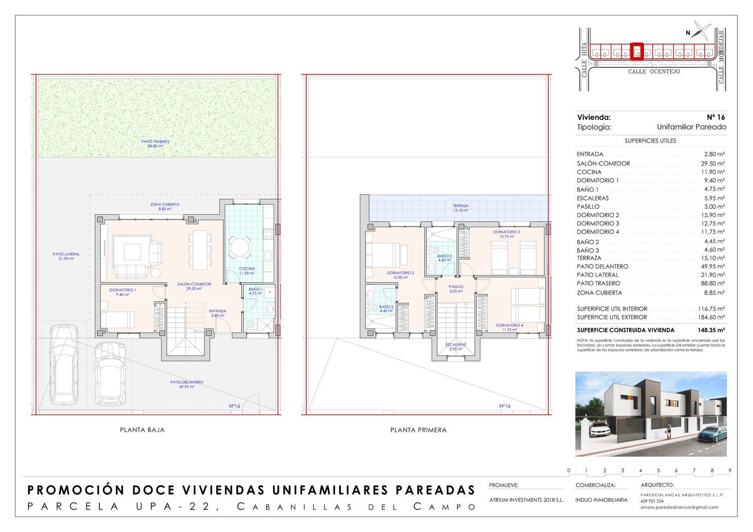 Induo inmobiliaria presenta Atrium Cabanillas. Fantástica promoción de 12 chalets pareados en la mejor zona de Cabanillas del Campo. Viviendas de cuatro dormitorios y tres baños con un altísimo nivel de confort y altas calidades, con suelo radiante y refrescante por aerotermia en suelos de gres de imitación madera. Espectaculares parcelas de mas de 250m2 en las que la superficie útil de las mismas es de mas de 160m2, donde podrás disfrutar de un amplio jardín. La separación de las parcelas entre vecinos será mediante muro, con una altura de 2,50m, dando una gran privacidad.La situación de la parcela es inmejorable. Delante de la misma no se podrá construir, convirtiendo estas parcelas en una hilera que se encuentra aislada. Junto a la misma, podemos encontrar el nuevo parque municipal y servicios muy próximos, como colegio, supermercado, farmacia y centro de salud, en una zona completamente consolidada.No deje pasar esta gran oportunidad y llámenos para solicitar mas información.