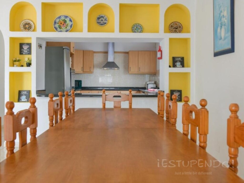 La villa consta de 8 dormitorios , 5 baños( 2 en suite y uno con hidromasaje) , destruidos en casa principal con 6 dormitorios y 3 baños salo-comedor con vistas a la piscina y mar, cocina amueblada de gran tamaño equipada con lavavajillas, microondas, lavadora, nevera y horno, terraza, jardin , sala de juegos trastero y zona de aparcamiento.