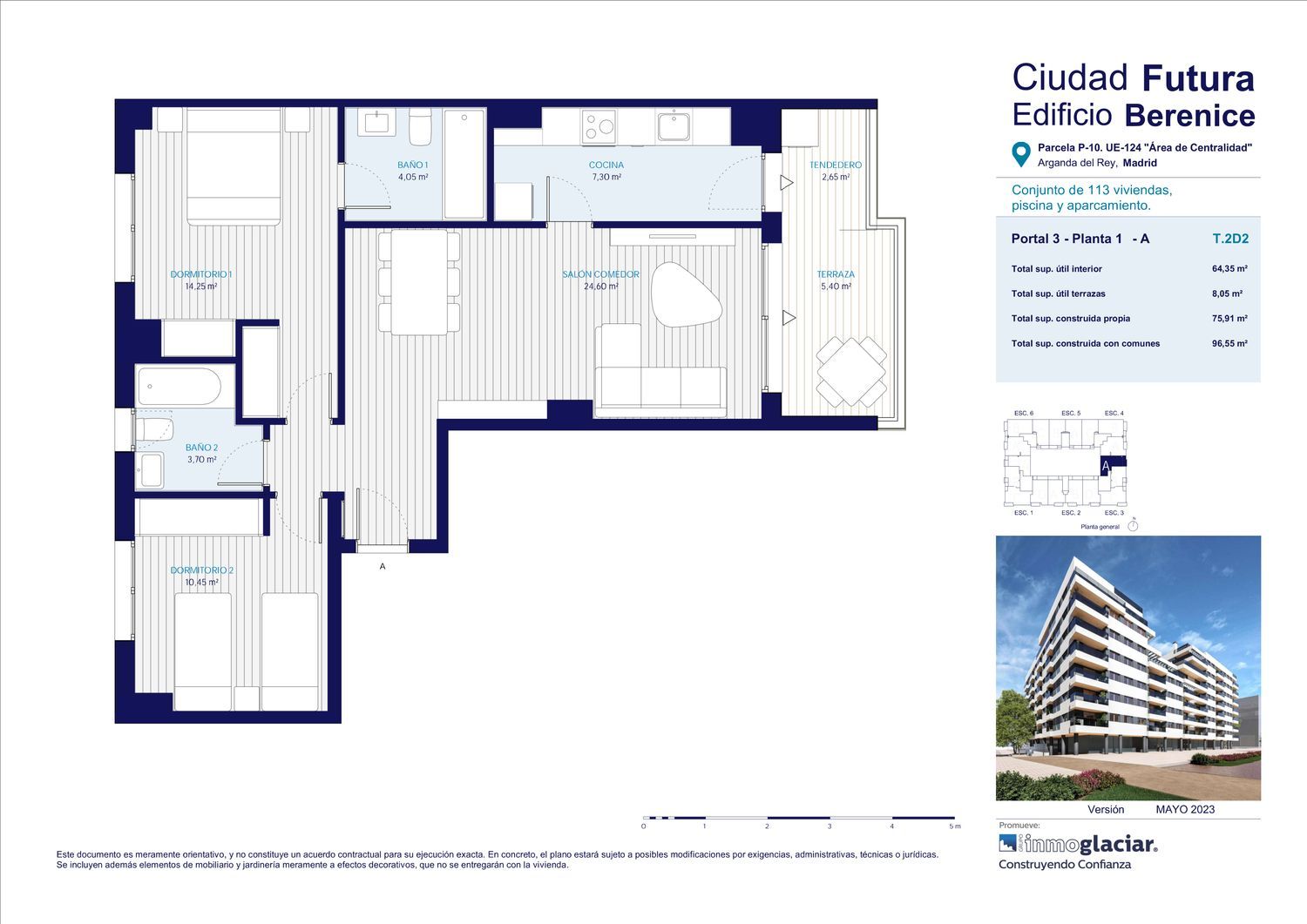 ResidencialCiudad FuturaEdificio BereniceArganda del Rey (Madrid)Inmoglaciar desarrolla la nueva fase de promoción de pisos de Obra nueva en venta, Residencial Ciudad Futura – Edificio Berenice, para que encuentres la vivienda que mejor se adapta a ti.Con una ubicación privilegiada, Inmoglaciar proyecta una promoción de viviendas Residencial Ciudad Futura- Edificio Berenice que unirá el centro de la ciudad con una nueva zona llena de comodidades: comercios, centros de Salud, colegios e institutos y junto a la Ciudad Deportiva, nacida para convertirse en el espacio residencial de referencia de la ciudad.Tu hogar en Arganda del ReySabemos que comprar una vivienda es una de las decisiones más importantes de nuestra vida, y queremos ayudarte. Vivir en la promoción de viviendas de Obra Nueva Residencial Ciudad Futura - Edificio Berenice significa comodidad, descanso, conectar la tranquilidad y la familia… TU FAMILIA, lo que verdaderamente importa.Situado en Arganda del Rey, en la Calle del Tren de Arganda s/n, donde tendrás todo lo que necesitas al alcance de tu mano. A tan solo 30 minutos del centro de Madrid.Excelente comunicación, a escasos metros de la estación de Metro "Arganda del Rey" (línea 9 de Metro de Madrid), con acceso a Madrid por la A3 y red de autobuses urbanos e interurbanos, que conectan directamente con Madrid capital y el resto de las localidades del entorno como Rivas, Coslada, etc.¿Cómo será tu hogar?El Edificio Berenice es la Fase III de Residencial Ciudad Futura. Un residencial de 113 viviendas de obra nueva de 2, 3 y 4 dormitorios, todas ellas con terraza, además de 1 o 2* plazas de garaje y trastero en el mismo edificio con preinstalación de recarga de vehículos eléctricos.Residencial Ciudad Futura – Edificio Berenice cuenta con excelentes materiales y acabados interiores de primera calidad. Todas las viviendas se encuentran equipadas con cocina amueblada completa con armarios altos y bajos y provista de electrodomésticos como horno, campana y placa de inducción de tres zonas • Instalación centralizada completa de aerotermia para calefacción y climatización mediante suelo radiante-refrescante y apoyo de Split en salón • salón y dormitorios solados con pavimento laminado de alta calidad • Terraza solada con baldosa de gres antideslizante. Además, podrás elegir entre varias opciones de personalización de su vivienda en relación a los acabados en cocinas y baños y pavimento general de vivienda.En sus zonas comunes podrás disfrutar de un área ajardinada, piscina comunitaria y un local multiusos, pensados para compartir en familia.Ven a conocer nuestro proyecto de pensado y desarrollado para TIEs el momento de estrenar tu nuevo hogar en nuestra promoción Residencial Ciudad Futura-Edificio Berenice en Arganda del Rey. El que siempre has deseado.Visite nuestro punto de venta y conoce nuestro piso piloto de Residencial Ciudad Futura – Edificio Berenice, donde encontrará más información acerca de la promoción de Inmoglaciar de viviendas de Obra nueva en Arganda del Rey.Descubre con Inmoglaciar tu vivienda de Obra Nueva, TU VIVIENDA DE CONFIANZA.*Los precios publicados incluyen 1 garaje y trastero. En los casos en que las viviendas lleven vinculados 2 garajes, el precio se incrementará en el precio correspondiente.