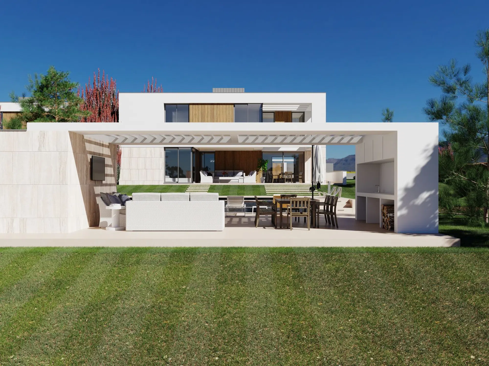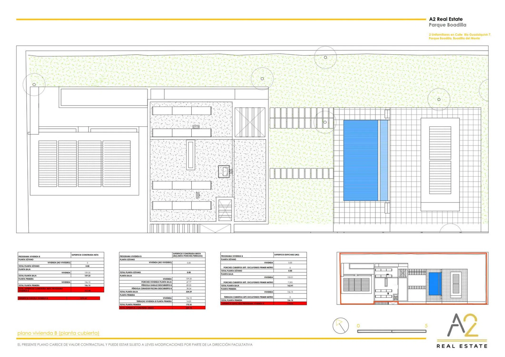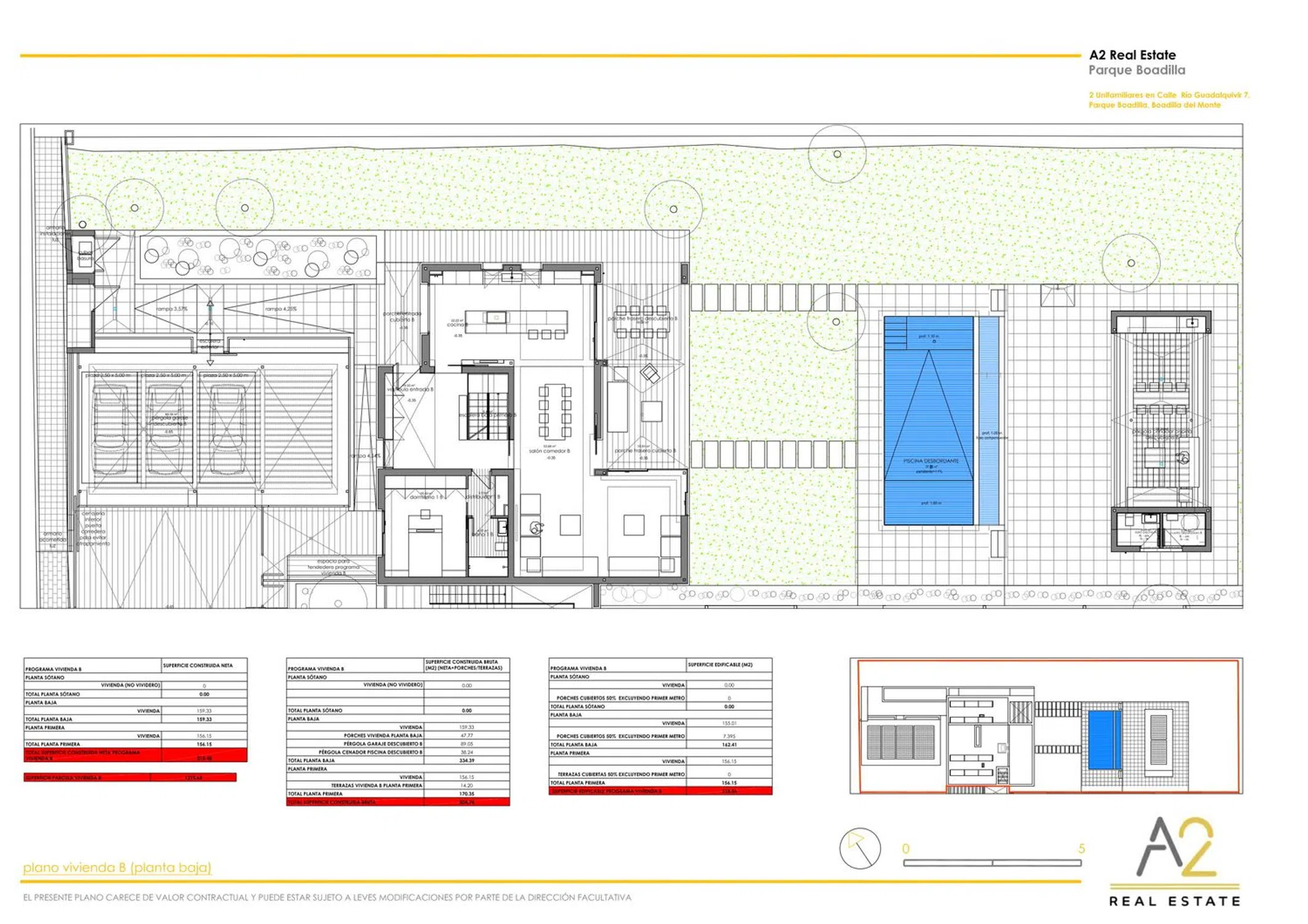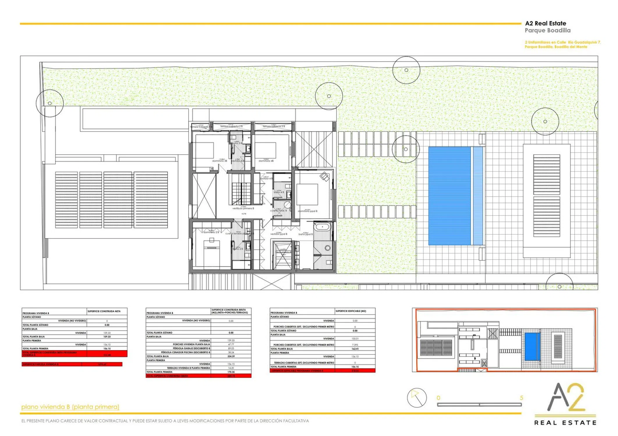 A2 Real Estate presenta esta espectacular vivienda de obra nueva a estrenar, diseñada para disfrutar de la luz natural y equipada con las mejores calidades (suelo radiante-refrescante, aerotermia, fotovoltaicas, fachada ventilada en mármol travertino, etc…) Con 504,74 m² construidos brutos sobre parcela de 1.275 m², la propiedad se distribuye en dos plantas: Planta baja •Acceso por porche cubierto. •Vestíbulo de entrada a doble altura con armario de cortesía y escalera abierta. •Salón-comedor con tres ambientes y salida directa al gran porche trasero (cubierto y descubierto) con vistas al jardín y piscina. •Cocina-office con isla central y zona de barra, integrada visualmente con el comedor. •Distribuidor con armario empotrado, baño completo con ducha y dormitorio con armario empotrado. Planta primera •Vestíbulo abierto a la doble altura del acceso. •Cuarto de instalaciones. •Tres dormitorios en suite, todos con vestidor y baño completo (dos con ducha y uno con bañera). Dos de ellos tienen terraza privada. •Dormitorio principal en suite con gran vestidor iluminado por patio descubierto, baño de diseño con ducha de obra y bañera exenta, con vistas al jardín a través de un gran ventanal orientado al porche trasero en doble altura Exterior y extras •Garaje exterior con pérgola para tres vehículos. •Piscina privada desbordante, con escalones de obra, banco interior, zona de playa para tumbonas, solárium con ducha exterior y pérgola/cenador junto a la piscina. •Acabados premium: suelo radiante refrescante con aerotermia, iluminación de diseño, paneles fotovoltaicos en cubierta, puertas motorizadas, fachada ventilada en mármol travertino y máxima eficiencia energética. Nota: OBRAS EN EJECUCIÓN FECHA PREVISTA FIN OBRAS SEGUNDO TRIMESTRE 2026 FECHA PREVISTA ENTREGA TERCER TRIMESTRE 2026 ABSTENERSE AGENCIAS. Esta información no tiene carácter contractual.