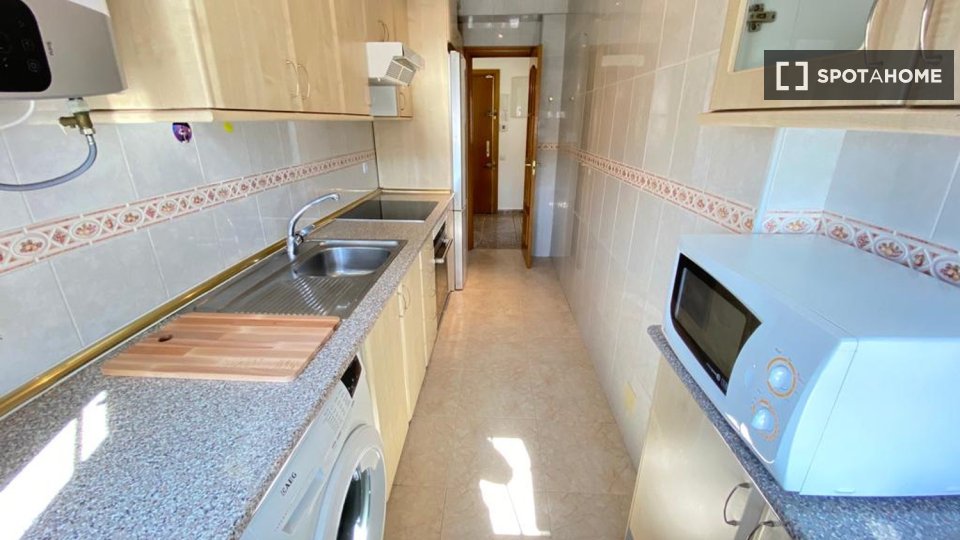 En cuanto a las zonas comunes, la vivienda cuenta con una amplia cocina, amueblada y equipada con todos los electrodomésticos (frigorífico, vitrocerámica, lavadora, caldera/calentador eléctrico, microondas) y el menaje necesario (cacerolas, sartenes, cubertería y cristalería). Asimismo, la propiedad cuenta con un Baño completo, con plato de ducha.