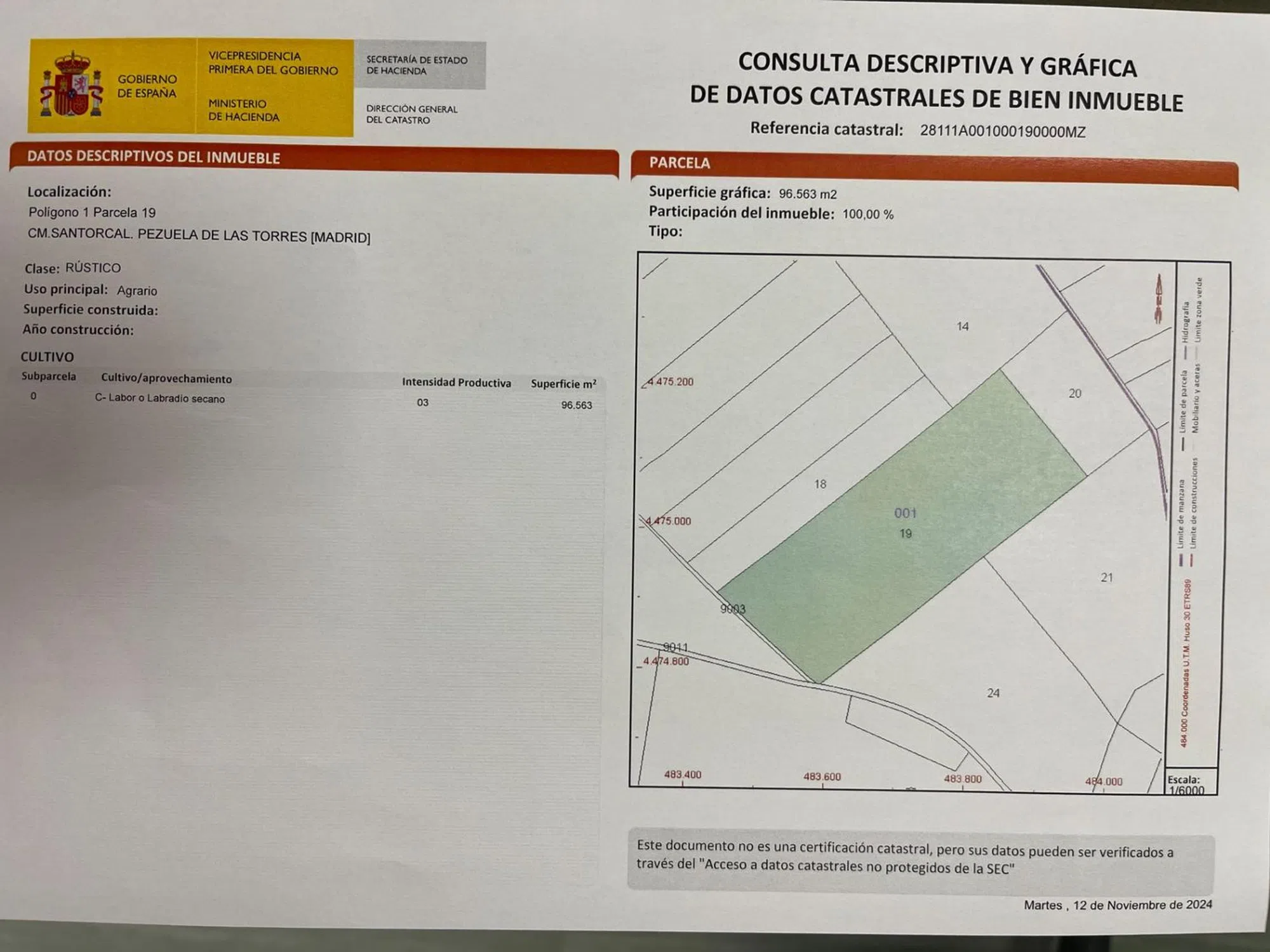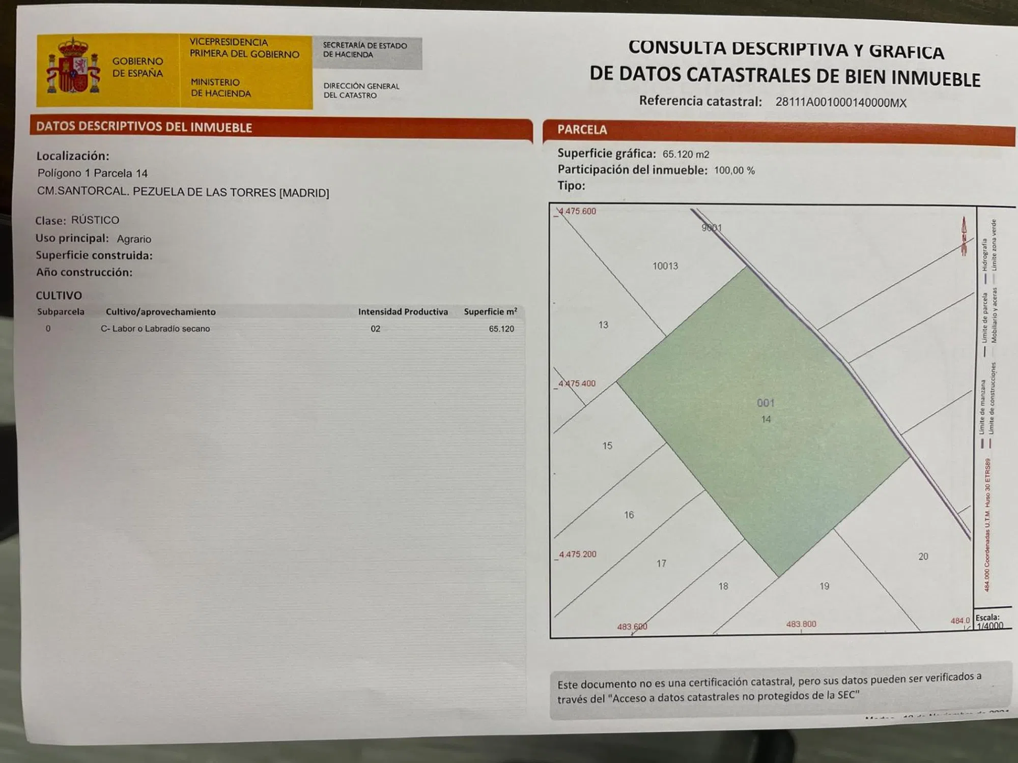 EXCLUSIVAS ALCALA tiene a la VENTA terreno rustico, el PEZUELA DE LAS TORRES (Comunidad de Madrid), se corresponde con 3 Parcela dentro del Polígono 1, Parcelas 14, 19 y 20. Clase Rustico Agrario. Cultivo y aprovechamiento: - Poligono1. Parcela 14: Cultivo Labor o Labradío secano Intensidad 02 superficie: 65.120m2. - Poligono1. Parcela 19: Cultivo Labor o Labradío secano Intensidad 03 superficie: 96563m2. - Poligono1. Parcela 20: Cultivo Labor o Labradío secano Intensidad 02 superficie: 24.181m2. EL TOTAL ES DE 185.864m2. EXCLUSIVAS ALCALA, con una dilatada experiencia de más de 30 años le acompañara en todo el proceso de la Compraventa; disponemos de departamento Jurídico y Financiero. Somos API (Agentes de la Propiedad Inmobiliaria). Este anuncio no es vinculante y puede contener errores. Se muestra a titulo informativo y no es contractual. En los precios de venta no están incluidos impuestos legales ni gastos de escrituración.