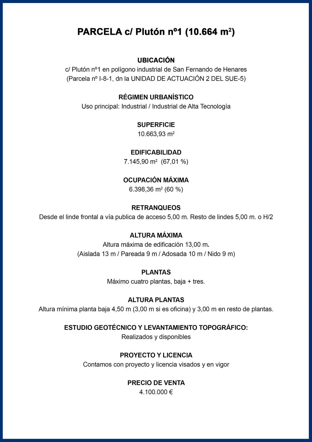 PROPIETARIOS DIRECTAMENTE, presentamos una parcela industrial excepcional en la mejor zona industrial de San Fernando de Henares. Con una superficie total de 10.664 m². Situada a 200m del centro logístico de Amazon, esta propiedad ofrece una edificabilidad del 67%, permitiendo construir hasta 7.146 m² y con una ocupación máxima del 60% (6.398 m2) Altura máxima de 13 m con hasta cuatro plantas (baja + tres) El terreno cuenta con todas las facilidades urbanísticas necesarias: acceso vía urbana, alcantarillado, gas natural, alumbrado público y aceras, garantizando así una infraestructura completa y moderna. Además, ya se ha realizado el levantamiento topográfico y contamos con un estupendo PROYECTO Y LICENCIA que ponemos libremente a su disposición y sin duda será una excelente ayuda para agilizar enormemente los tiempos de su nueva implantación. Libre de cargas y disponible para el primer optante, esta nueva parcela es una oportunidad irrepetible en la zona, con un precio cerrado de venta de 4.100. 000 € (sus óptimas características no nos permitirían ningún ajuste). Directamente desde la propiedad sin gastos de intermediación. Su proximidad a solo 3 km del núcleo urbano más cercano y comunicado con la M-45 / A-2 y M-206 le añade su valor estratégico, haciendo de esta propiedad una inversión ideal para empresas que busquen ubicar su sede y establecerse en uno de los entornos industriales más importantes del tejido industrial Nacional. Contacte directamente para solicitar información adicional y les enviaremos el dossier completo. Quedamos pendientes de sus noticias, gracias.
