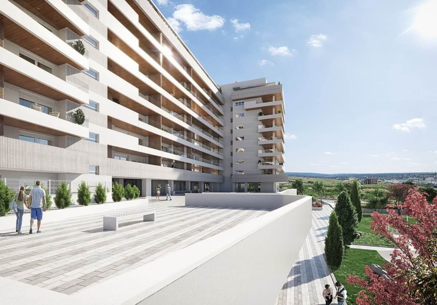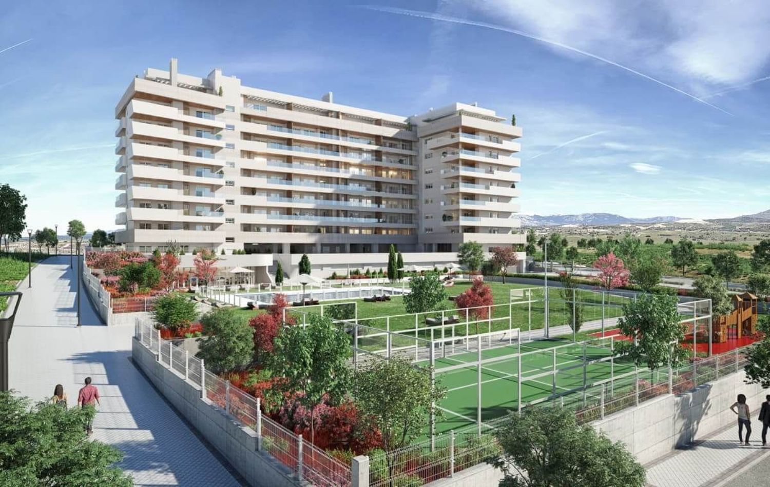 FCC Real Estate promueve pisos de obra nueva de 2, 3 y 4 dormitorios, bajos con jardín y áticos en la localidad madrileña de Tres Cantos. es un conjunto residencial ubicado en la zona de Nuevo Tres Cantos. Disponen de 2 plazas de parking y trastero incluidos. En el interior de nuestros pisos nuevos en Tres Cantos, destaca la amplitud y óptima distribución de sus estancias. Todos los pisos disponen de amplias terrazas desde las que disfrutar de vistas espectaculares al aire libre. Las zonas comunes disponen de piscina infinity de depuración salina, pádel, y área de juegos infantiles para el ocio de los más pequeños.