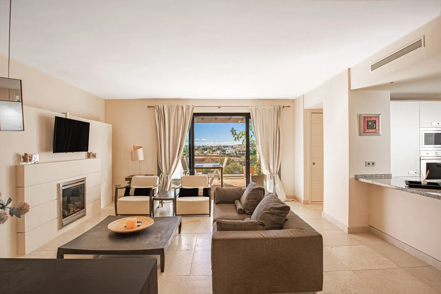 **Charming Two-Bedroom Apartment in Los Flamingos, Benahavis** Discover the epitome of luxury living with this spacious and light-filled two-bedroom apartment located in the prestigious Los Flamingos Golf Resort. Offering panoramic views of the golf course, mountains, and a glimpse of the sea, this frontline golf property overlooks the 5th Hole towards the renowned 6-star Villa Padierna Hotel. Immaculately maintained by the same owner since 2005, it has been used only for occasional family holidays, ensuring it remains in pristine condition. The apartment boasts an inviting entrance hall leading to a generous living room with a cozy fireplace and an open-plan kitchen, perfect for entertaining. Both double bedrooms feature en-suite bathrooms and provide access to terraces through separate patio doors. Enjoy phenomenal southwest-facing views from the terrace, ideal for soaking up the sun or enjoying an al fresco meal. Set within a secure complex with electronic gates and cameras, residents can enjoy communal parking, two stunning pools, and beautifully landscaped gardens. The property includes one parking space and storage, with furniture included in the price. With 150 m² of living space, air conditioning, and an energy efficiency class D rating, this apartment is a perfect blend of comfort and style. Don't miss the chance to own this exquisite home in a prime location!