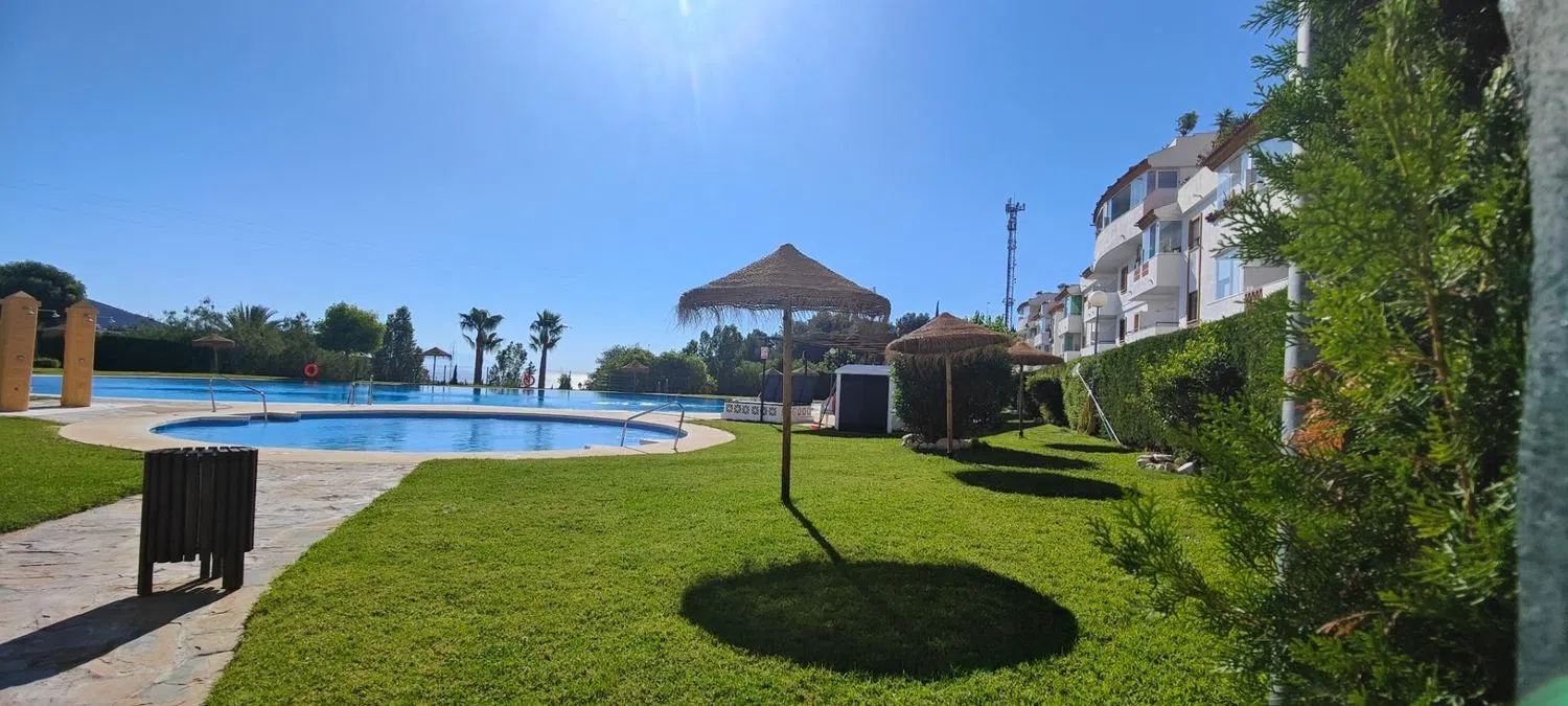 Luminoso y espacioso bajo. Situado en urbanización con piscinas de agua salada, pista de tenis, zonas verdes y de recreación infantil. Se distribuye en recibidor, cocina independiente totalmente equipada, patio interior. Dos dormitorios con armarios empotrados, un cómodo baño con doble plato de ducha y amplio salón con acceso a la terraza en L. Además cuenta con dos plazas de garaje.