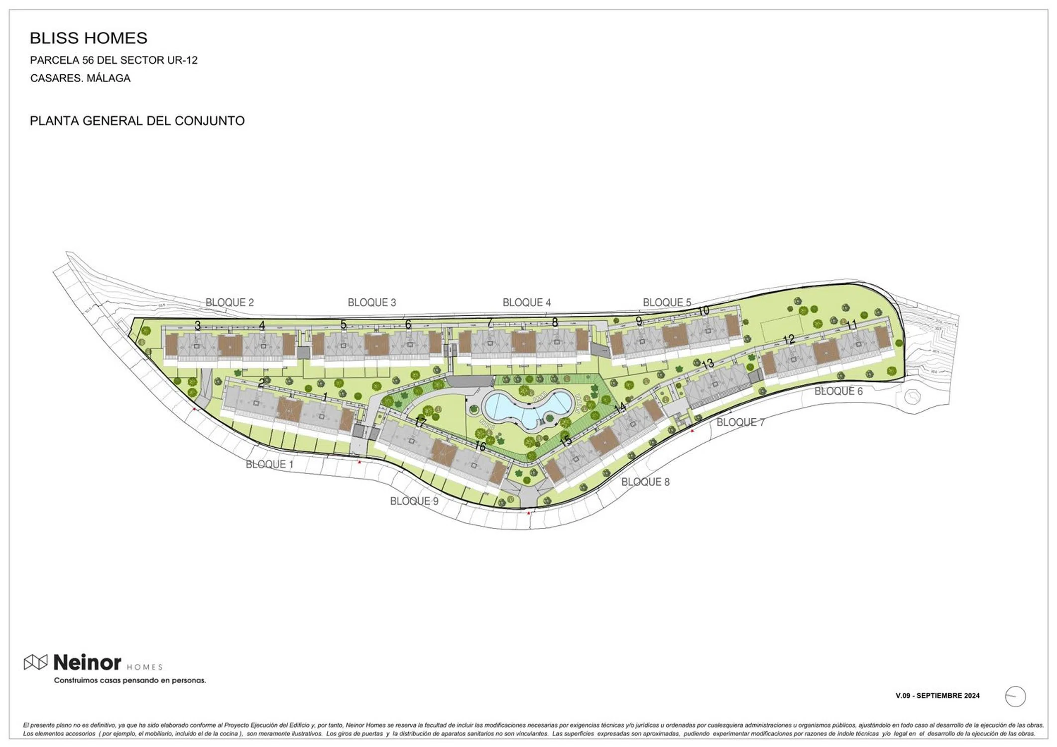 El conjunto residencial de Bliss Homes dispone de un total de 134 viviendas de 2, 3 y 4 dormitorios distribuidas en 9 bloques, cuyo diseño vanguardista y moderno se funde en el campo de golf colindante. Su orientación oeste-suroeste proporciona el máximo aprovechamiento de la luz natural y unas vistas que permiten contemplar el paisaje natural que lo rodea, algunas de ellas con vistas al mar. Los espacios comunes de Bliss Homes han sido pensados y diseñados teniendo en cuenta el compromiso de sostenibilidad, con una gran variedad de equipamientos y ofreciendo instalaciones de máxima calidad. El conjunto residencial, alzado en 2 y 3 plantas, cuenta con unas agradables zonas comunes que incluyen jardines, piscina y gimnasio. Además, dispone de 166 aparcamientos y 134 trasteros en la planta sótano de la promoción. "Garaje y trastero incluido en el precio". ]]>.