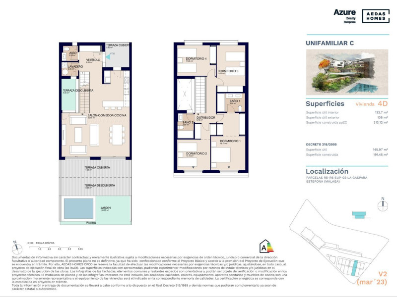 Una urbanización exclusiva de 84 viviendas de lujo con amplios espacios interiores, grandes terrazas, vistas espectaculares, áreas comunitarias, piscina y zona club. A muy pocos metros de la playa y rodeado de zonas naturales. Azure se encuentra en una localización privilegiada, muy cerca de tiendas y restaurantes y a cinco minutos (4 km) del Puerto Deportivo de Estepona. Tiene fácil acceso a la carretera A7 que conecta facilmente con los Puertos de Sotogrande y Puerto Banús en Marbella. Se encuentra conectado con dos aeropuertos internacionales, a tan solo 50 minutos del Aeropuerto de Málaga y 45 minutos del Aeropuerto de Gibraltar.Gimnasio, Jardines, PiscinasViviendas Plurifamiliares y Viviendas Unifamiliares AdosadasTodos los precios incluyen IVA.Punto de venta: Parcela R1 del SUP-02. La Gaspara 0, Estepona, MálagaHorario de atenciónLunes a viernes de 10:00 am a 18:00 pm, sábados de 10:00 am a 14:00 pm.