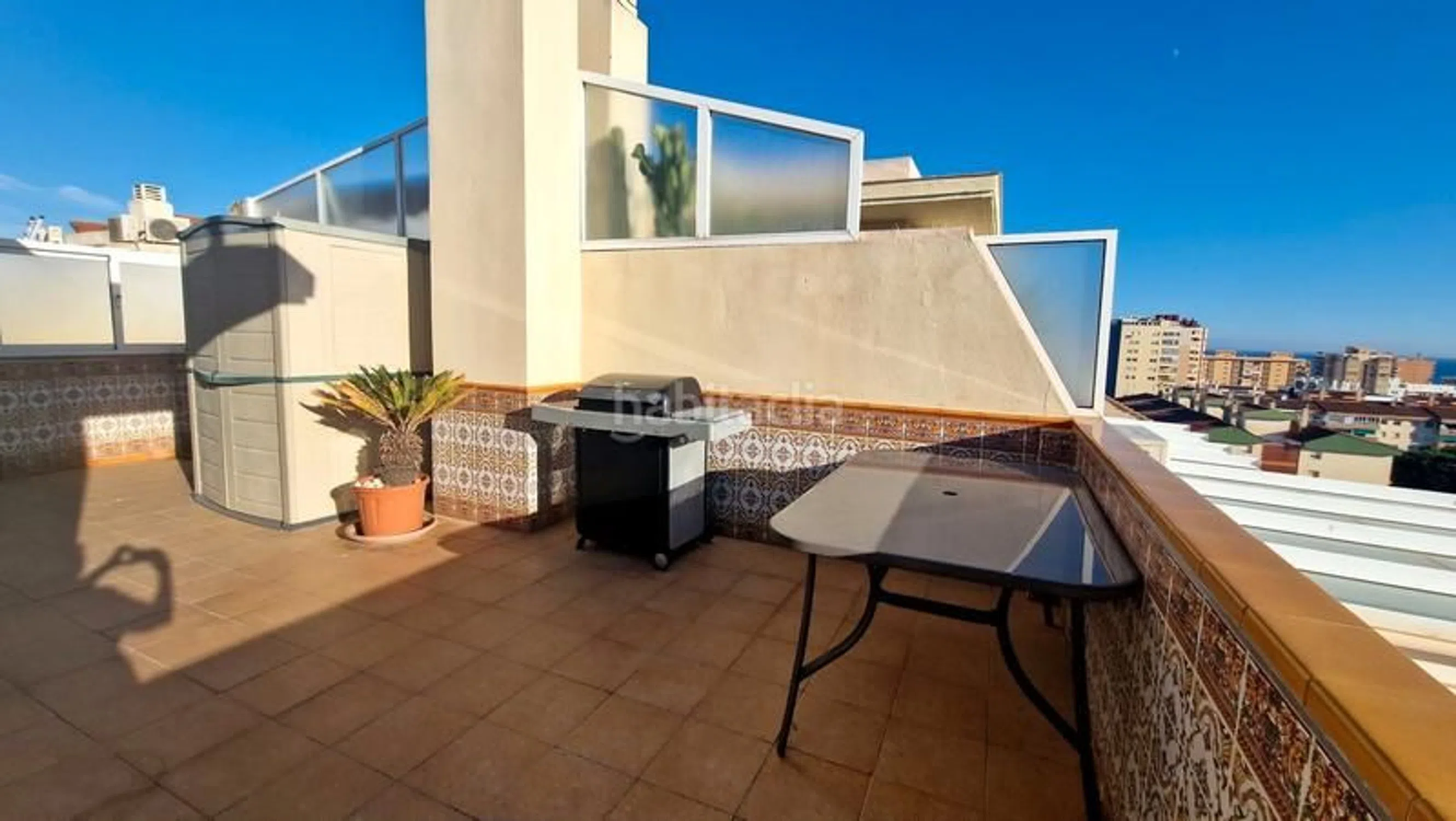 Magnífico y amplio ático dúplex con ascensor en venta en Fuengirola con vistas panorámicas. Con una superficie construida de 125 m2. Vivienda 95 m2 y terrazas y solárium 62 m2. Año de construcción 2001. Orientación Oeste. La vivienda está situada en 2 niveles. En la planta principal: Tenemos un vestíbulo, cocina totalmente equipada con lavadero, salón comedor, 2 dormitorios (uno de ellos con acceso a la terraza y un baño. En la planta superior hay 2 dormitorios y 1 baño, y una gran terraza envolvente con vistas al mar, sol todo el día y barbacoa con zona de comedor. Hay una escalera de caracol que conduce al piso de arriba con solárium. Armarios empotrados, suelos de mármol, aire acondicionado, doble cristal tipo Climalit, La propiedad viene con una amplia plaza de aparcamiento incluida en el precio. Está ubicado en una urbanización cerrada con piscina, jardines, acceso para personas con movilidad reducida, cerca de todos los servicios municipales, tiendas, supermercados, farmacia, colegios, transporte, ambulatorio, etc. A poca distancia de la playa. Visita recomendada.