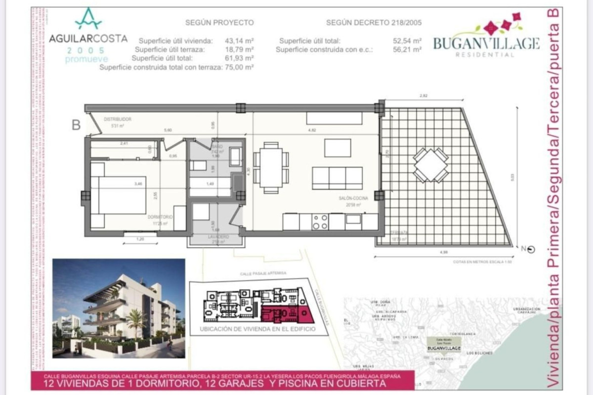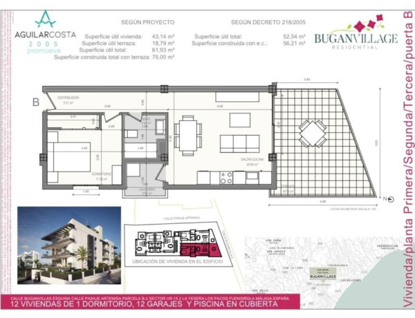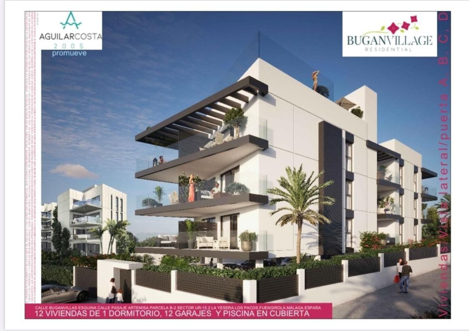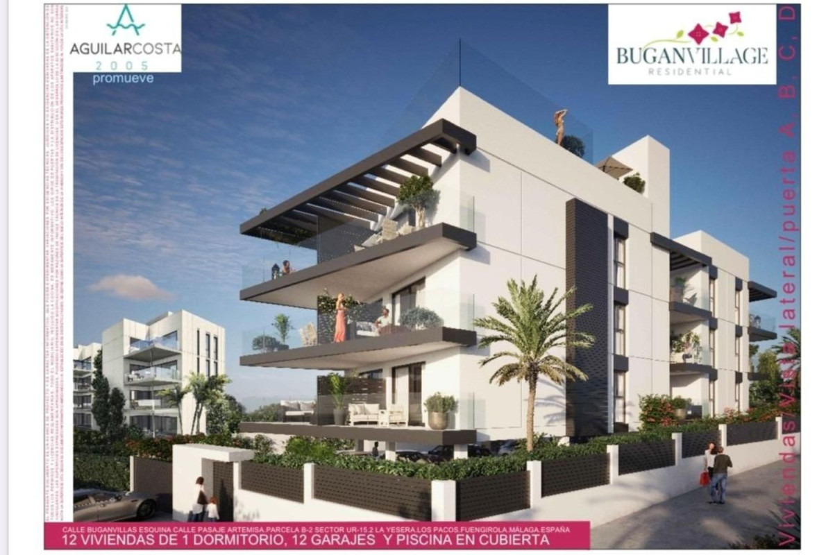 El edificio residencial BUGANVILLAGE contará con un total de 12 viviendas de 1 dormitorio, con amplias terrazas en todas ellas y piscina con solarium en planta de cubierta, además contará con un espacio comunitario en dicha cubierta para el uso y disfrute de la comunidad. Las viviendas de nuestro nuevo residencial cuentan con la mejor relación calidad-precio de la zona y se encuentran equipadas con todo lo necesario para hacerlas de primer nivel. Dotado de una urbanización privada con zonas comunes en recinto cerrado y lugares de descanso, piscina y aparcamientos en planta baja para que cada vivienda disponga de una plaza de aparcamiento doble. BUGANVILLAGE se ubica en el barrio de Los Pacos (Fuengirola) encontrándose estratégicamente situado en una zona residencial muy próxima al centro de la ciudad y a 20 min en Málaga capital y Marbella. Asi mismo cuenta con todo tipo de servicios como centros sanitarios, colegios, campos de golf, pádel, autovía, etc.. .Para llegar a la playa se puede acceder dando un pequeño paseo o a escasos 5min en coche, llegando al Paseo Marítimo de Fuengirola, haciéndola una gran oportunidad de vivir de forma permanente o tener una segunda residencia en la Costa del Sol.