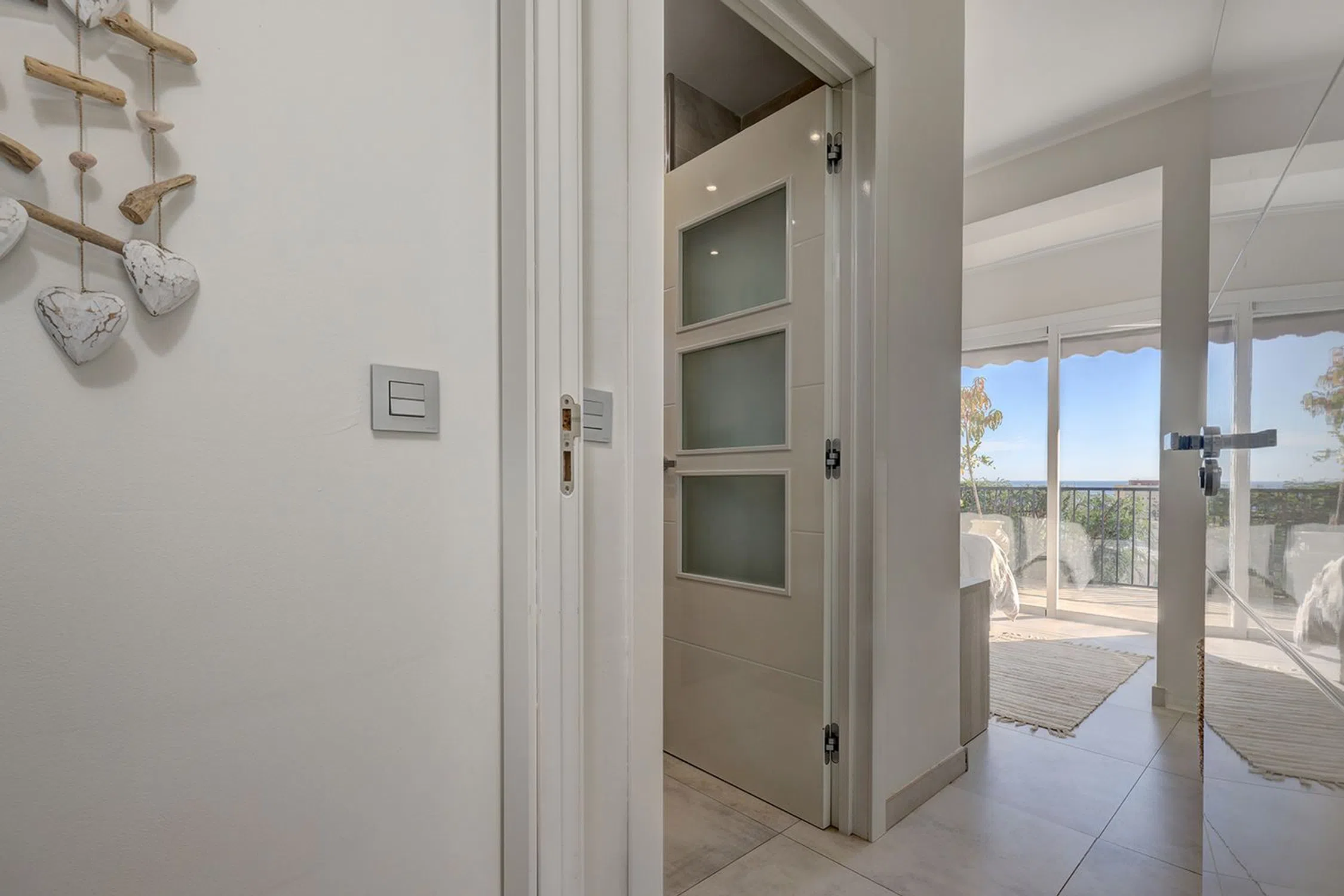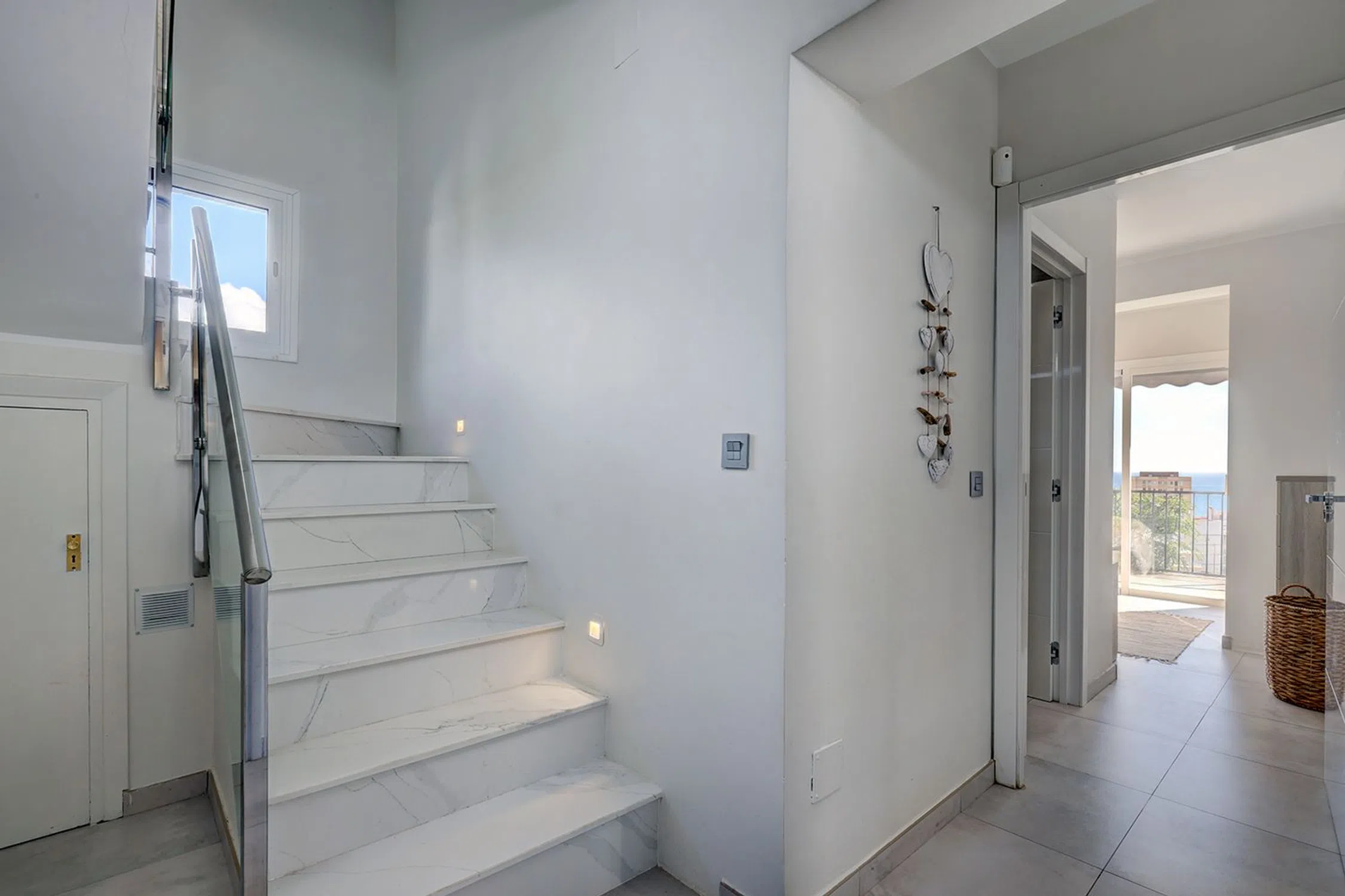 La villa está cuidadosamente distribuida en dos niveles. En el nivel de entrada, encontrarás una amplia y luminosa zona de estar, llena de luz natural y con impresionantes vistas al mar. Este espacio es ideal para recibir invitados o disfrutar de tranquilas veladas, con calefacción por suelo radiante para mayor comodidad. También hay un aseo para invitados en este nivel.