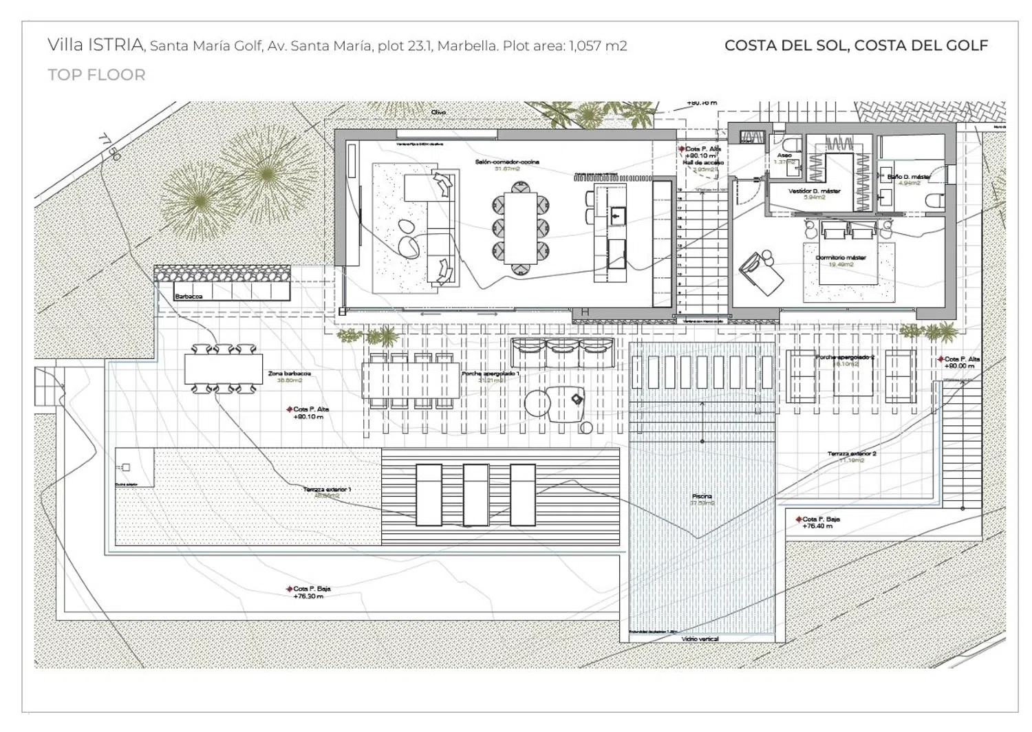 MODERNA VILLA DE 4 DORMITORIOS EN SANTA MARIA GOLF, ELVIRIA, MARBELLA: 1.855. 000€ Situada en Santa Maria Golf, Elviria, Marbella Este, esta moderna villa con Vistas al Mar desde la primera planta está rodeada de un valle con densa vegetación compuesta por pinos, encinas, alcornoques y acebuches. Esta villa está situada a pocos metros del Club de Golf Santa María y a pocos minutos en coche del Centro Comercial ELVIRIA, un club de tenis, el puerto deportivo, clubes de playa, tiendas y servicios. Esta villa de estilo moderno con toques andaluces ha sido cuidadosamente diseñada para disfrutar de hermosas vistas al mar desde la primera planta. 4 dormitorios, 3 baños, 1 aseo de invitados Parcela: 1.057 m² Superficie construida: 233,76 m² Superficie habitable: 193,62 m² Terraza exterior y porche cubierto con pérgola: 430,46 m² Vistas panorámicas al mar desde la primera planta Piscina infinita Zona de barbacoa Zona ajardinada 4 dormitorios 3 baños 1 aseo Aparcamiento para 2 vehículos PRECIO: 1.855. 000 Impuestos: € 169.750 TOTAL: 2.024. 750 DEPÓSITO DE RESERVA: 60.000 COMPRA DE PARCELA: 472.000 FIRMA DEL CONTRATO: 259.000 EUROS AL INICIO DEL MOVIMIENTO DE TIERRAS: 172.900 EUROS FINALIZACIÓN DE LOS TRABAJOS DE CIMENTACIÓN DE LA CASA: 199.500 EUROS FINALIZACIÓN DE LOS TRABAJOS DE ESTRUCTURA DE LA CASA: 199.500 EUROS FINALIZACIÓN DEL CERRAMIENTO DE LAS PAREDES EXTERIORES E INTERIORES: 266.000 EUROS CERTIFICADO DEL ARQUITECTO CUANDO SE HAYA COMPLETADO EL 80%: 199.500 EUROS CERTIFICADO DEL ARQUITECTO POR FINALIZACIÓN DE LAS OBRAS: 26.600 EUROS * los Importes se incrementarán con los impuestos correspondientes.