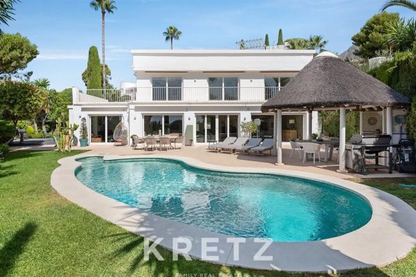 Ubicada en una de las comunidades más exclusivas de la Milla de Oro, esta elegante villa de 415 m² ofrece vistas al mar desde ambos niveles y una privacidad total. Distribuida en una planta principal amplia y luminosa, cuenta con un gran salón-comedor con acceso directo a la terraza, cocina Gaggenau totalmente equipada, lavandería y cuatro dormitorios en suite, incluyendo una suite principal con vestidor y terraza privada. El exterior es ideal para disfrutar del estilo de vida mediterráneo: jardín paisajístico, piscina soleada, encantador pool house y un altillo con vistas panorámicas al mar y la montaña. Una propiedad única, segura y luminosa, a pocos minutos del centro de Marbella y de sus mejores playas.