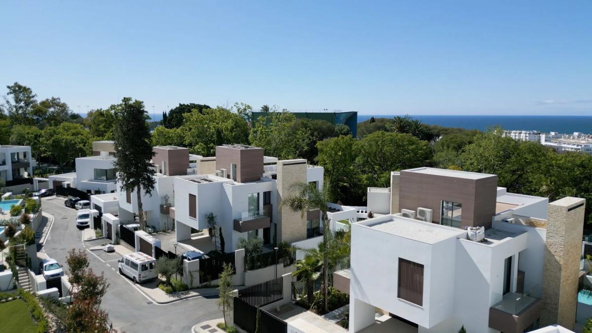 Villa de lujo contemporáneo en comunidad privada junto a la Milla de Oro Elegante villa de diseño moderno ubicada en una exclusiva urbanización cerrada de solo 15 viviendas, con seguridad 24 horas y servicio de conserjería. A pasos del mar y cerca del casco antiguo, esta propiedad de 885 m² de parcela y 730 m² construidos ofrece 4 dormitorios, 5 baños, amplias terrazas y una azotea con vistas al mar. Incluye ascensor privado, cine, sauna, hammam, calefacción por suelo radiante y cocina de alta gama. Garaje cerrado para 2 vehículos y 2 plazas adicionales. Jardín y piscina mantenidos por la comunidad. Lista para entrar a vivir.