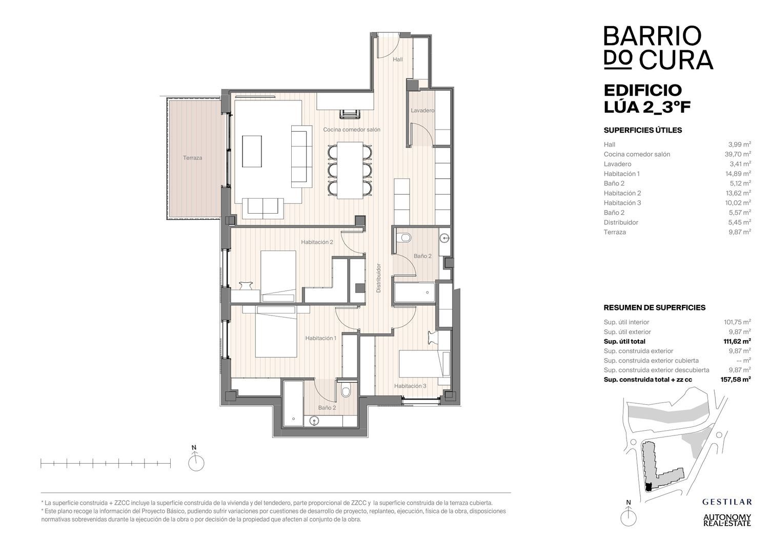 Barrio do Cura es un proyecto residencial y de regeneración urbana que gracias a su carácter innovador cambiará Vigo para siempre. Situado en pleno corazón de Vigo, constituye uno de los desarrollos más importantes de la zona que, además, pone en valor la revitalización de un área estratégica de la ciudad a través del diseño, la sostenibilidad y la eficiencia energética.El proyecto se compone por 3 edificios de viviendas que poseen diferentes configuraciones y alturas: Ardora, Lúa y Estrela.EDIFICIO ESTRELAEl edificio cuenta con 40 viviendas de 1 a 4 dormitorios distribuidas en 7 plantas y dispuestas en una estructura en forma de “Estrella” que bordea un lateral de la plaza y que otorga el nombre al edificio. Todas las viviendas cuentan con amplias terrazas.La entrada posee una singularidad única: el uso de la antigua fachada del asilo de Pi y Margall, elemento protegido de Vigo, que ha sido perfectamente integrado.EDIFICIO LÚAEl edificio Lúa ofrece 118 viviendas de 1 a 4 dormitorios y se ha proyectado en forma de “L” con dos brazos de 9 y 6 alturas (desde la plaza) orientados hacia la Ría de Vigo y a la Península de Morrazo.EDIFICIO ARDORAEste edificio consta de 107 viviendas de 1 a 4 dormitorios, todas con amplias terrazas. Ofrece una visual estructural en movimiento, donde más de la mitad de sus viviendas tienen vistas de la Ría, y queda envuelto en sus dos caras por un parque urbano.Las áreas comunes de los edificios, situadas en el edificio Lúa, son: gimnasio, sala polivalente, pistas de pádel, piscina climatizada, zona infantil-recreativa, espacio cardio protegido, buzones inteligentes y zona para estacionamiento de bicicletas.Barrio do Cura contempla un espacio público con una plaza mirador que constituye un innovador ámbito comercial. También cuenta con un nuevo parque urbano, sirviendo de pulmón en pleno corazón de Vigo.Barrio do Cura cuenta con la tecnología y materiales más actuales en materia de sostenibilidad y ahorro energético, proporcionándole una de las mas altas calificaciones energéticas: “A”.El proyecto aplica estrategias de movilidad activa, maximización del capital natural y preservación de la calidad ambiental, aspectos que serán cuantificados y monitorizados por medio del proceso de certificación LEED ND Platinum, siendo el primer desarrollo urbano en España en optar a esta categoría del sello.