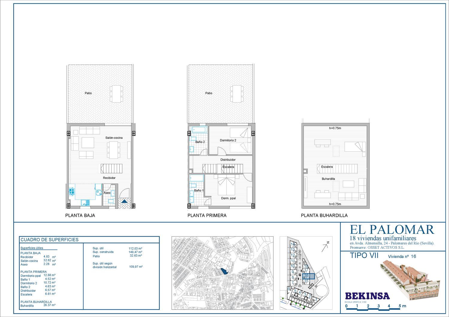 EL PALOMARLuminosas casas adosadas 2 y 3 dormitorios, con dos baños, garaje, amplios trasteros, y espacios comunes, en pleno corazón de Palomares. Diseñadas pensando en su comodidad, disponen de instalación de aire acondicionado frio/calor, suelos de tarima flotante en zonas nobles y gres en zonas húmedas, ventanas de aluminio con doble acristalamiento, y producción de agua caliente mediante un sistema eficiente como es la aerotermia Su ubicación a 350 m del ayuntamiento, frente a una parada de las líneas de autobús que conectan Palomares con Sevilla, así como con todos los servicios a su alcance, colegio, supermercado, comercios, veterinario, entidad financiera, restaurantes, papelerías, etc…. hacen de El Palomar el lugar idóneo para crear su hogar.Las casas de dos plantas disponen en la planta primera de amplias terrazas de más de 50 m2 desde la que disfrutar de unas fantásticas vistas hacia la rivera del Guadalquivir, mientras que las casas con Buhardilla, disponen de patios en planta baja desde 16 hasta 63 m2.*IVA no incluido en los precios publicados. Los precios publicados incluyen un garaje y un trastero cuyo valor sueltos sería de 15.100 €. Las imágenes son meramente ilustrativas habiéndose realizado en base a un anteproyecto, encontrándose por ello, sujetas a modificaciones por exigencias técnicas, jurídicas o comerciales de la promoción. Por ello, en caso de contradicción entre las imágenes aquí reflejadas con la información recogida en los documentos contractuales entregados al cliente, prevalecerán siempre éstos últimos. Toda la información y entrega de la documentación de acuerdo con lo establecido en el Decreto 218/05, será facilitado al cliente en nuestra oficina de información de la promoción.