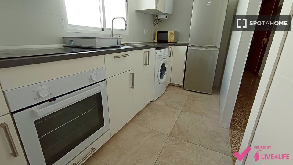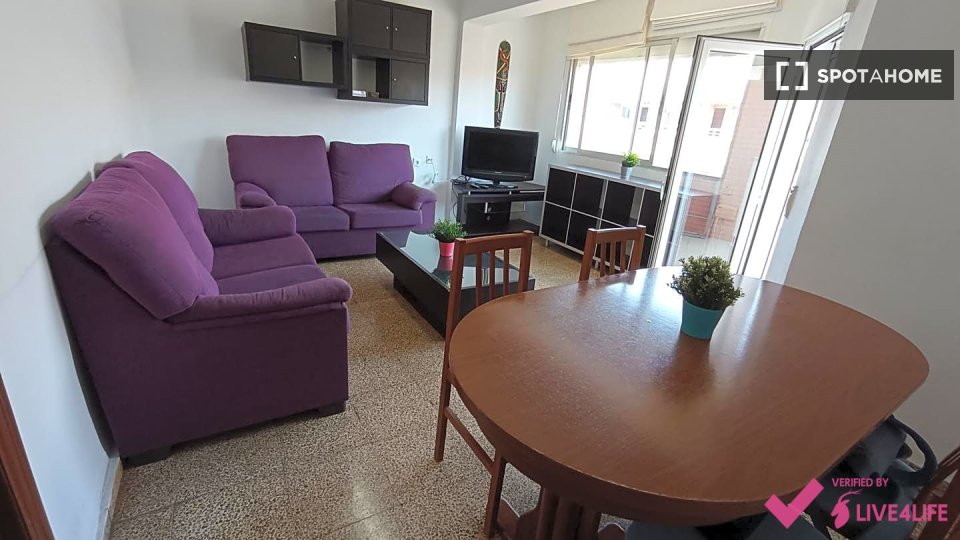 Habitación disponible en un apartamento compartido de 4 habitaciones, completamente amueblado. El apartamento se encuentra en La Vega Baixa, Valencia. Ofrece cocina totalmente equipada con horno. Hay lavadora común disponible para la colada. Tenga en cuenta que no se admiten mascotas ni fumar en este alojamiento.