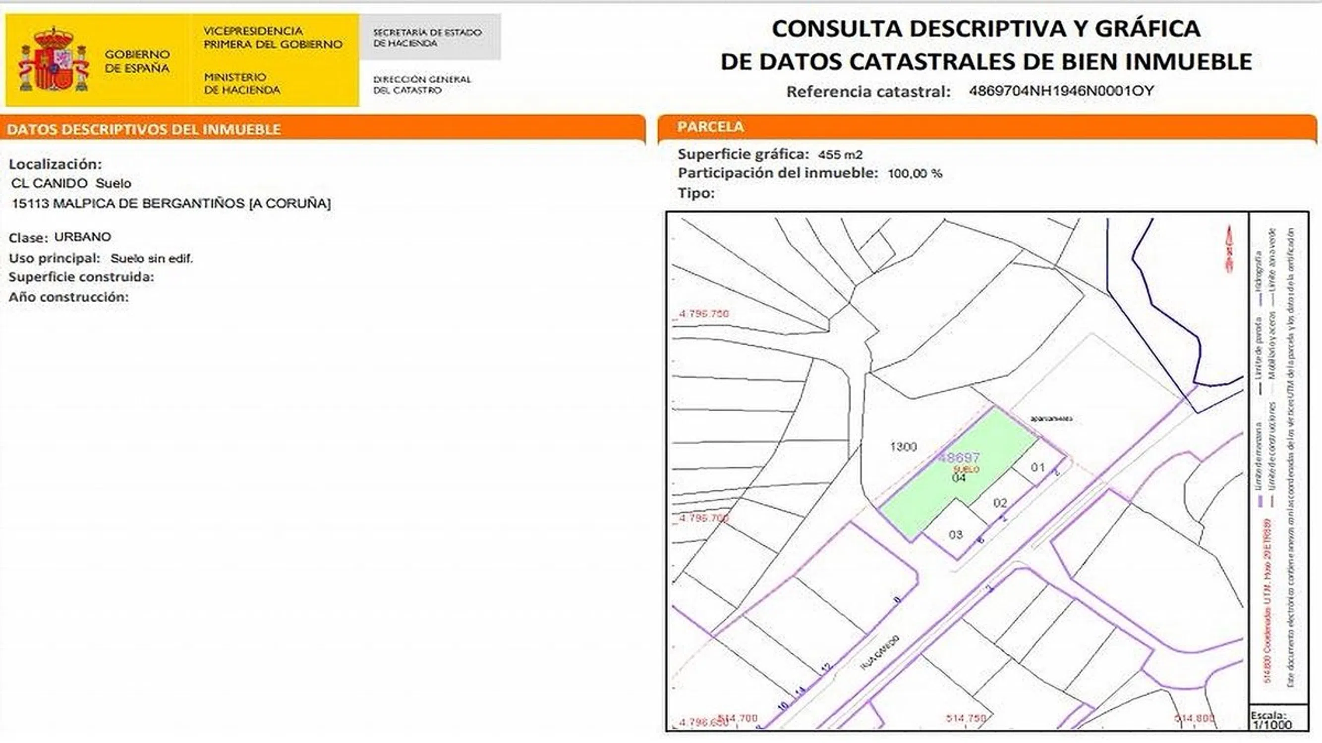 Suelo ubicado en MALPICA DE BERGANTIÑOS. Parte del terreno se clasifica como suelo rústico y resto suelo urbano (418 m2). Referencias catastrales: 15044A01 0ET; 4869704NH1946N0001OY. Superficie terreno 876 m2 registrales. Se aplica Ordenanza URME. Altura máxima B+3+BC. La parcela se encuentra urbanizada parcialmente. Edificabilidad aproximada 2.104 m2/t. A escasos metros de la Playa de Area Mayor en Malpica.