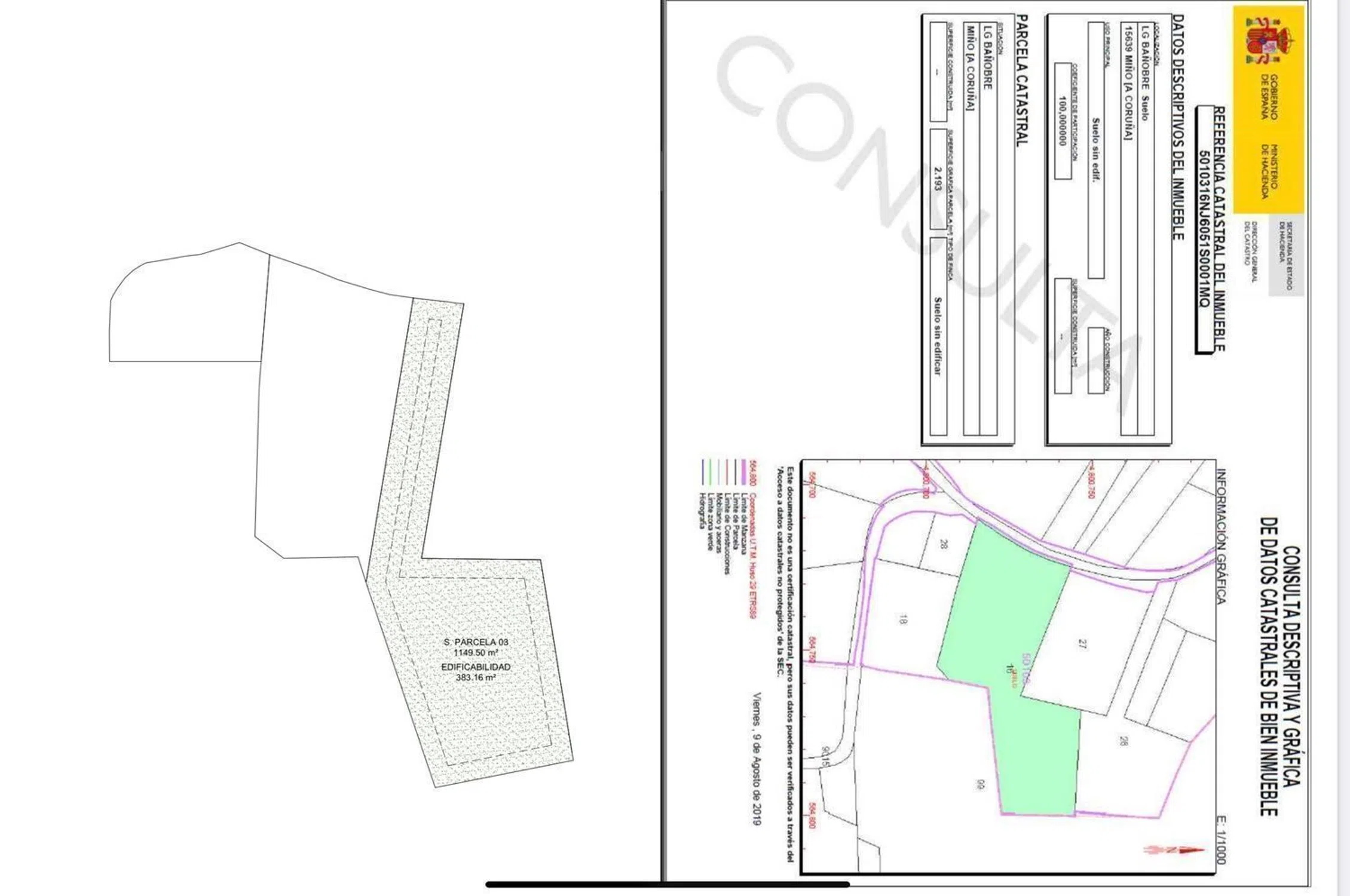 Rentaloo vende esta espectacular finca de 1.149m2 en la que puedes construir tu vivienda soñada, de 383m2, la finca cuenta con unas vistas inmejorables a la playa de Miño con una magnífica comunicación a la autopista y la playa. Construye tu vivienda a tu gusto, la propiedad se vende con un anteproyecto que puede adaptarse a las necesidades de cada uno. Una oportunidad buenísima si quieres irte a vivir al campo con vistas al mar, cerca del campo de golf, de la playa, supermercados y del pueblo de Miño. Si le interesa esta parcela, no dude en ponerse en contacto con nosotros. NOTA: RENTALOO, por medio de convenios nacionales con varias de las principales entidades bancarias permite que nuestros clientes disfruten de las mejores opciones de financiación del mercado, con condiciones especiales y ventajosas. Nota: Este anuncio no es vinculante, puede contener errores, se muestra a título informativo y no contractual. El texto que se ofrece está destinado a su uso como instrumento documental. No tiene validez jurídica ninguna.
