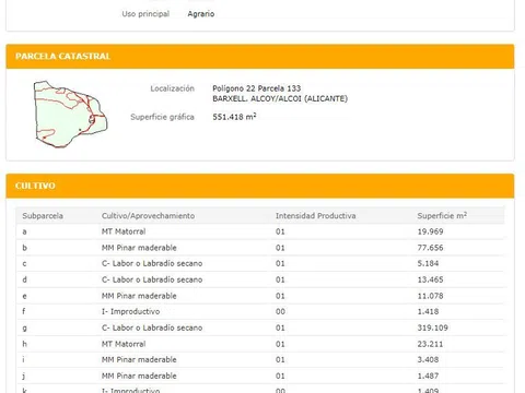 SIN COMISIONES DE INMOBILIARIA. Medina & Co les ofrece este fantástico suelo situado en el término de municipal de Alcoy. Es la capital de la comarca de La Hoya de Alcoy, con una población aproximada de 61.000 habitantes. La población se encuentra muy bien comunicada de las ciudades de Alicante y Valencia, mediante la carretera A-7. Es una excelente oportunidad de adquirir en propiedad este gran suelo rústico que ocupa una superficie de 713.585 m². Se encuentra a unos escasos 5 kilómetros de Alcoy, con una muy buena comunicación mediante la carretera CV-796. Existe en el interior de la finca una edificación en estado ruinoso, de grandes dimensiones, que requiere de una gran inversión para su adecuación. No dispone de suministros ni cédula de habitabilidad, por lo que todos los gastos para legalizar la casa correrán a cargo del comprador. Existen discrepancias entre la superficie registral y catastral, lo que se da a conocer, ya que el cliente deberá de asumir su regularización. La finca es ideal, sobre todo, para agricultores y hosteleros/restauradores. Parte de la finca se encuentra protegida por el PORN de Mariola, encontrándose en un paraje forestal. Referencias catastrales: 03009A022001330000YM 03009A023000500000YK 001200100YH18F0001OK Se ubica en un hermoso entorno natural, ofrece un oasis de tranquilidad y belleza natural, perfecta para aquellos que buscan desconectar del bullicio de la ciudad y disfrutar de la vida en el campo. Los amplios terrenos ofrecen múltiples oportunidades para disfrutar del aire libre, ya sea dando paseos por los senderos naturales, practicando deportes al aire libre o simplemente disfrutando de las vistas panorámicas desde cualquier rincón de la propiedad. En Medina & Co trabajamos para ofrecer a nuestros clientes los mejores suelos. Es nuestro deseo proporcionarles las mejores opciones a sus necesidades. Cuidamos al máximo los detalles.