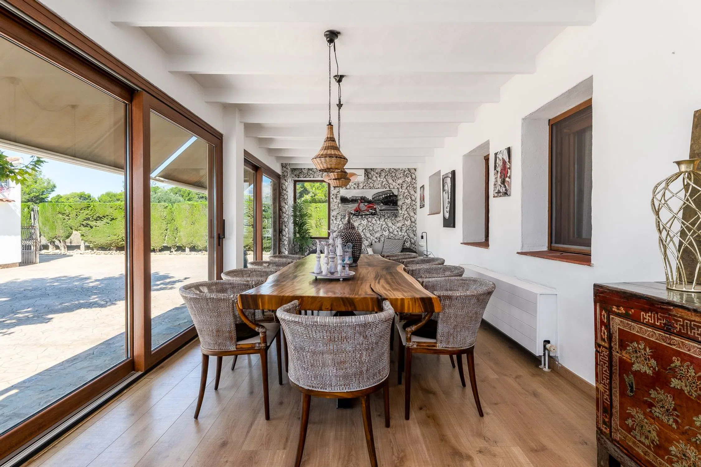 Villa con Piscina, Pista de Tenis y Total Privacidad Nos complace presentar una finca única y excepcional situada en una parcela completamente cercada y plana de 7,000 m², ubicada en un entorno natural privilegiado con vistas panorámicas a las montañas de Sierra Bernia, Sierra Helada y Puig Campana. Con 610 m² de espacio construido, esta notable propiedad ofrece un oasis de privacidad, confort y estilo, centrado en una elegante residencia principal que combina el encanto rústico con acentos industriales. Materiales nobles y líneas contemporáneas crean una atmósfera cálida y sofisticada en todo el interior. El interior cuenta con una amplia sala de estar de 75 m² con techos altos, una chimenea de leña y un comedor independiente ideal tanto para la vida familiar como para el entretenimiento. La cocina totalmente equipada combina electrodomésticos de primera línea con un diseño funcional. La vivienda ofrece cinco dormitorios, cuatro baños y un aseo de invitados. La suite principal incluye un baño privado y un vestidor. Una oficina dedicada y acabados de alta gama completan la distribución interior. Diseñada para la comodidad durante todo el año, la propiedad incluye ventanas de seguridad con doble acristalamiento, calefacción central de gas con calefacción por suelo radiante en partes de la casa, aire acondicionado y 28 paneles solares. El área exterior es un verdadero paraíso mediterráneo con árboles frutales que incluyen naranjos, limoneros, perales y manzanos, todos mantenidos mediante un sistema de riego automático abastecido por un pozo privado. Una gran piscina de 12x6x1.90 metros y una pista de tenis privada ofrecen excelentes instalaciones de ocio. Cuatro edificaciones independientes de estilo ibicenco situadas junto a la piscina cuentan con una cocina exterior, baño completo, comedor y espacio de salón con barbacoa y horno de leña, perfectos para recibir y relajarse con amigos y familia. Entre las características adicionales se incluyen un gimnasio climatizado, un gran taller, una cabaña de madera ideal para almacenamiento o uso recreativo, un garaje separado y estacionamiento cubierto. Internet por cable de alta velocidad y todos los servicios están disponibles. Construida originalmente entre 1969 y 1971, la propiedad fue renovada en 2013 y 2018, y está distribuida enteramente en un solo nivel. Vendida parcialmente amueblada, esta casa está lista para mudarse y ofrece un estilo de vida excepcional cerca de la naturaleza con total privacidad. Distancias: Aproximadamente 15 minutos a la playaAproximadamente 45 minutos al Aeropuerto de AlicanteAproximadamente 1 hora 30 minutos a Valencia.