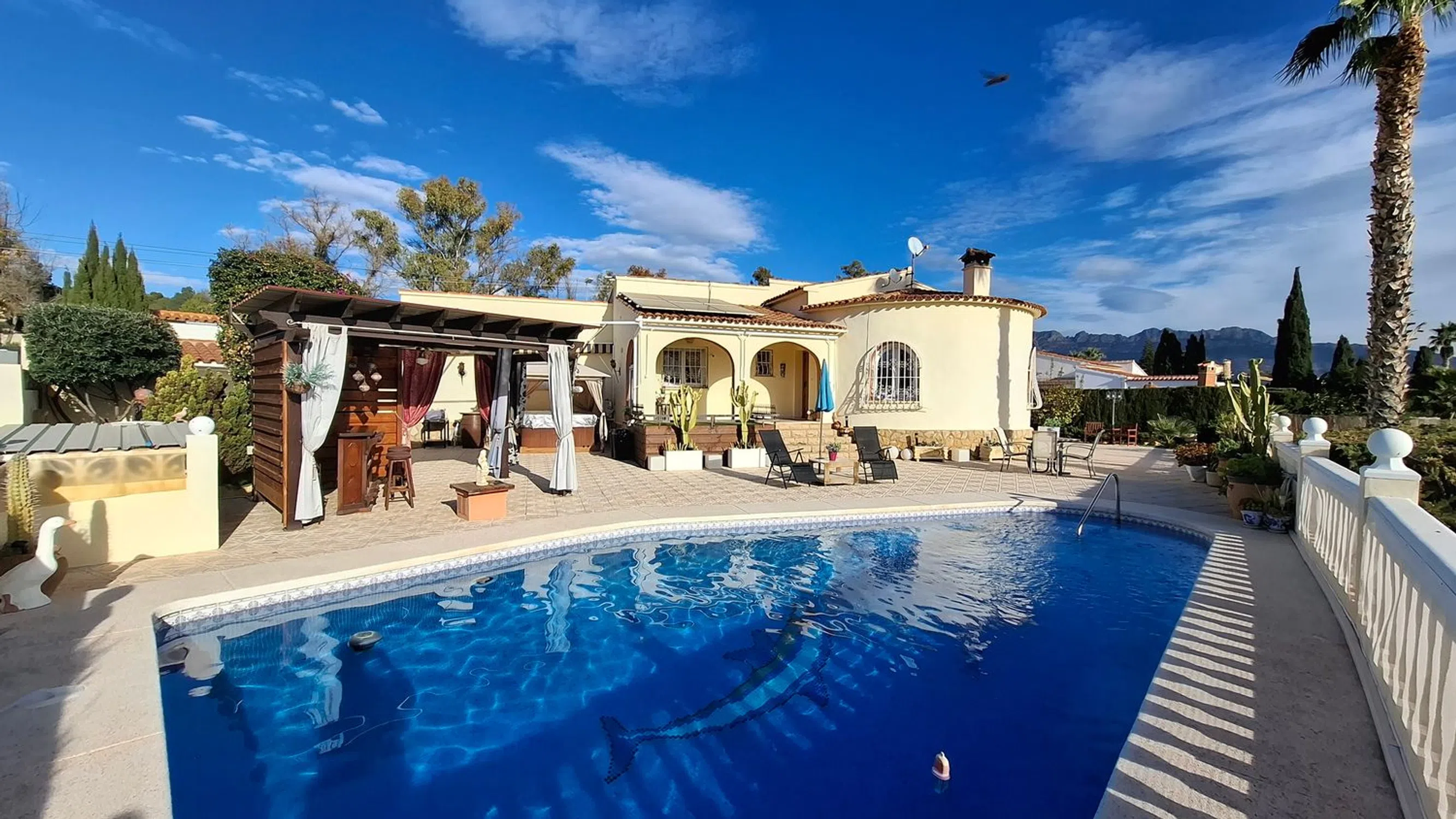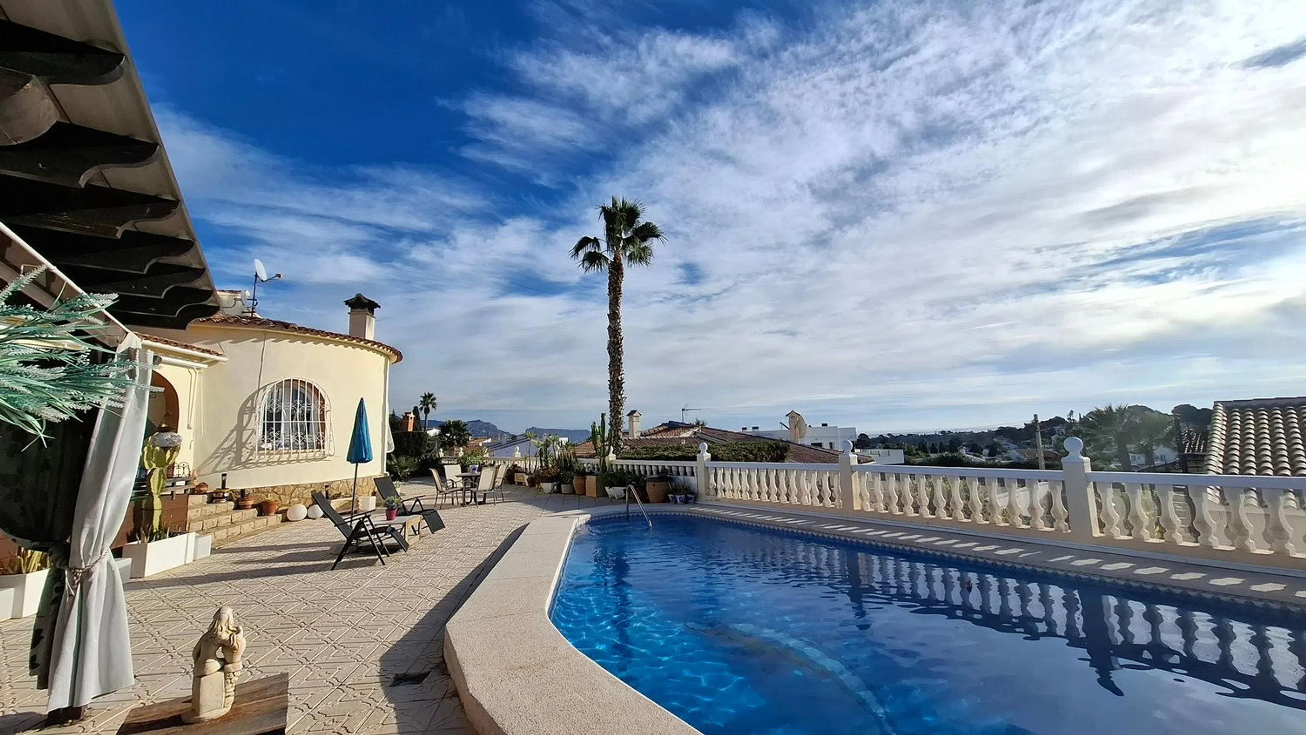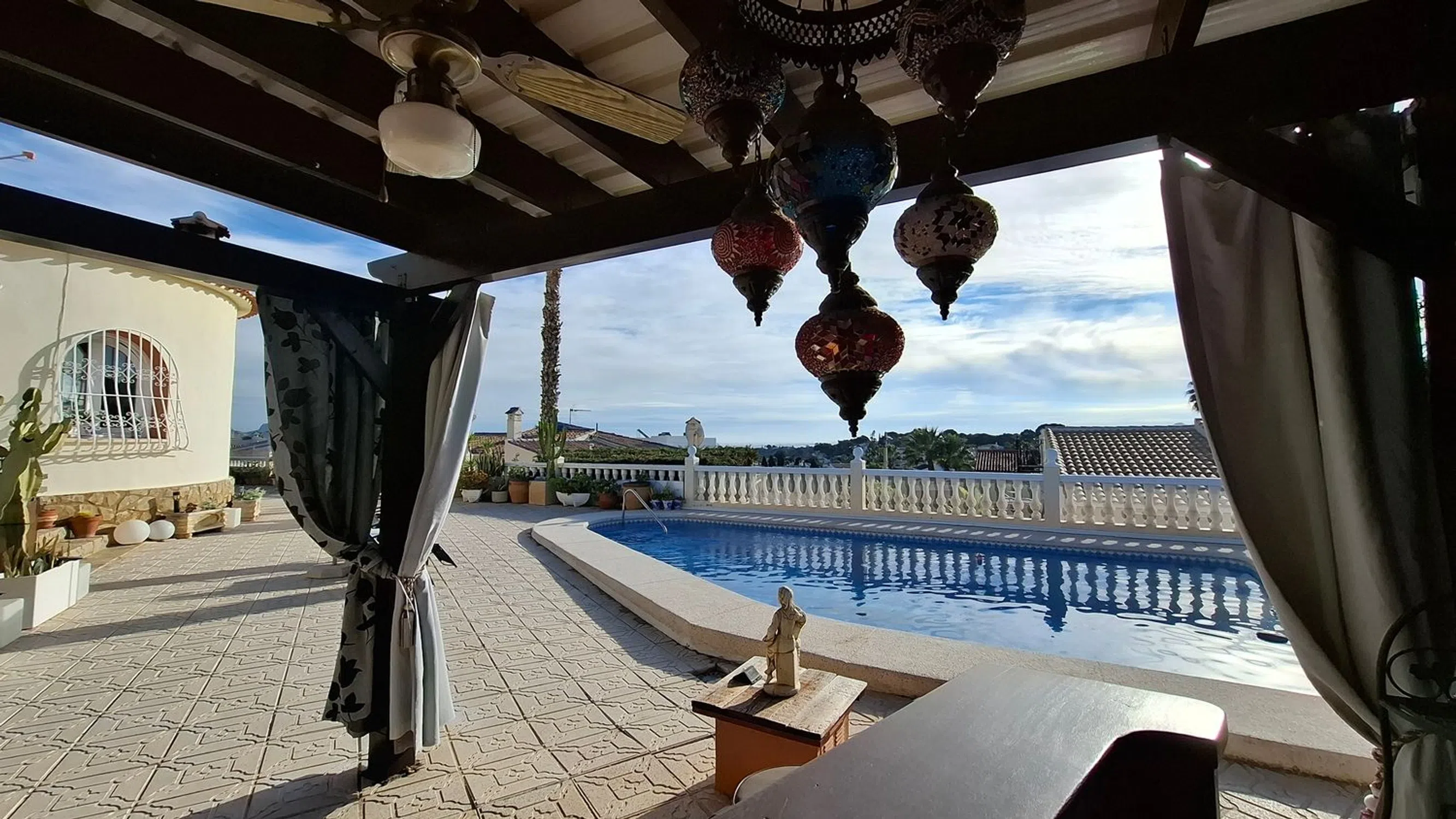 Ubicada en la popular urbanización de Foia Blanca, entre Alfaz del Pi y Altea, nos enorgullece presentar esta encantadora villa. En una sola planta, esta propiedad lo ofrece todo. Para empezar, cuenta con un amplio aparcamiento, tanto en el garaje, que también funciona como trastero, como en la cochera, con espacio suficiente para una autocaravana. El jardín, de fácil mantenimiento (riego automático), orientado al sur y con piscina privada, ofrece hermosas vistas panorámicas al mar y varias zonas de relax, que incluso incluyen un pequeño bar. Justo al lado de la piscina se encuentra la entrada a la sala técnica, con la bomba de la piscina y una pequeña cueva. Una ducha exterior, una cocina de verano y un jacuzzi completan esta zona. En el interior, accedemos a un salón-comedor semiabierto, con una acogedora estufa de leña y una zona de cocina independiente. Junto a la cocina se encuentra un dormitorio de invitados y un baño, y más adelante, en el pasillo, el dormitorio principal con baño en suite y un pequeño dormitorio que actualmente se utiliza como vestidor y lavadero. Doce paneles solares garantizan una factura de electricidad baja, así que no tendrás problemas para usar el aire acondicionado frío/calor durante todo el año. En resumen: un hogar ideal fuera de casa o perfecto para vivir de forma permanente. Ven a verlo y reserva tu visita hoy mismo.