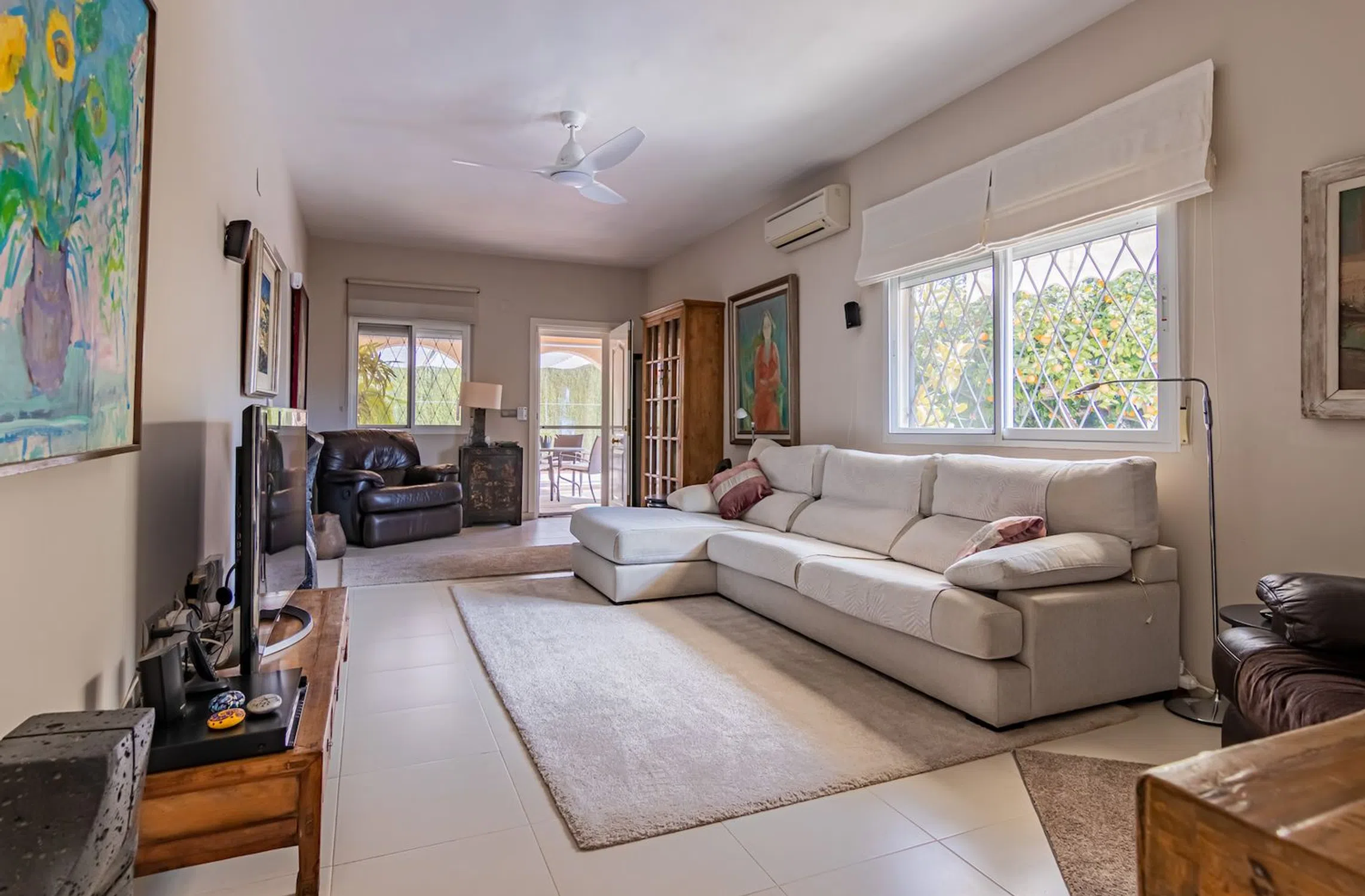 Bonito chalet de esquina ubicado en el Albir, la vivienda se distribuye en 1 sola planta. La propiedad consta de un luminoso salón, un bonito comedor, una cocina completamente equipada, todos ellos cuentan con acceso directo a la zona exterior, 3 dormitorios y 2 baños, uno de ellos en suite. En la parte exterior podremos disfrutar de una bonitas zonas ajardinadas, un pequeño trastero, además de, un coqueto estudio independiente. La vivienda está equipada con armarios, aire acondicionado, rejas de seguridad, calefacción y placas para el agua corriente sanitaria (ACS).