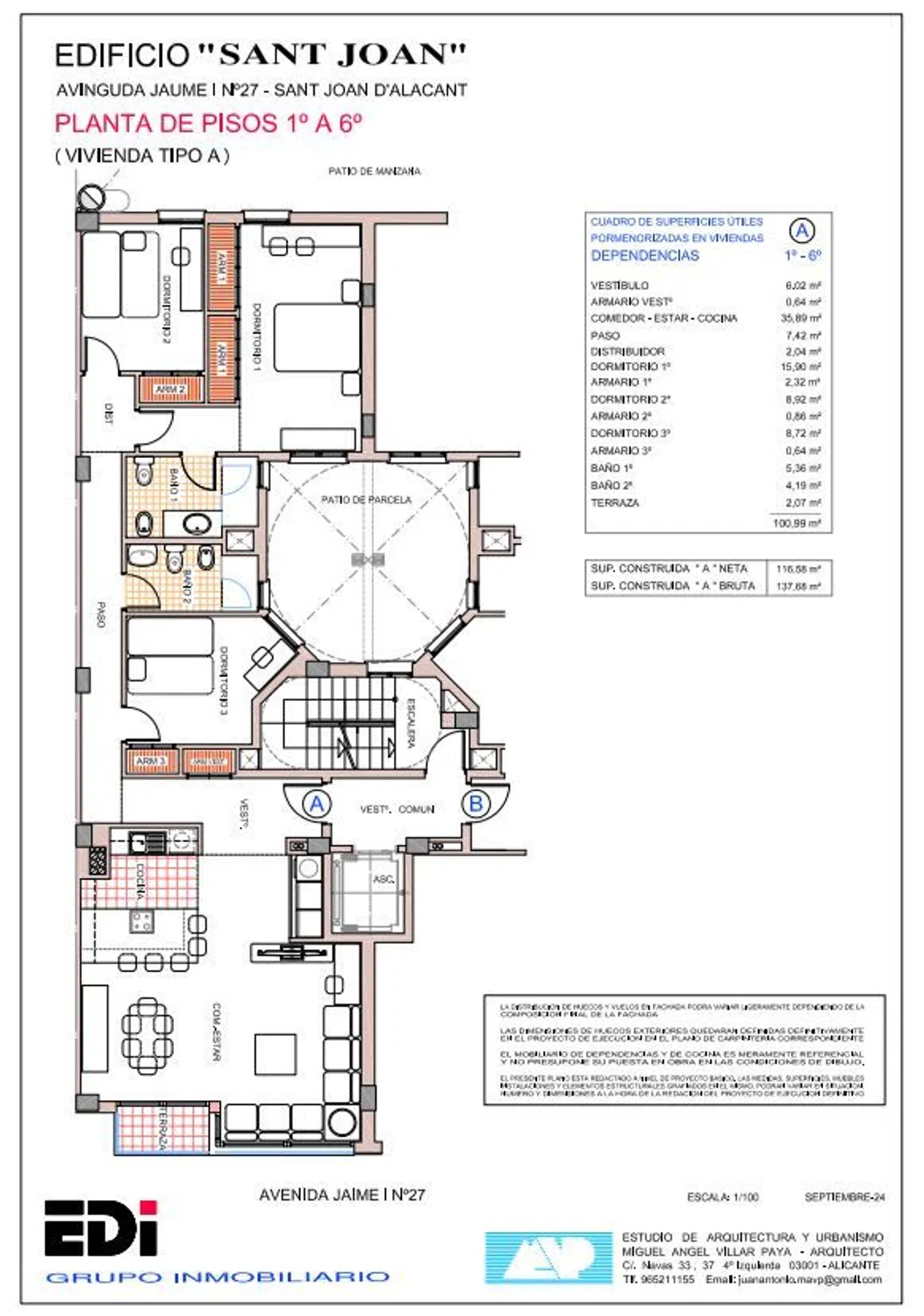 Viviendas vanguardistas, adaptadas al futuro. Nuestros diseños son más de lo que se ve. Nuestro objetivo es entregar al cliente la mejor relación calidad precio en nuestros proyectos, yendo más allá de propuestas meramente estéticas, pensando en espacios orientados al bienestar del cliente. Espacios concebidos desde la sensibilidad y pensados para adaptarse a ti. Promovemos viviendas que son mucho más que viviendas, son hogares. Diseño Planteamos nuestros proyectos pensando en el uso que le van a dar nuestros clientes, apostando por la originalidad, la funcionalidad, la comodidad y el mantenimiento a lo largo del tiempo. Ejecución Vamos más allá de los estándares, adaptándonos a los tiempos, implementando las nuevas tecnologías, para que nuestras residencias sean durables en el tiempo. Evolución Nuestros proyectos cogen lo mejor de las soluciones tradicionales, adaptándolo a los tiempos para ofrecer resultados novedosos, preparados para el futuro. Cada uno de nuestros proyectos es un compromiso con el cliente, con el entorno y con la arquitectura sostenible. Espacios orientados al bienestar Se trata de un edificio de planta baja y 6 alturas formado por 12 viviendas exclusivas de 3 dormitorios, con posibilidad de integrar salón estar y cocina, localizado en el nº 27 de la Avda. Jaime I, con orientación inmejorable que permite la iluminación natural de todas las estancias. En el corazón de Sant Joan. En el centro de San Juan, de verdad. Sant Joan d’Alacant está Cerca de Todo. Nuestro municipio tiene todo aquello que un visitante puede desear. Estamos cerca de la playa, cerca de la montaña, cerca de la capital, Alicante, y cerca de las vecinas poblaciones de El Campello, Mutxamel, Sant Vicent del Raspeig, Busot y Xixona. A lo largo de la historia esta población ha logrado atesorar un extraordinario legado patrimonial, material e inmaterial. Ello ha sido posible gracias al trabajo en común entre los municipios vecinos y a una gestión magistral de los recursos naturales de nuestro territorio. Zonas escolares y culturales Situado a escasos 800 m de la casa de Cultura de Sant Joan d´Alacant, tiene en su entorno cercano varios centros educativos, tanto públicos como privados, entre los que destacan Nuestra Sra. del Carmen (Carmelitas-650m), el CEIP Cristo de la Paz (550 m) y el Colegio Público Lo Romero (650 m). Instalaciones deportivas A 900 m el centro deportivo Ozone y a poco menos de 2.000m el polideportivo de San Juan donde el Excmo. Ayuntamiento dispone las escuelas deportivas municipales que impulsa a través de la Fundación Deportiva Municipal. Centros comerciales y sanitarios Destacan principalmente centro punteros del área metropolitana de Alicante como son el Centro Comercial Carrefour a escasos 4 minutos y el Hospital Universitario de San Juan de Alicante a 1.400 m, ambos líderes en sus respectivas categorías. Conexiones/ comunicaciones La conexión viaria principal la constituye la antigua N332 a la que se tarda en llegar un breve minuto desde la puerta de nuestro edificio. Desde allí el acceso a la autopista A7 en menos de 3 minutos, o tomar dirección para llegar al centro de alicante es inmediato.