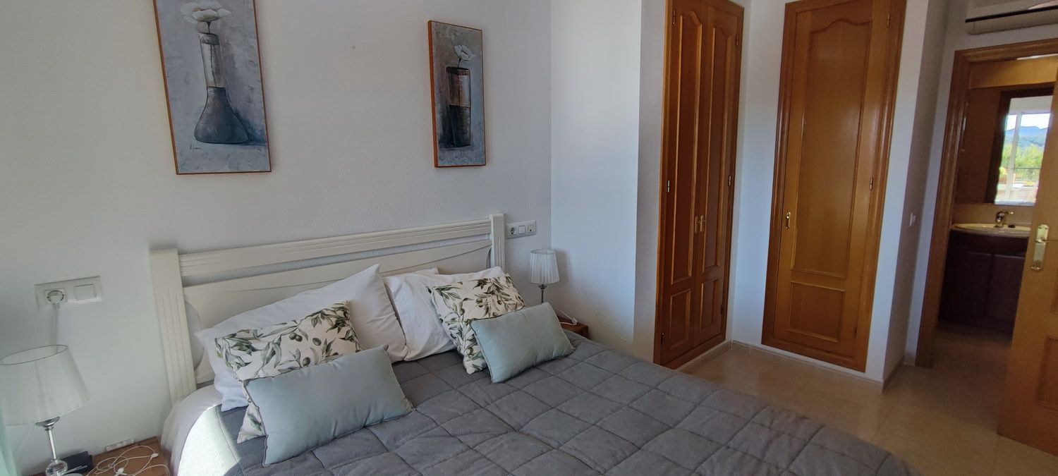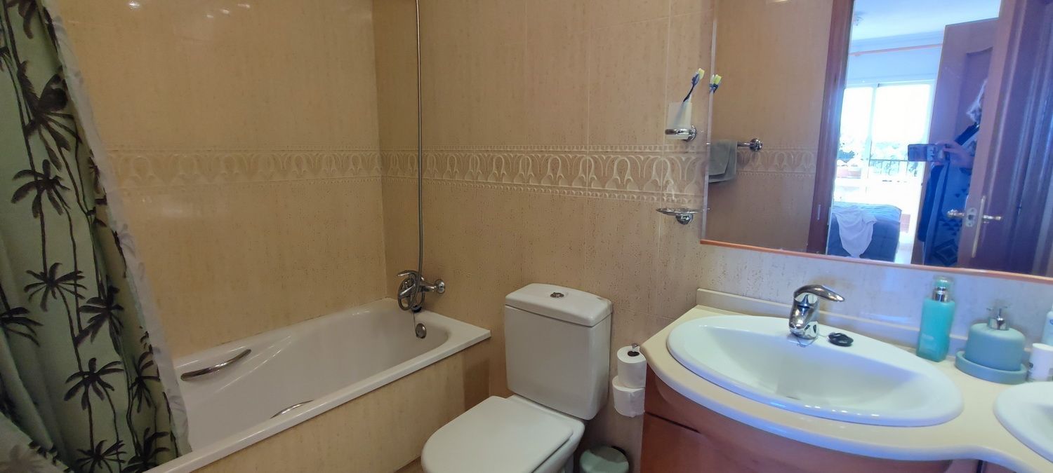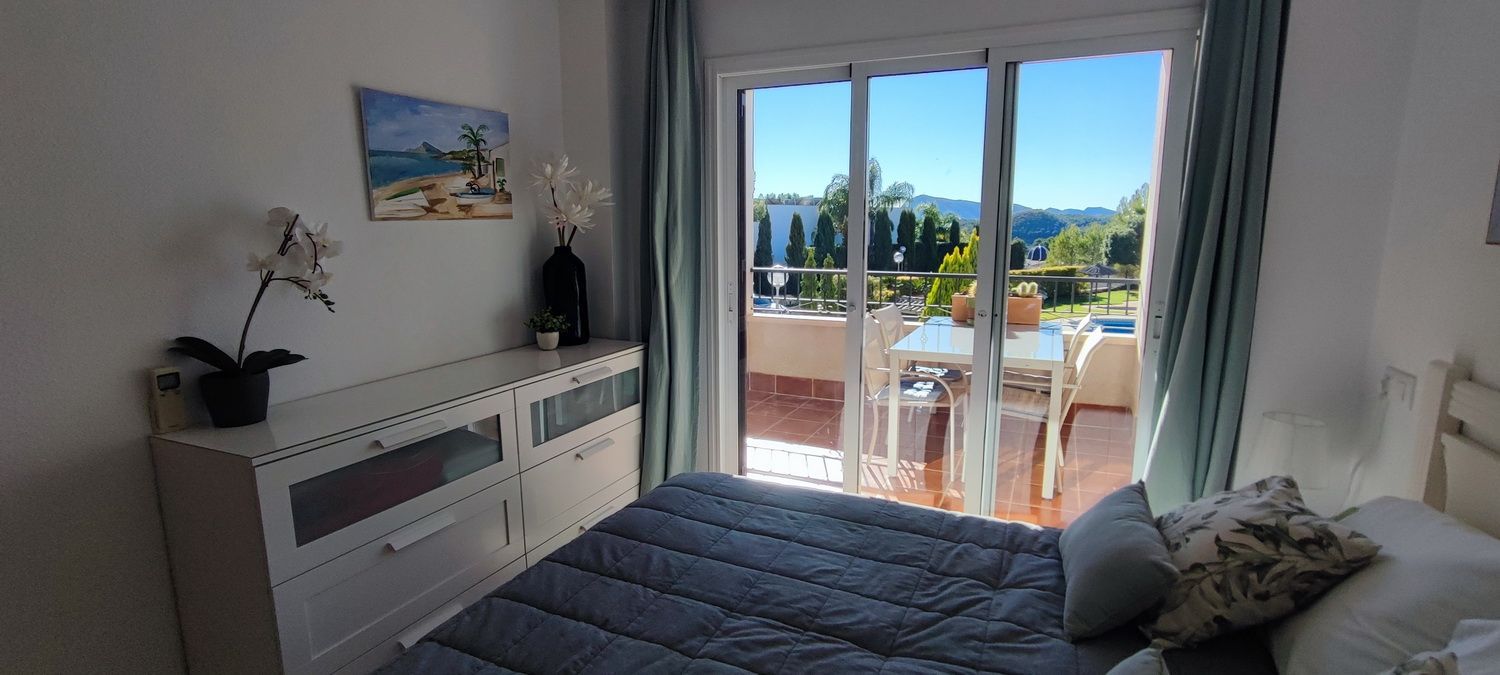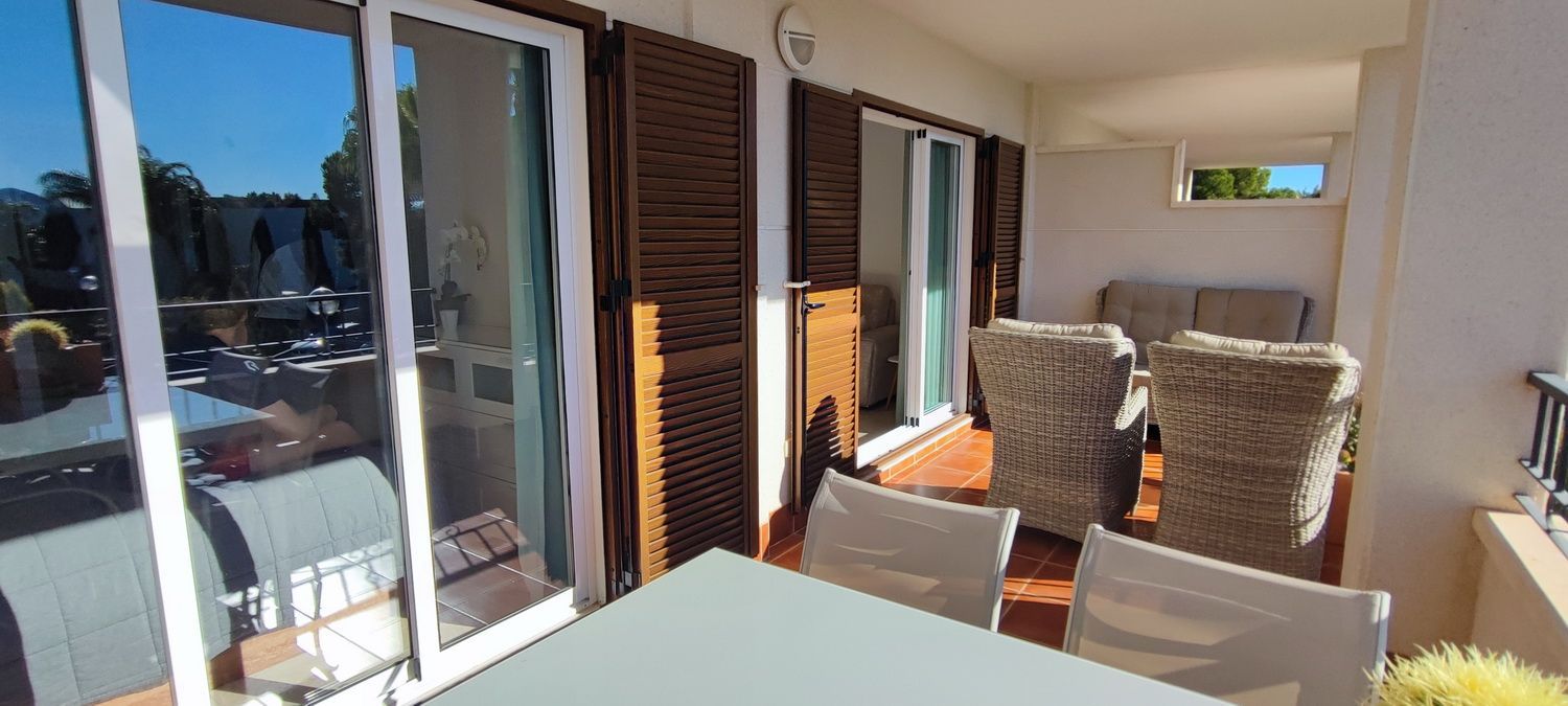 Encantador apartamento que cuenta con una amplia terraza que ofrece vistas despejadas y otra en la parte trasera con hermosas panorámicas de la sierra circundante. Situado en una zona tranquila y arbolada, ideal para disfrutar de la naturaleza. Dispone de 2 acogedores dormitorios, 2 baños, un luminoso salón-comedor y una cocina independiente con lavandería. Equipado con aire acondicionado para garantizar comodidad durante todo el año, también incluye una plaza de aparcamiento. Los residentes pueden disfrutar de una piscina y jardines comunitarios de excelentes calidades. Además, hay acceso a una piscina cubierta y climatizada del complejo vecino, disponible de octubre a abril, perfecta para los meses más fríos.