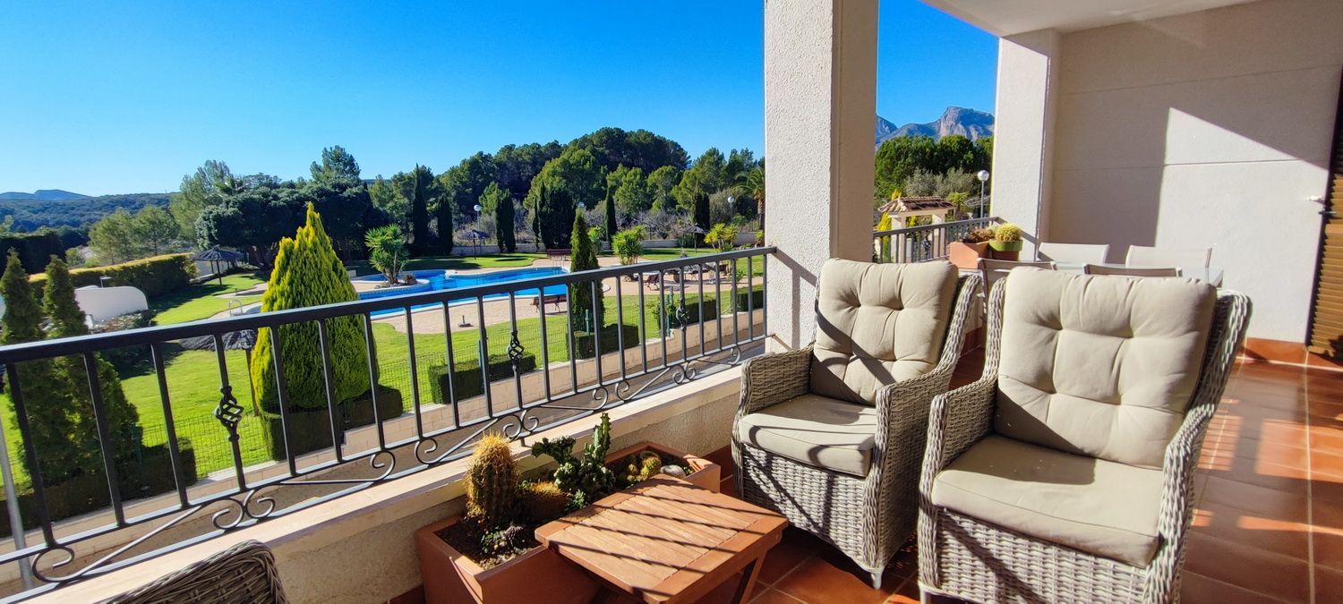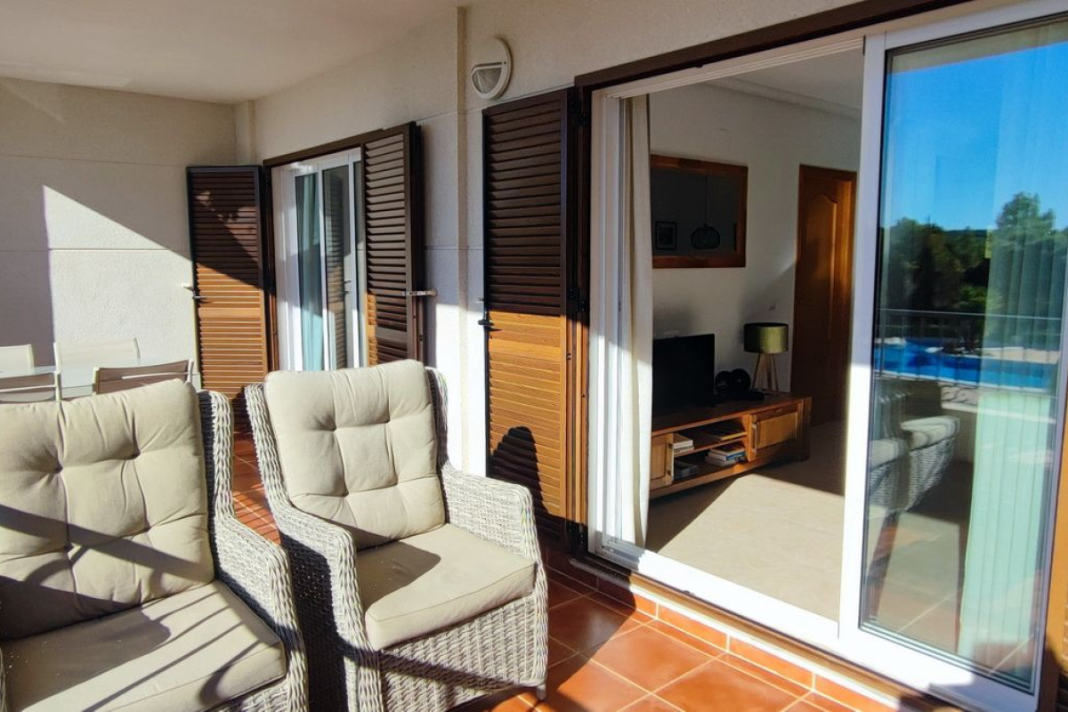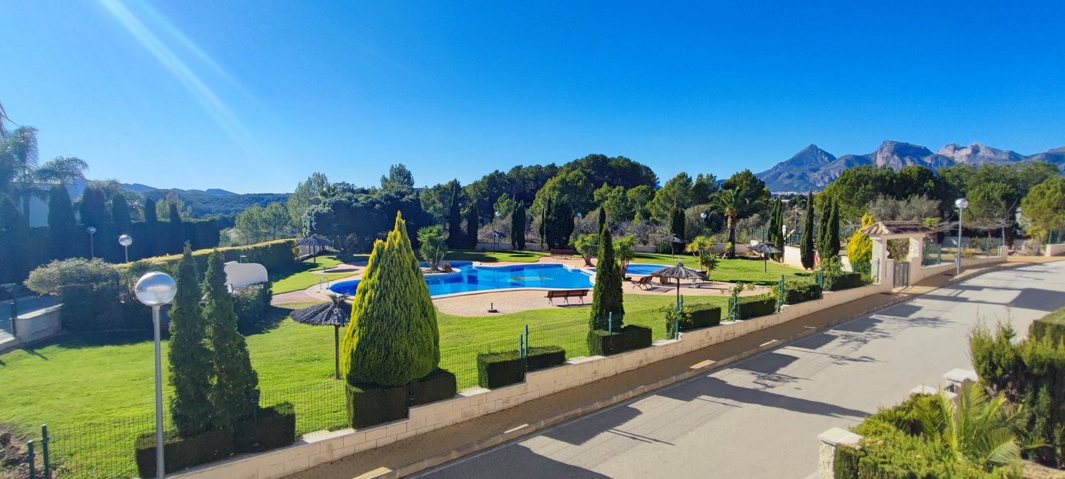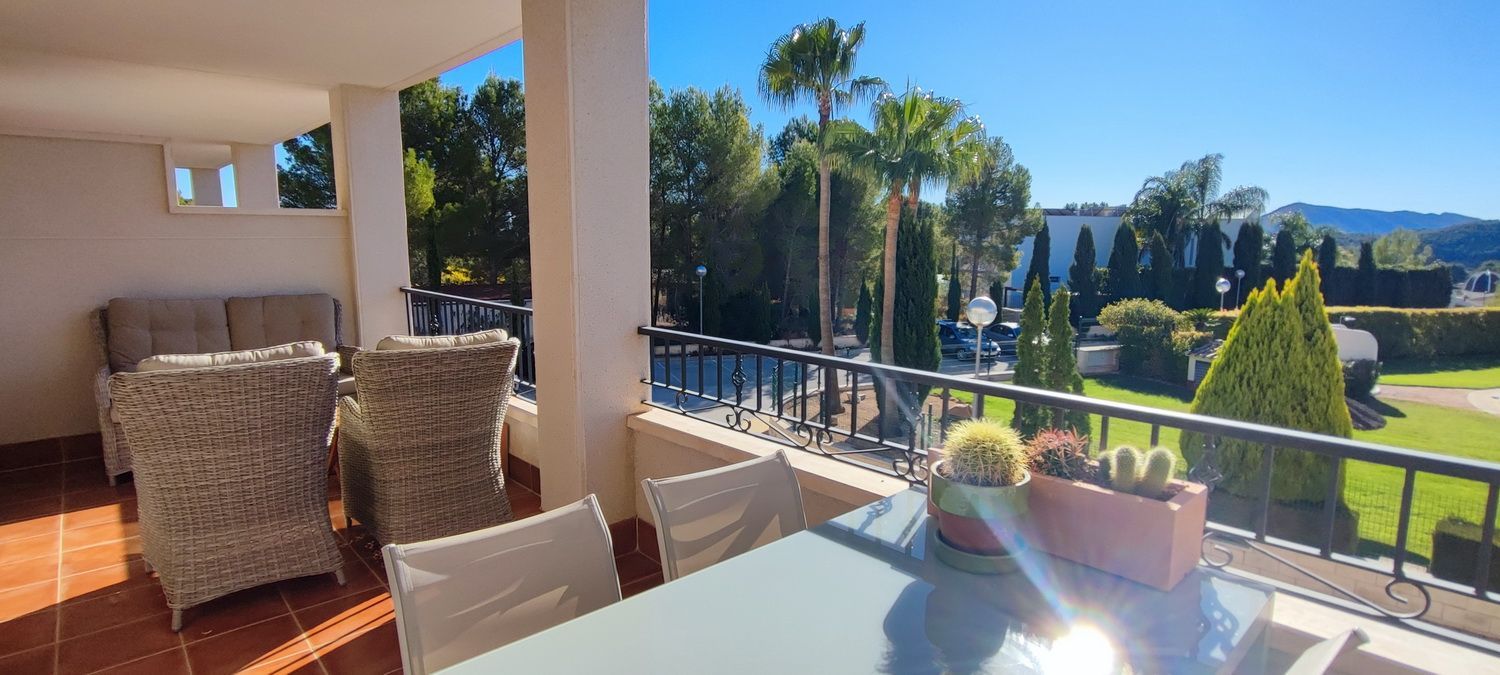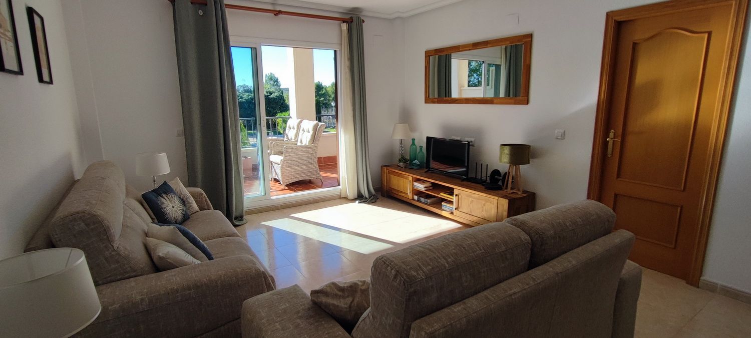 Encantador apartamento que cuenta con una amplia terraza que ofrece vistas despejadas y otra en la parte trasera con hermosas panorámicas de la sierra circundante. Situado en una zona tranquila y arbolada, ideal para disfrutar de la naturaleza. Dispone de 2 acogedores dormitorios, 2 baños, un luminoso salón-comedor y una cocina independiente con lavandería. Equipado con aire acondicionado para garantizar comodidad durante todo el año, también incluye una plaza de aparcamiento. Los residentes pueden disfrutar de una piscina y jardines comunitarios de excelentes calidades. Además, hay acceso a una piscina cubierta y climatizada del complejo vecino, disponible de octubre a abril, perfecta para los meses más fríos.