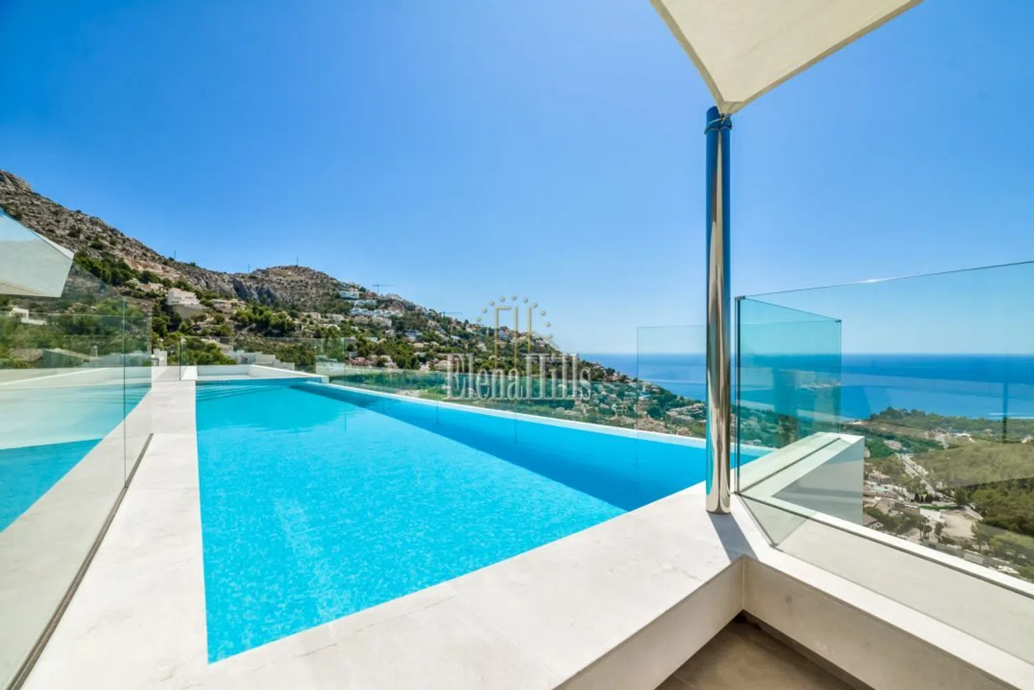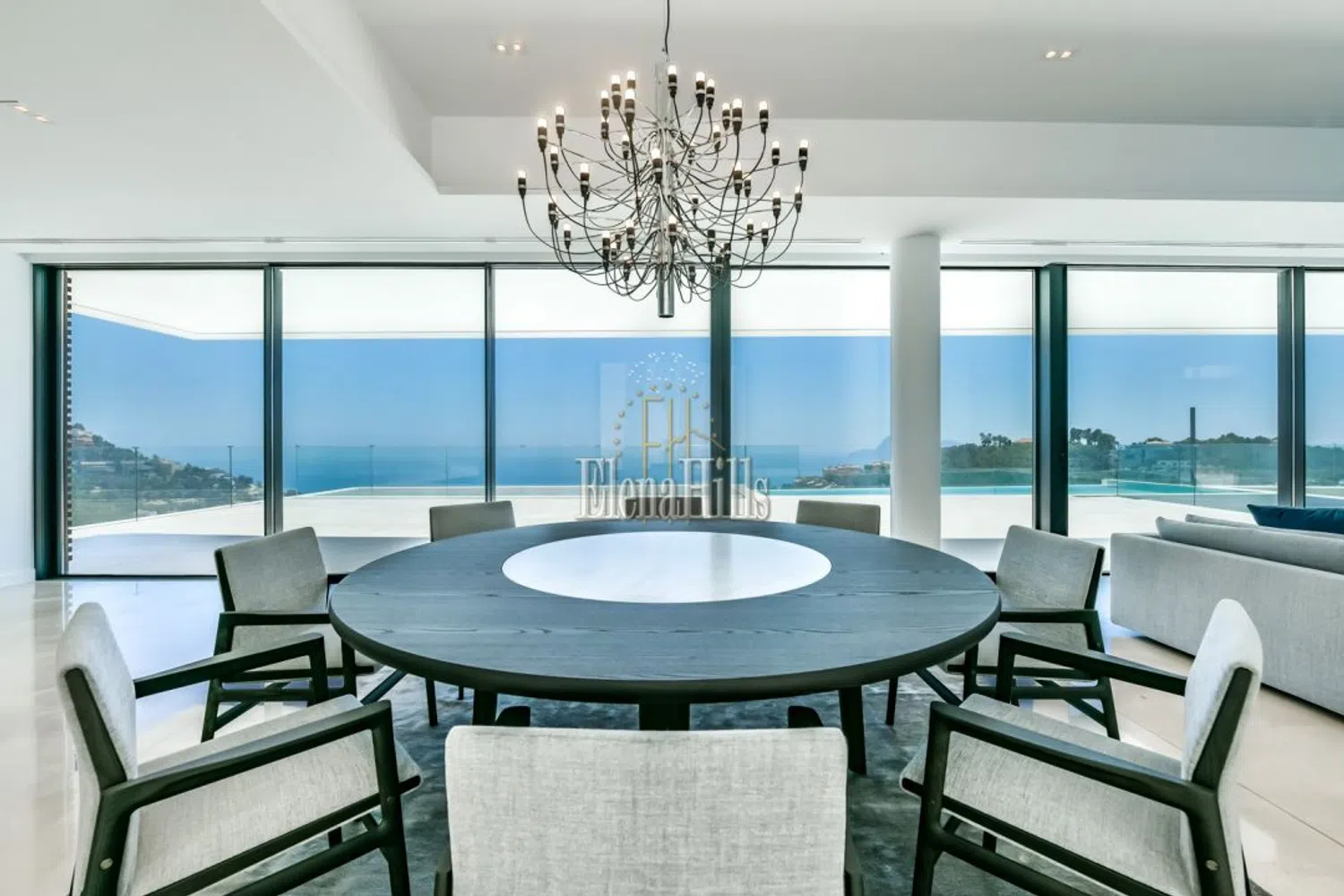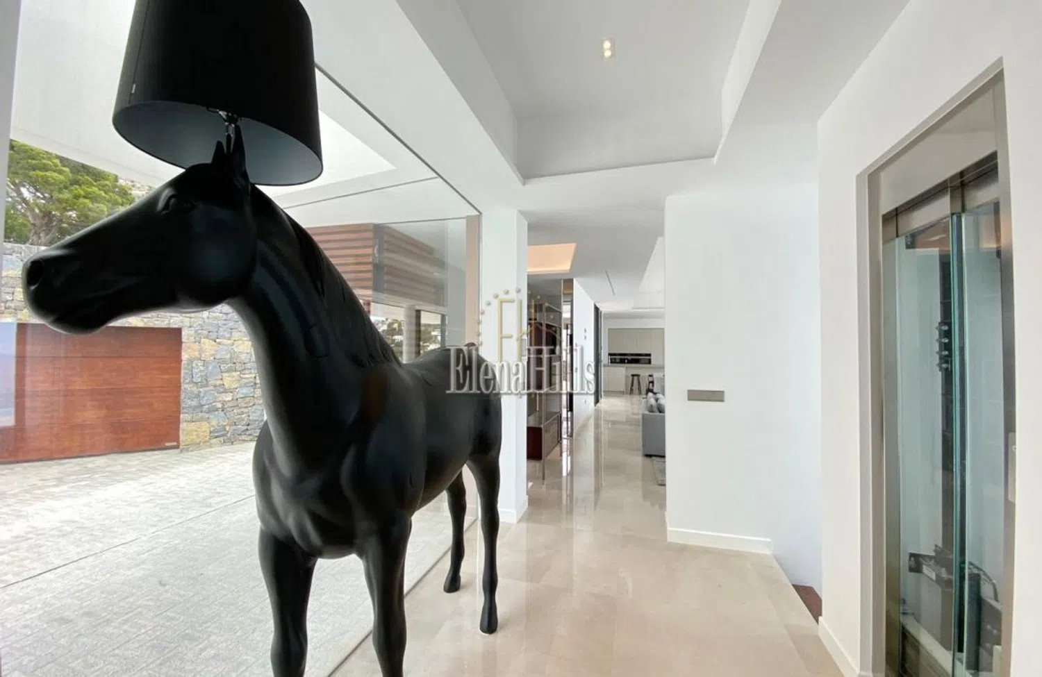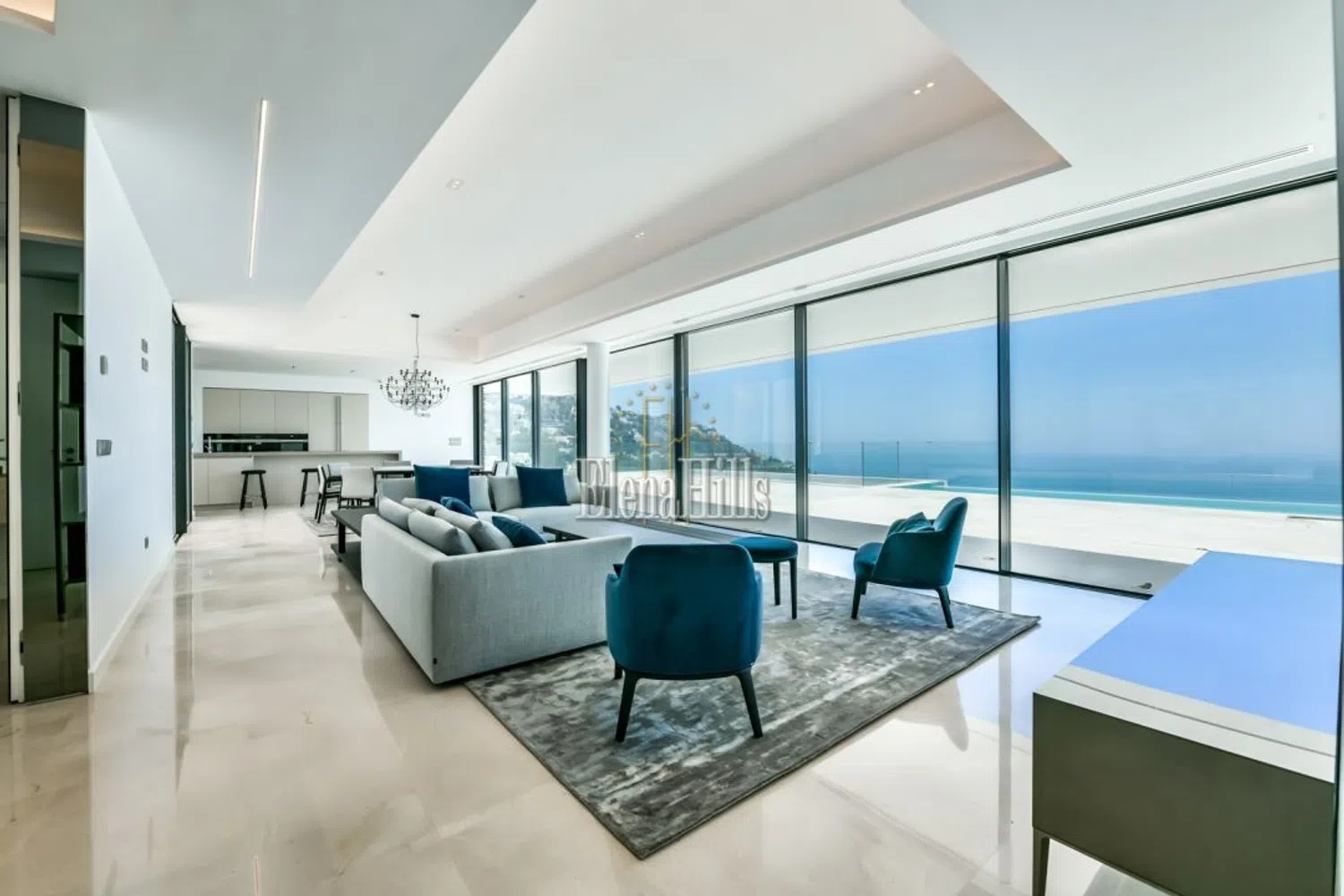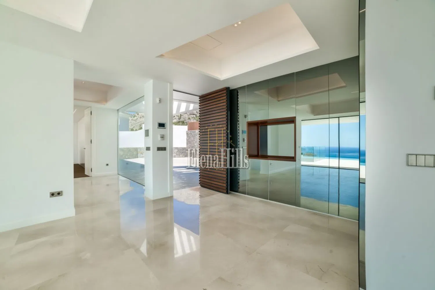 La entrada principal presenta una fachada con dos niveles de terrazas que cuentan con amplias ventanas panorámicas y elegantes barandillas de vidrio. Todas las estancias, incluidos los baños, dan acceso a la terraza y están orientadas hacia el mar, lo que permite que los espacios se sientan excepcionalmente amplios y luminosos, inundados de luz natural. Las altas puertas blancas que van del suelo al techo y los suelos de baldosas de mármol pulido en tonos claros aumentan la sensación de apertura, creando un ambiente de elegancia y confort.