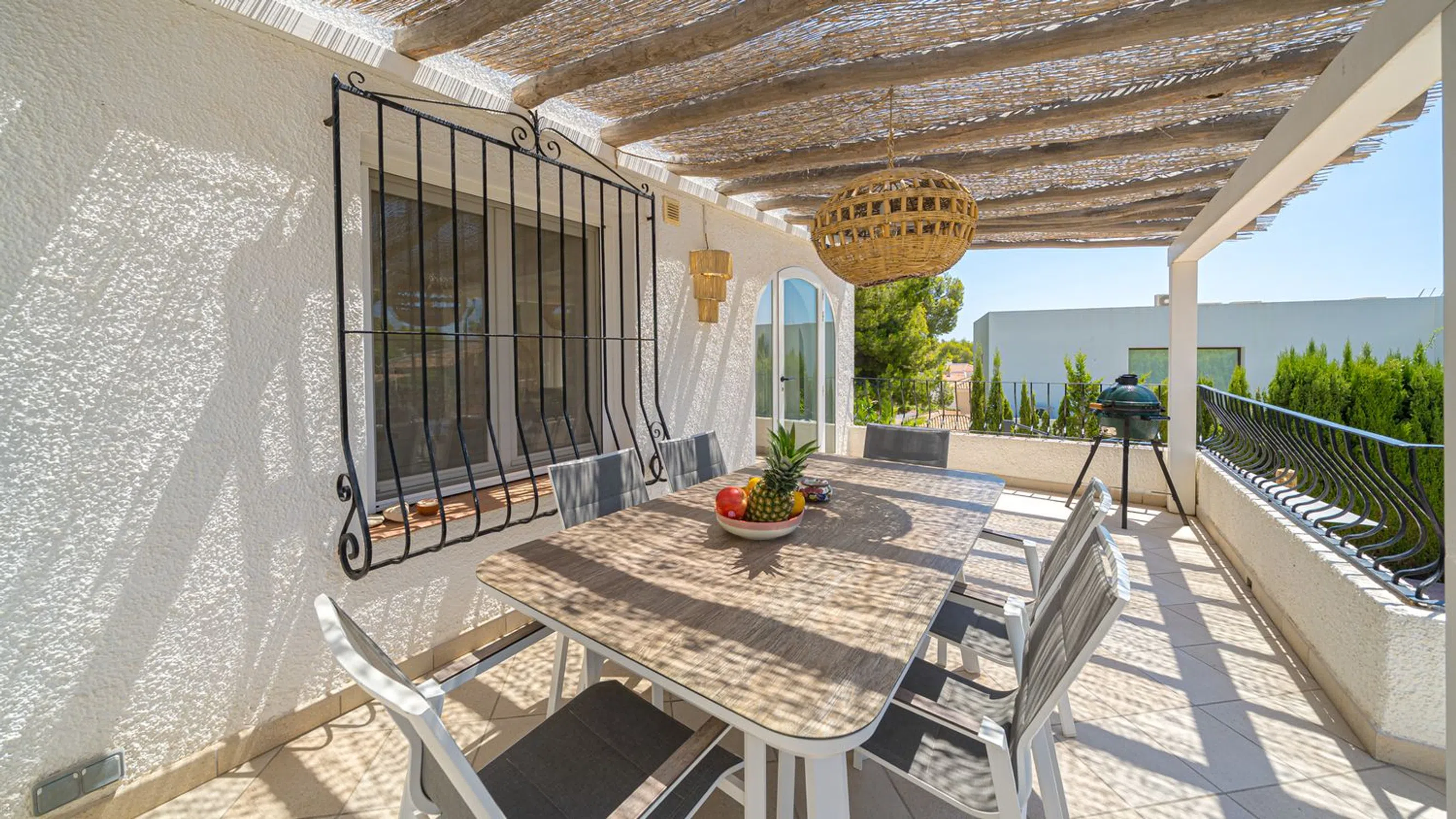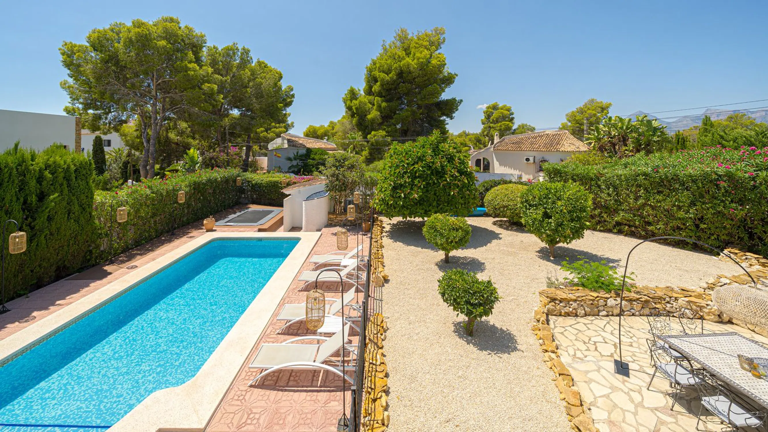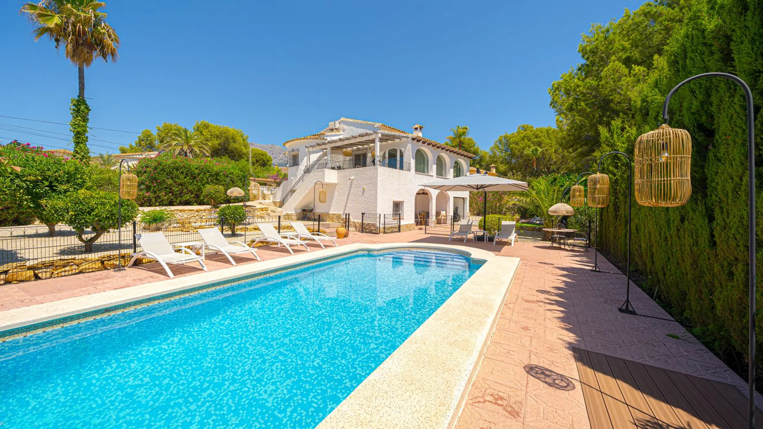 Villa Renovada con Apartamento de Invitados Cerca de la Playa Esta hermosa villa se encuentra en una parcela esquinera en la tranquila y verde zona residencial de Montemolar, en Altea, a poca distancia a pie o en bicicleta de la playa de La Olla y los centros de Altea y Altea La Vella. Esta ubicación privilegiada la convierte en la casa de vacaciones ideal para familias. La villa ha sido completamente renovada con gusto, con materiales de alta calidad y cuidando hasta el último detalle. En la planta superior se encuentra un salón-comedor, una cocina totalmente equipada, tres dormitorios y dos baños. La terraza-comedor tiene vistas a la gran piscina climatizada con solárium y al jardín de fácil mantenimiento. También hay un apartamento de invitados con dos dormitorios, un baño, un salón con cocina totalmente equipada y una terraza privada. Además, dispone de garaje, amplio trastero, calefacción central y aire acondicionado.