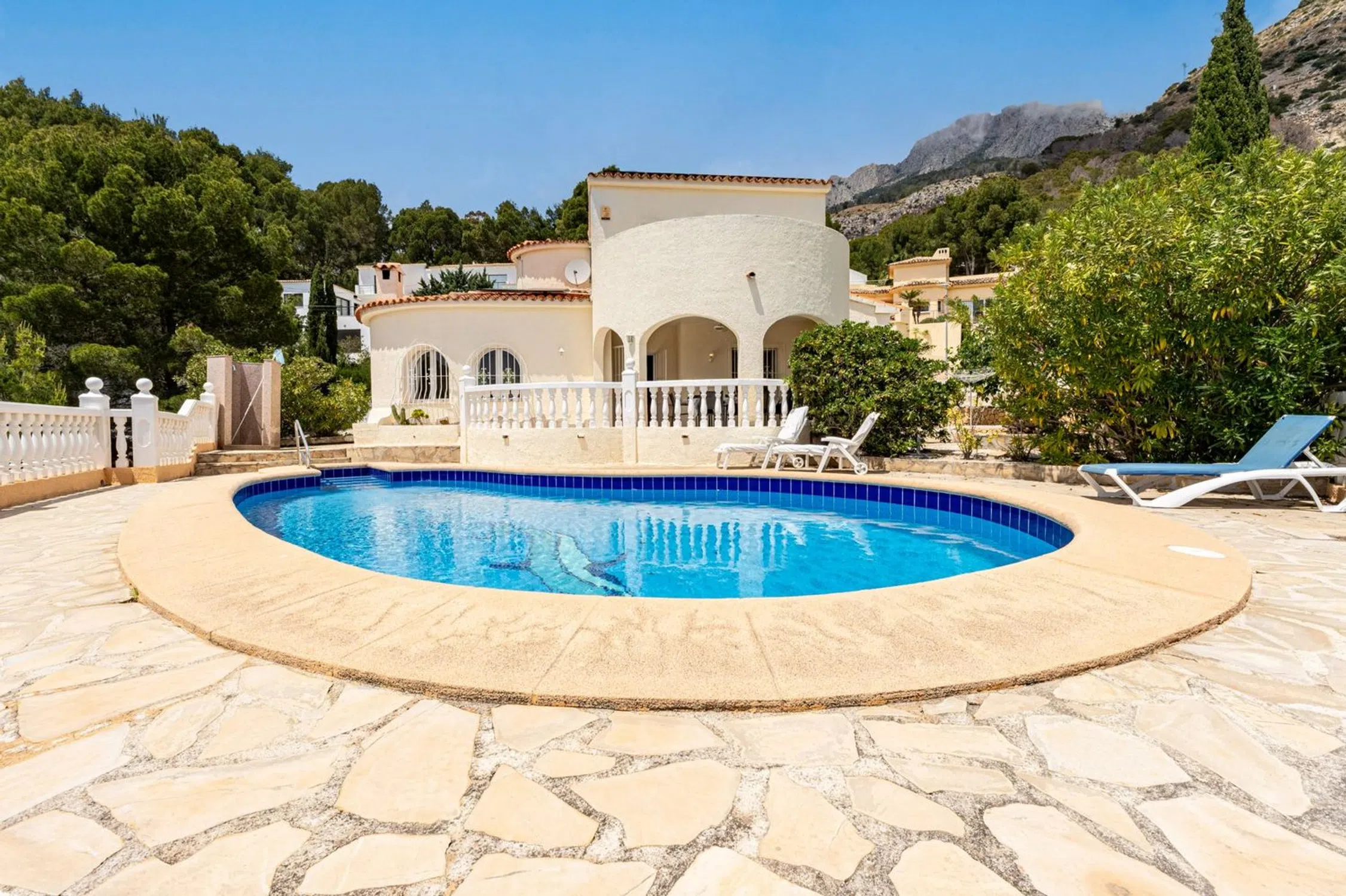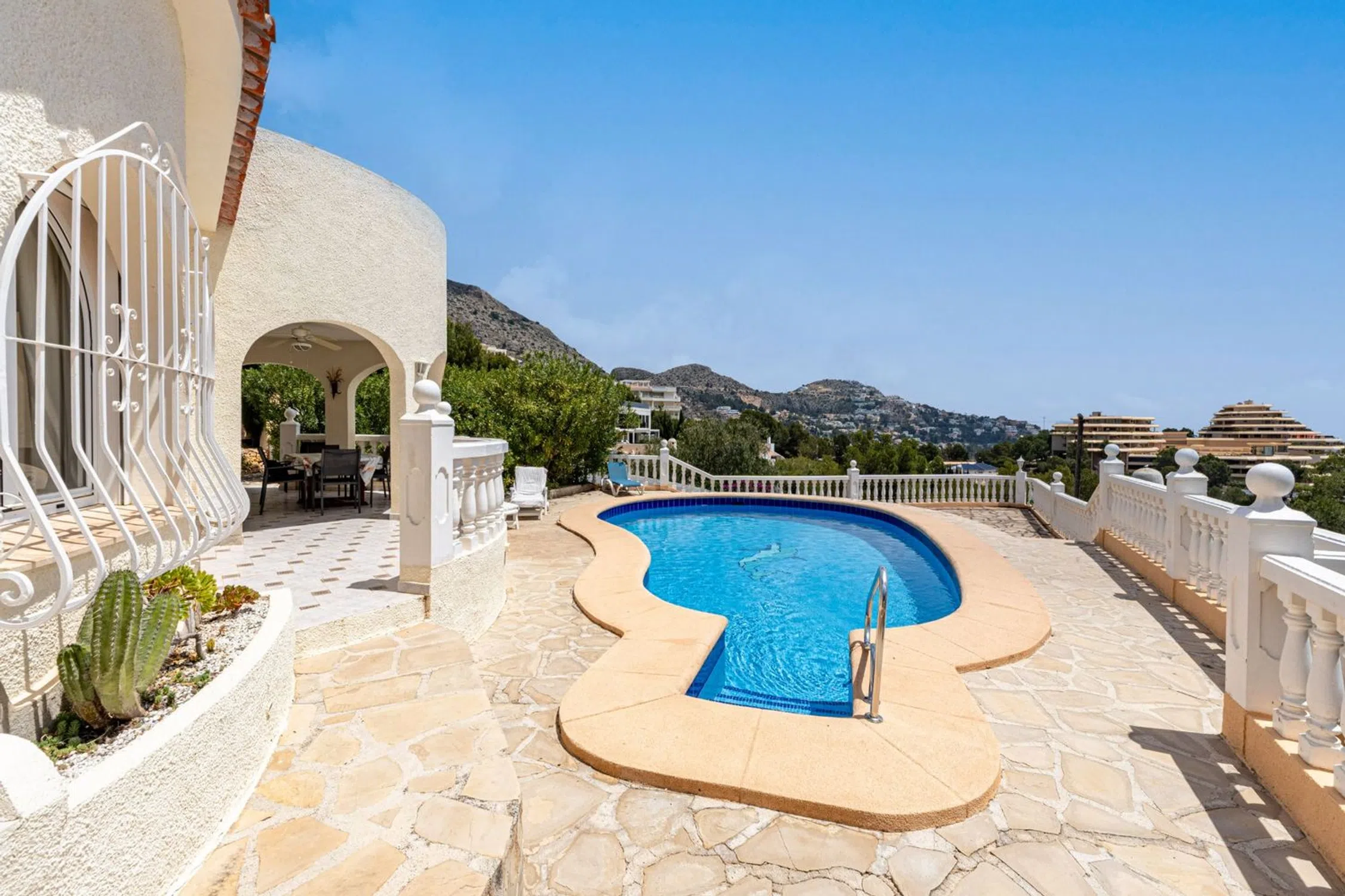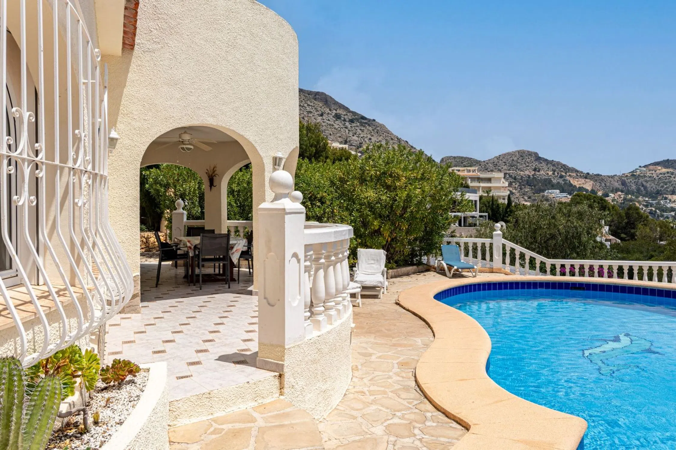 Encantadora Villa Mediterránea con Vistas Panorámicas al Mar – Junto a Altea Hills Situada justo al lado de los prestigiosos Altea Hills, esta elegante villa de estilo mediterráneo ofrece algunas de las vistas al mar más espectaculares de toda la región. Con su posición elevada, cada rincón de la casa—ya sea el área de la piscina climatizada, la terraza principal o el balcón del piso superior—ofrece vistas ininterrumpidas del Mar Mediterráneo que se extienden interminablemente hacia el horizonte. Diseñada a finales de los años 90 por un arquitecto alemán, la villa combina una elegante arquitectura atemporal con una artesanía de calidad. Su distribución cuidadosa incluye tres amplias habitaciones y tres baños bien equipados, lo que la hace perfectamente adecuada para vivir todo el año o como un refinado retiro vacacional. La casa está equipada con 14 paneles solares, reduciendo considerablemente el consumo de energía y alineándose con los objetivos de sostenibilidad modernos. La piscina climatizada permite su uso cómodo durante todas las estaciones, y el espacio de estacionamiento privado garantiza conveniencia y seguridad. La villa emana un encanto mediterráneo tradicional mientras incorpora características modernas prácticas. Se asienta en una parcela de generosas dimensiones, ofreciendo no solo privacidad, sino también el potencial para futuras ampliaciones o proyectos de jardinería personalizados. Esta propiedad es una rareza para quienes buscan una combinación armoniosa de tranquilidad, belleza natural y carácter arquitectónico, todo en una de las ubicaciones más deseadas cerca de Altea.