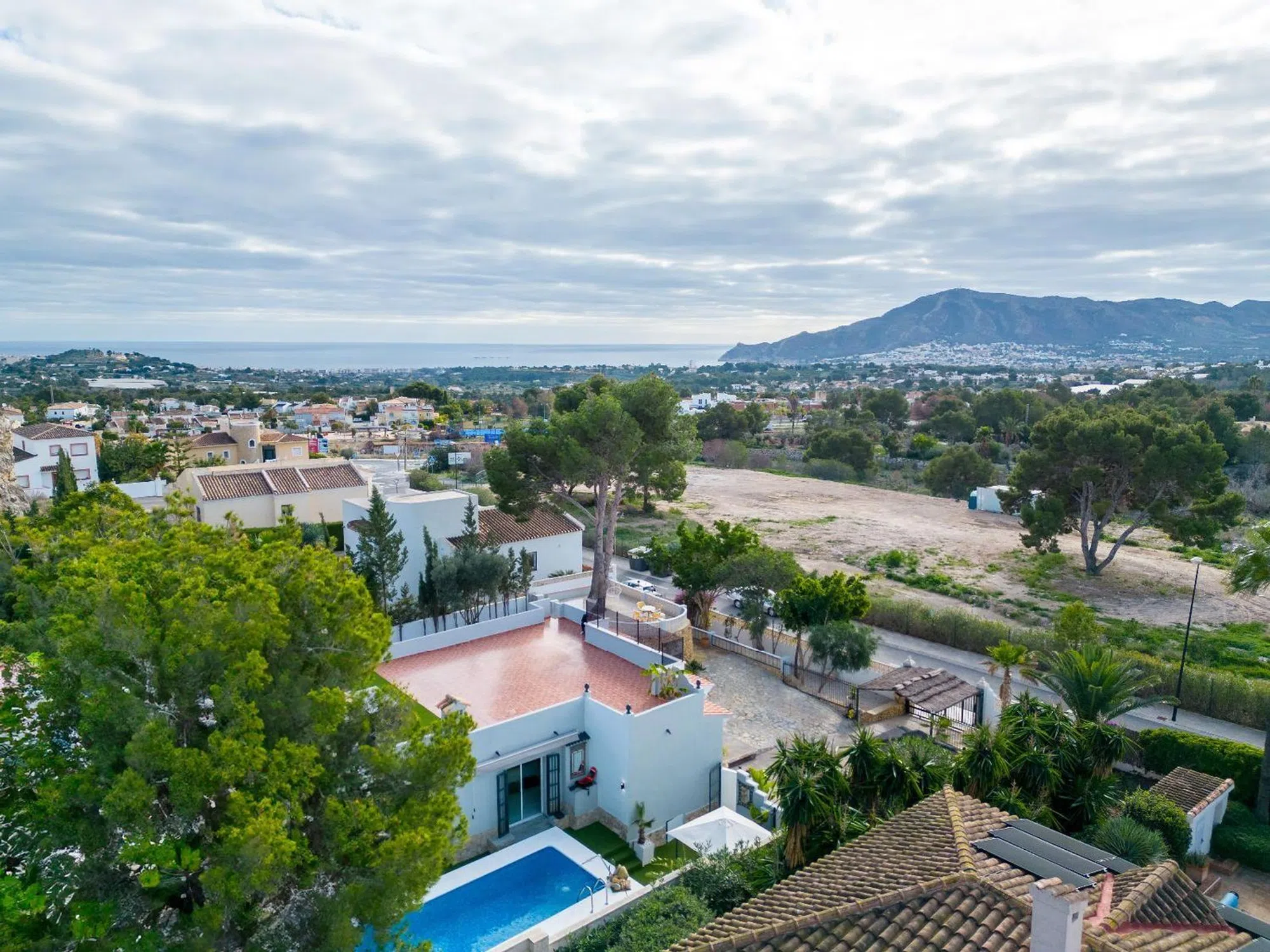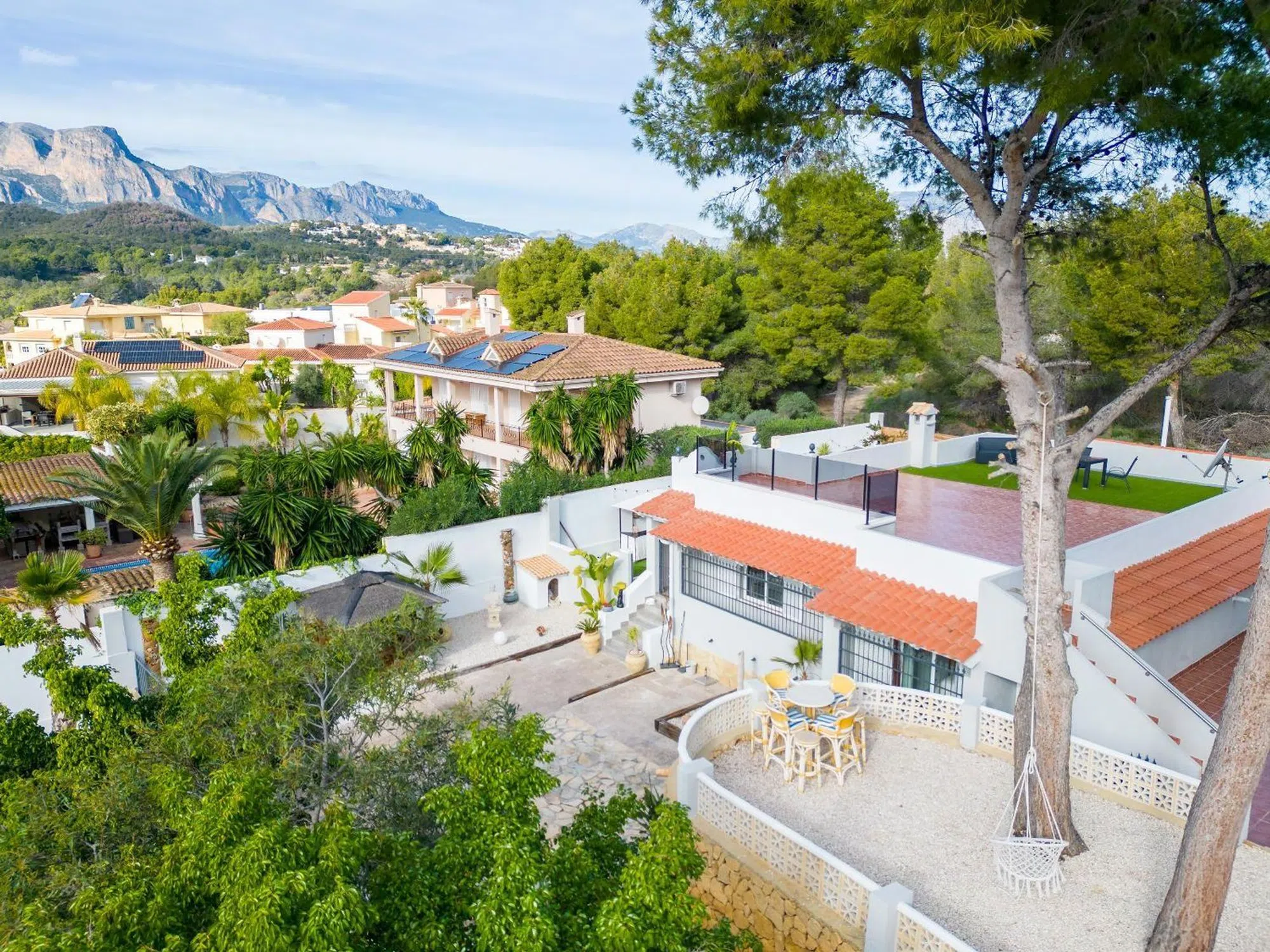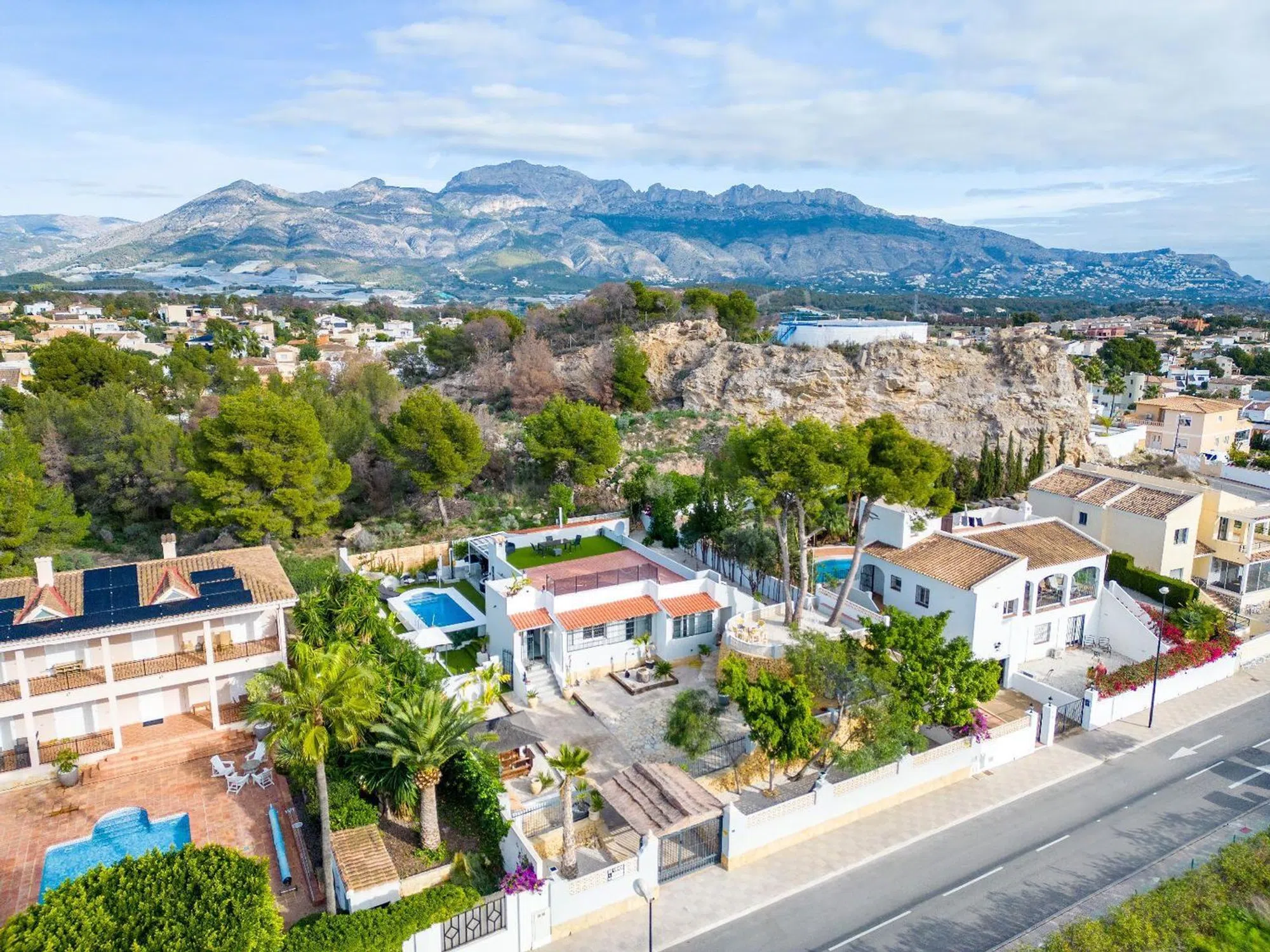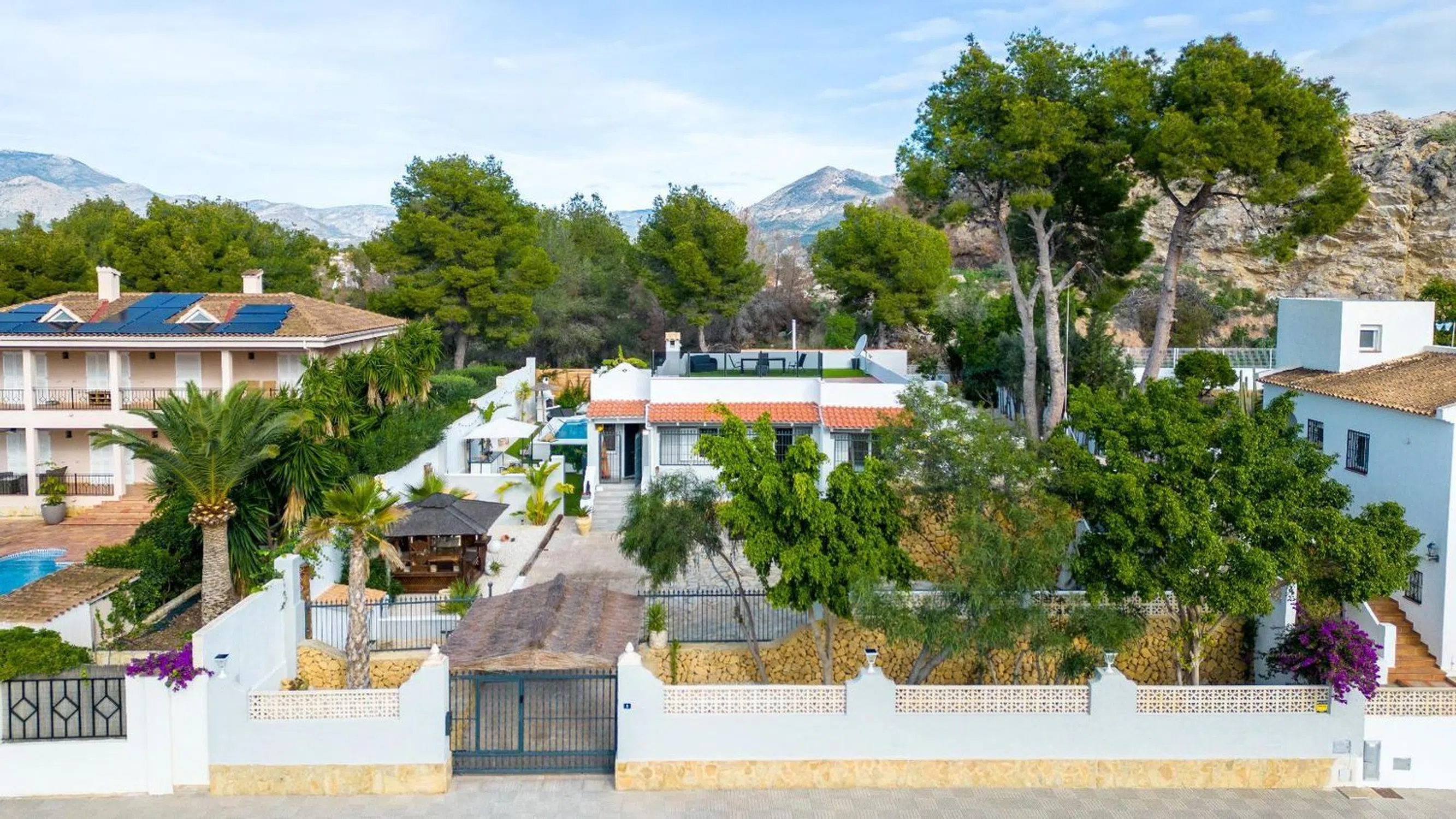 Encantadora Villa Reformada con Piscina y Solárium Características Principales: • Ubicación Estratégica: Situada a solo 8 minutos en coche de la costa de Altea. Ofrece fácil acceso a todos los servicios y atracciones locales. • Parcela Privada: Una amplia parcela de 790 m² que garantiza privacidad total, rodeada de un exuberante jardín con zonas para relajarse y disfrutar del clima mediterráneo. • Espacios Modernos: La villa, completamente reformada en 2023, cuenta con 164 m² construidos distribuidos en una planta, ofreciendo comodidad y funcionalidad. • Zona de Piscina y Jardín: Piscina privada rodeada de césped artificial, un jacuzzi independiente, bar de cócteles y ducha exterior. El entorno perfecto para disfrutar de momentos inolvidables al aire libre. • Amplio Solárium: Una gran terraza en la azotea, del tamaño de la vivienda, ideal para tomar el sol y disfrutar de vistas despejadas. • Interiores Elegantes: Salón con estufa de leña, comedor con estufa de pellets y cocina modernizada con electrodomésticos de alta calidad. • Comodidad Total: Tres dormitorios con baño en suite, armarios empotrados y acabados de alta gama. Uno de los baños incluye una bañera de hidromasaje para una experiencia de lujo. • Estacionamiento Seguro: Entrada con puerta eléctrica, cochera cubierta y espacio para varios vehículos. Descripción Detallada: Esta impresionante villa combina el encanto de un entorno natural con el confort de un diseño moderno. Reformada en 2023, la propiedad ofrece una sensación de confort y frescura, ideal tanto como residencia principal como casa de vacaciones. La distribución en una sola planta garantiza comodidad, mientras que el solárium y el jardín brindan espacios perfectos para disfrutar del clima soleado de la Costa Blanca. El acceso directo a la piscina y las áreas de ocio hacen que esta villa sea el lugar ideal para relajarse o socializar. Además, el pequeño bosque en la parte trasera es perfecto para paseos tranquilos o para el disfrute de mascotas. No pierda la oportunidad de visitar esta villa excepcional que combina diseño, comodidad y ubicación privilegiada. ¡Contáctenos hoy para organizar una visita y descubrir su próximo hogar en La Costa Blanca!