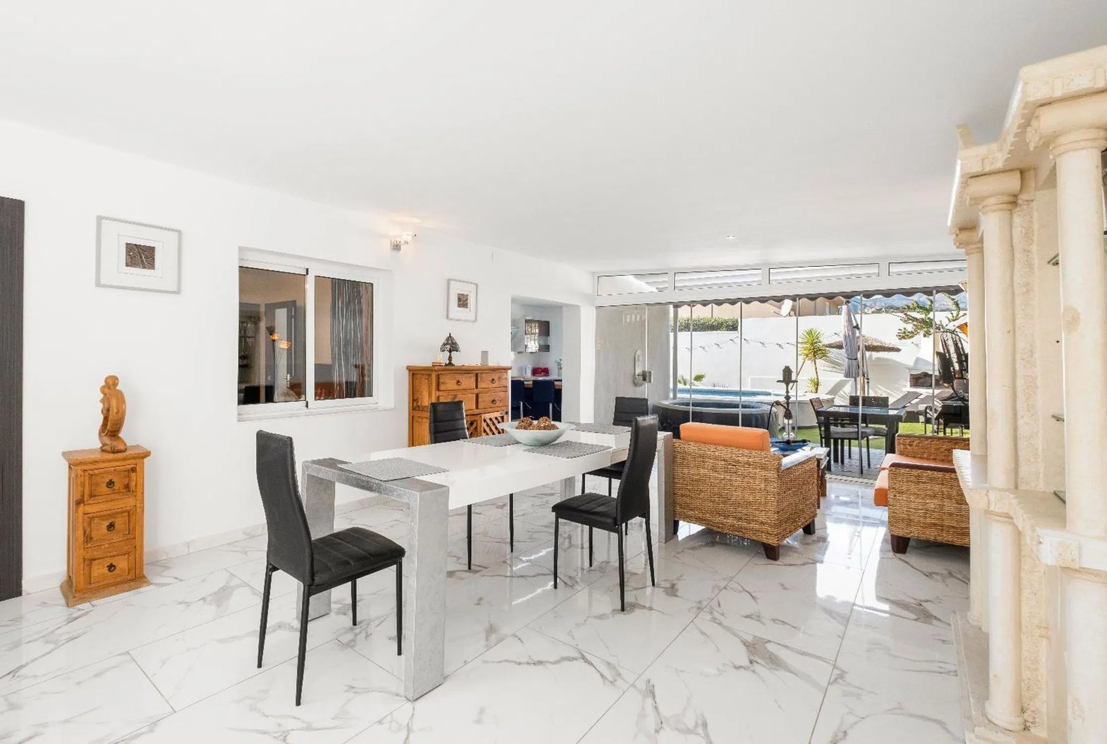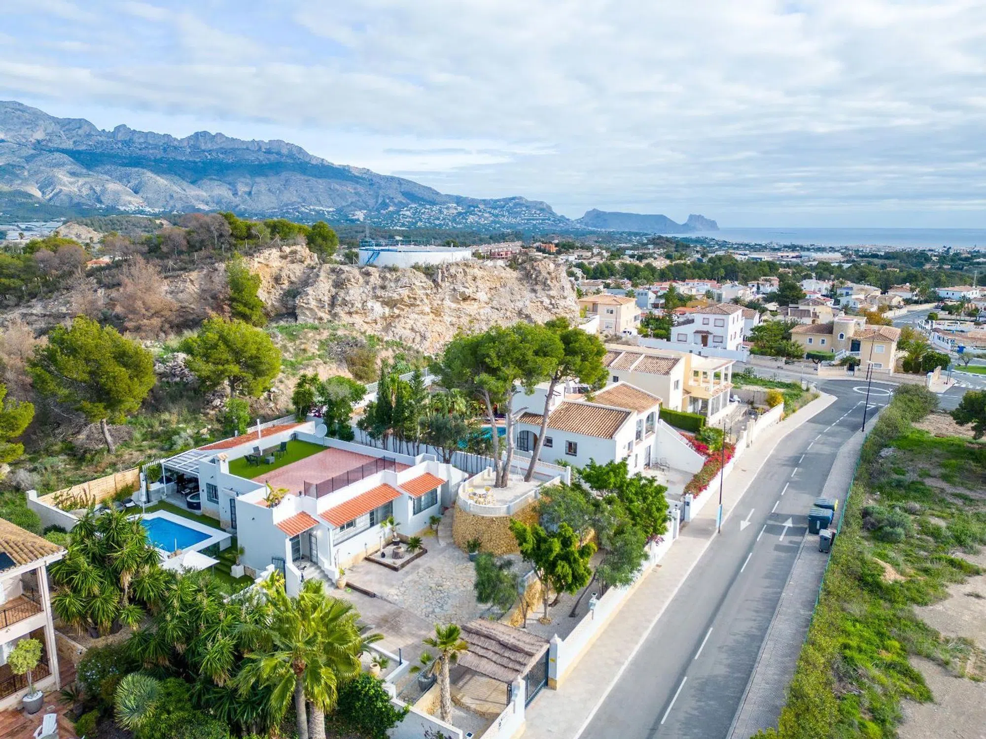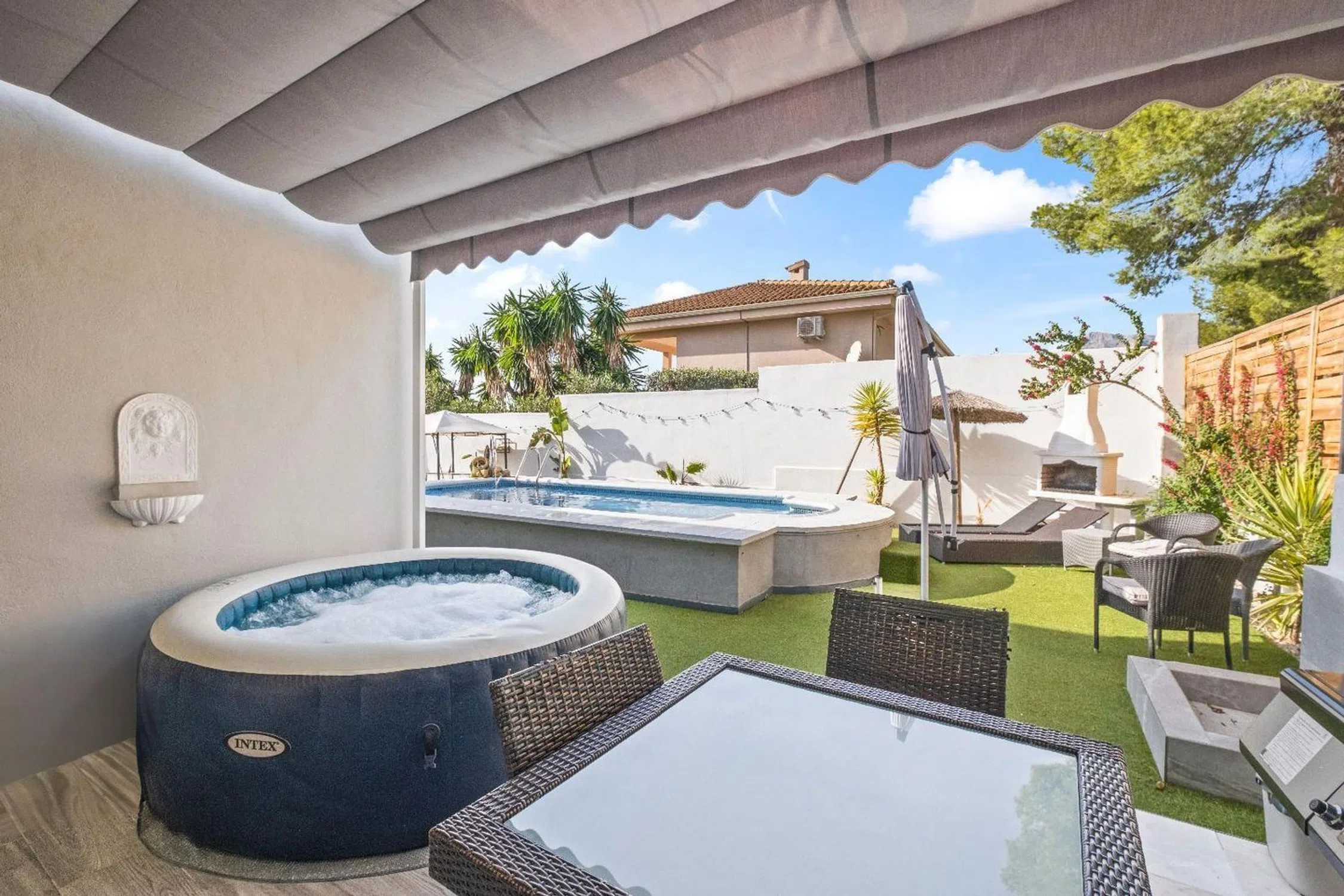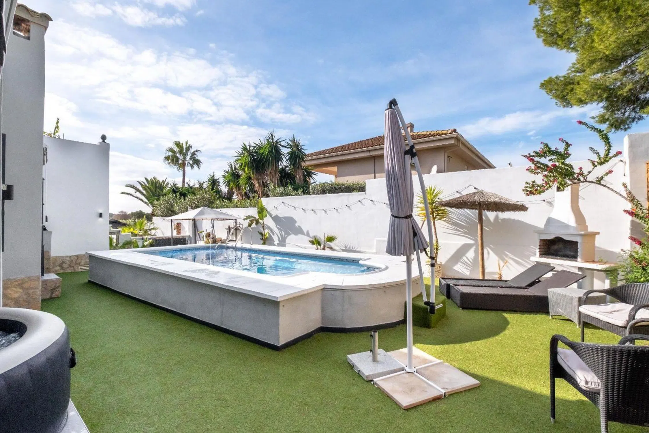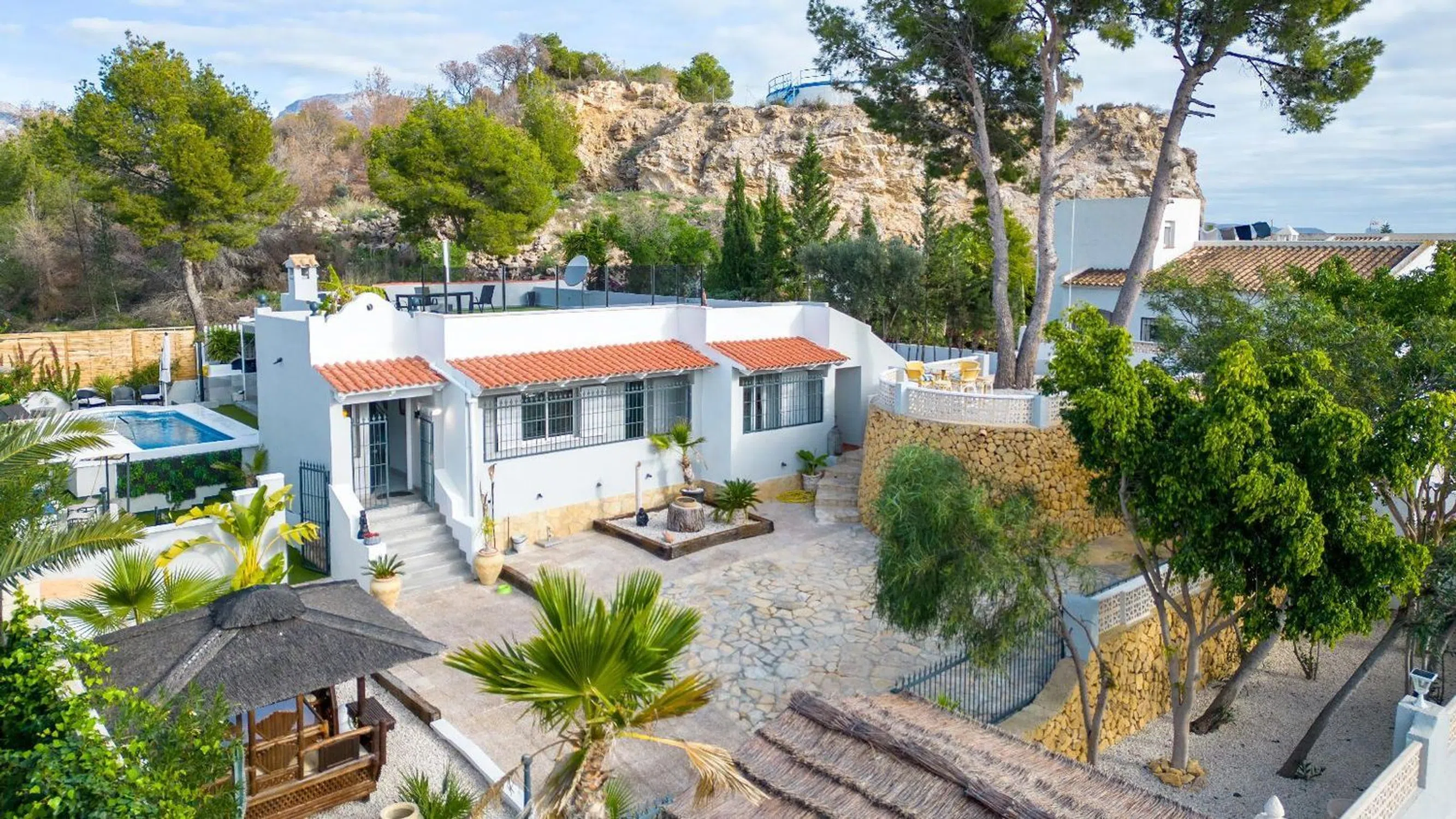 Encantadora Villa Reformada con Piscina y Solárium Características Principales: • Ubicación Estratégica: Situada a solo 8 minutos en coche de la costa de Altea. Ofrece fácil acceso a todos los servicios y atracciones locales. • Parcela Privada: Una amplia parcela de 790 m² que garantiza privacidad total, rodeada de un exuberante jardín con zonas para relajarse y disfrutar del clima mediterráneo. • Espacios Modernos: La villa, completamente reformada en 2023, cuenta con 164 m² construidos distribuidos en una planta, ofreciendo comodidad y funcionalidad. • Zona de Piscina y Jardín: Piscina privada rodeada de césped artificial, un jacuzzi independiente, bar de cócteles y ducha exterior. El entorno perfecto para disfrutar de momentos inolvidables al aire libre. • Amplio Solárium: Una gran terraza en la azotea, del tamaño de la vivienda, ideal para tomar el sol y disfrutar de vistas despejadas. • Interiores Elegantes: Salón con estufa de leña, comedor con estufa de pellets y cocina modernizada con electrodomésticos de alta calidad. • Comodidad Total: Tres dormitorios con baño en suite, armarios empotrados y acabados de alta gama. Uno de los baños incluye una bañera de hidromasaje para una experiencia de lujo. • Estacionamiento Seguro: Entrada con puerta eléctrica, cochera cubierta y espacio para varios vehículos. Descripción Detallada: Esta impresionante villa combina el encanto de un entorno natural con el confort de un diseño moderno. Reformada en 2023, la propiedad ofrece una sensación de confort y frescura, ideal tanto como residencia principal como casa de vacaciones. La distribución en una sola planta garantiza comodidad, mientras que el solárium y el jardín brindan espacios perfectos para disfrutar del clima soleado de la Costa Blanca. El acceso directo a la piscina y las áreas de ocio hacen que esta villa sea el lugar ideal para relajarse o socializar. Además, el pequeño bosque en la parte trasera es perfecto para paseos tranquilos o para el disfrute de mascotas. No pierda la oportunidad de visitar esta villa excepcional que combina diseño, comodidad y ubicación privilegiada. ¡Contáctenos hoy para organizar una visita y descubrir su próximo hogar en La Costa Blanca!