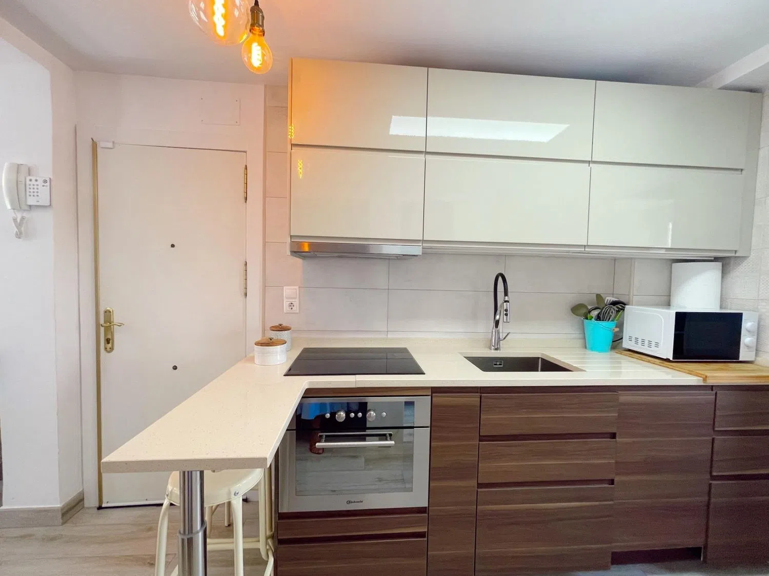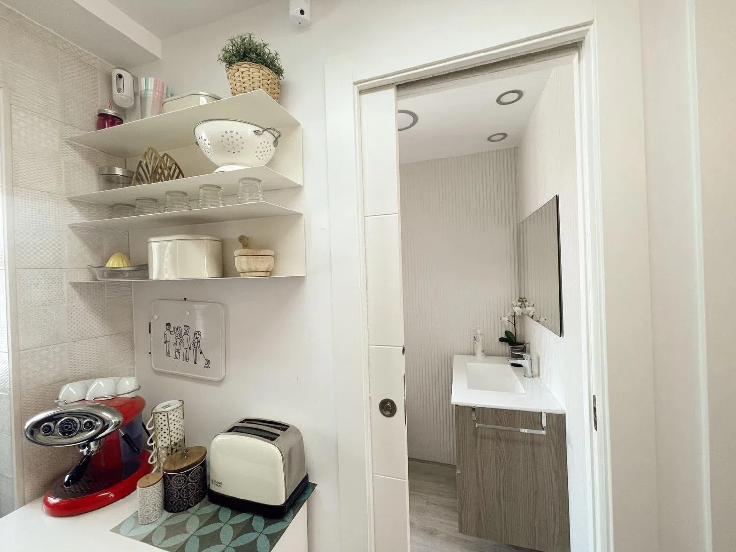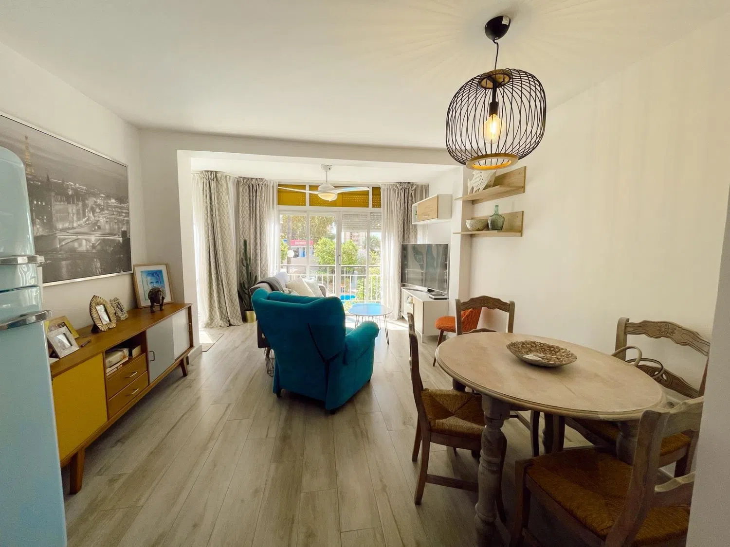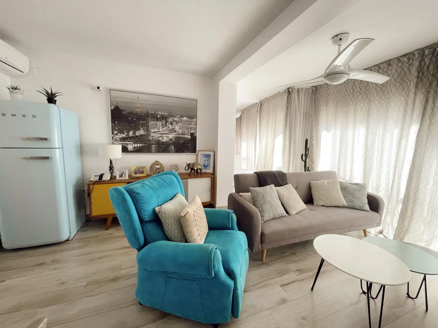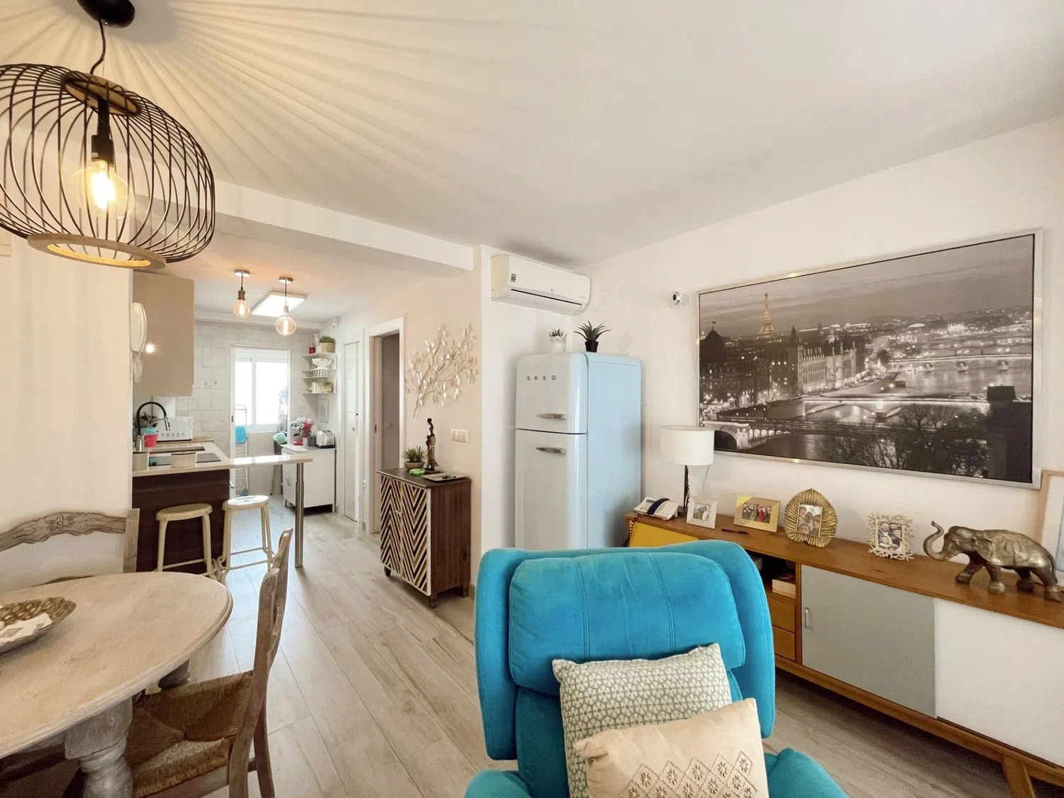La vivienda también representa una excelente opción como segunda residencia o inversión para alquiler, dado que la demanda de huéspedes es alta durante todo el año gracias a su ubicación privilegiada. En cuanto al interior, el salón comedor y la cocina comparten un espacio abierto que combina detalles vintage, como un frigorífico y electrodomésticos en suaves tonos pastel, pensados para aportar estilo y personalidad a la decoración. La paleta de colores en plata, gris y azul crea una atmósfera de calma y frescura.