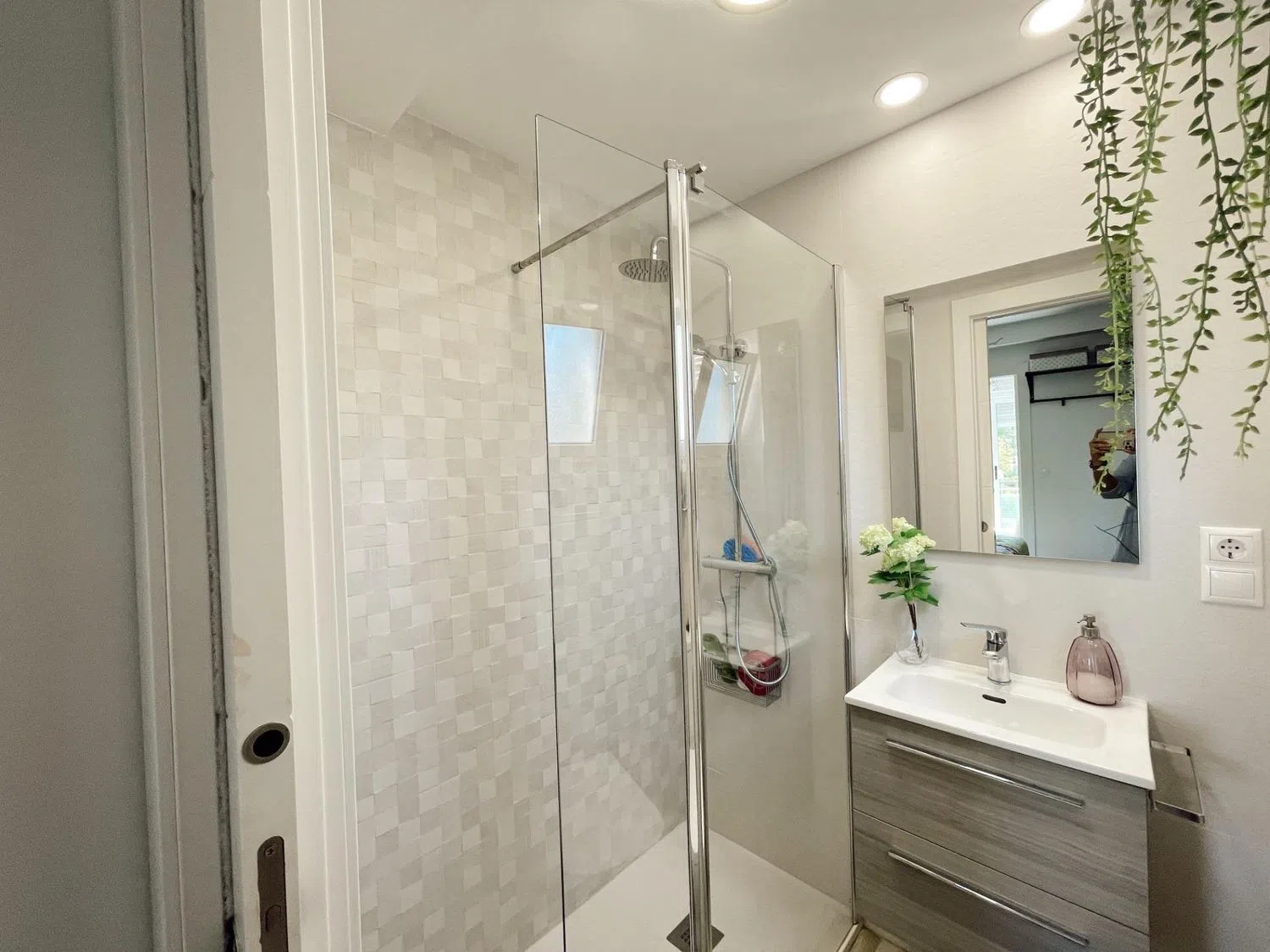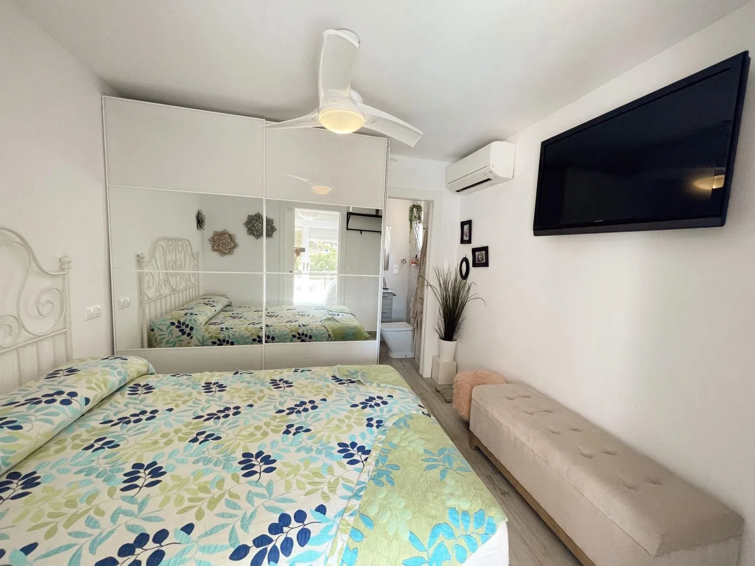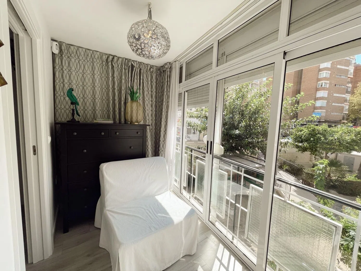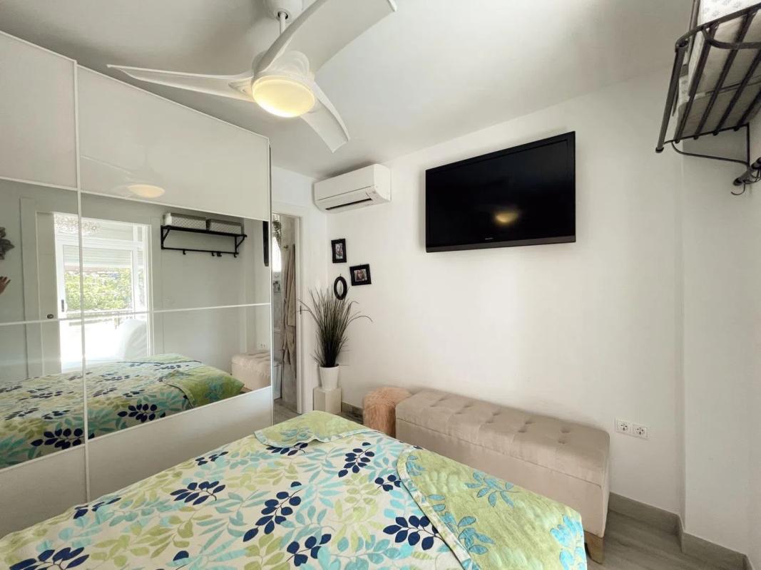 La terraza acristalada está diseñada para ofrecer vistas a la piscina, mientras que mejora el aislamiento acústico y se adapta a las condiciones climáticas durante todo el año, gracias al sistema de doble cristal. La vivienda cuenta con dos habitaciones dobles; la principal es una suite con armarios empotrados, instalación de TV, aire acondicionado y un baño completo reformado al detalle. La segunda habitación, actualmente adaptada para niños, comparte un segundo baño moderno de estilo spa en blanco y negro, con un área de ducha que evoca tranquilidad.