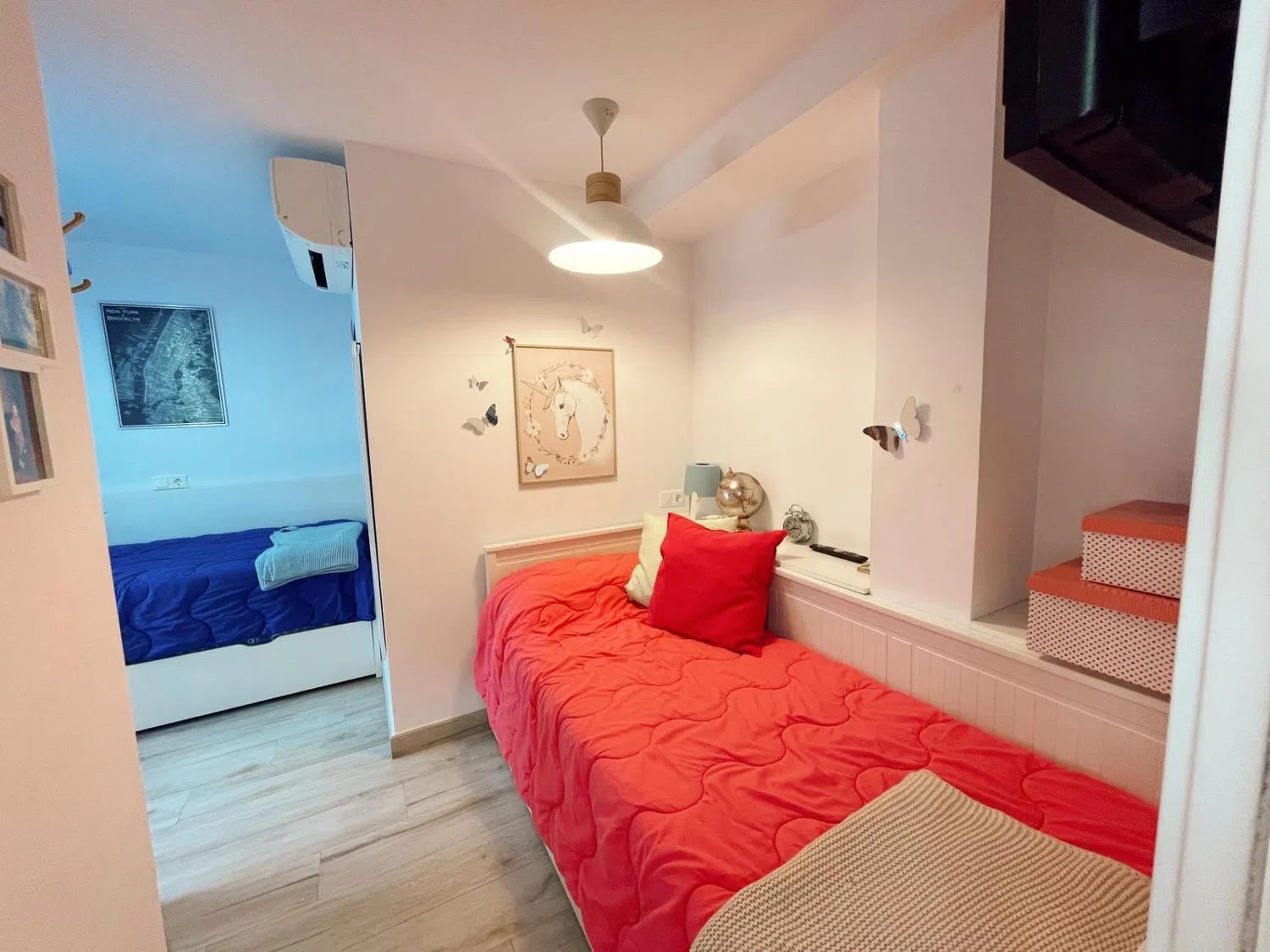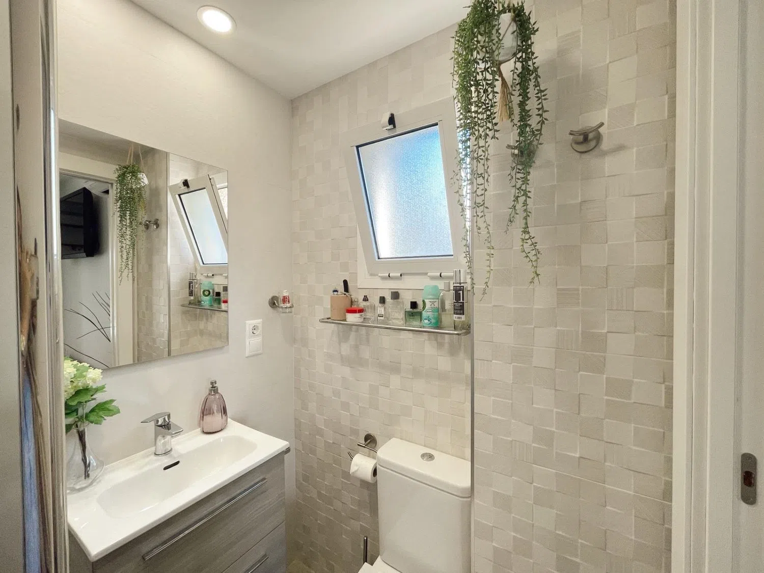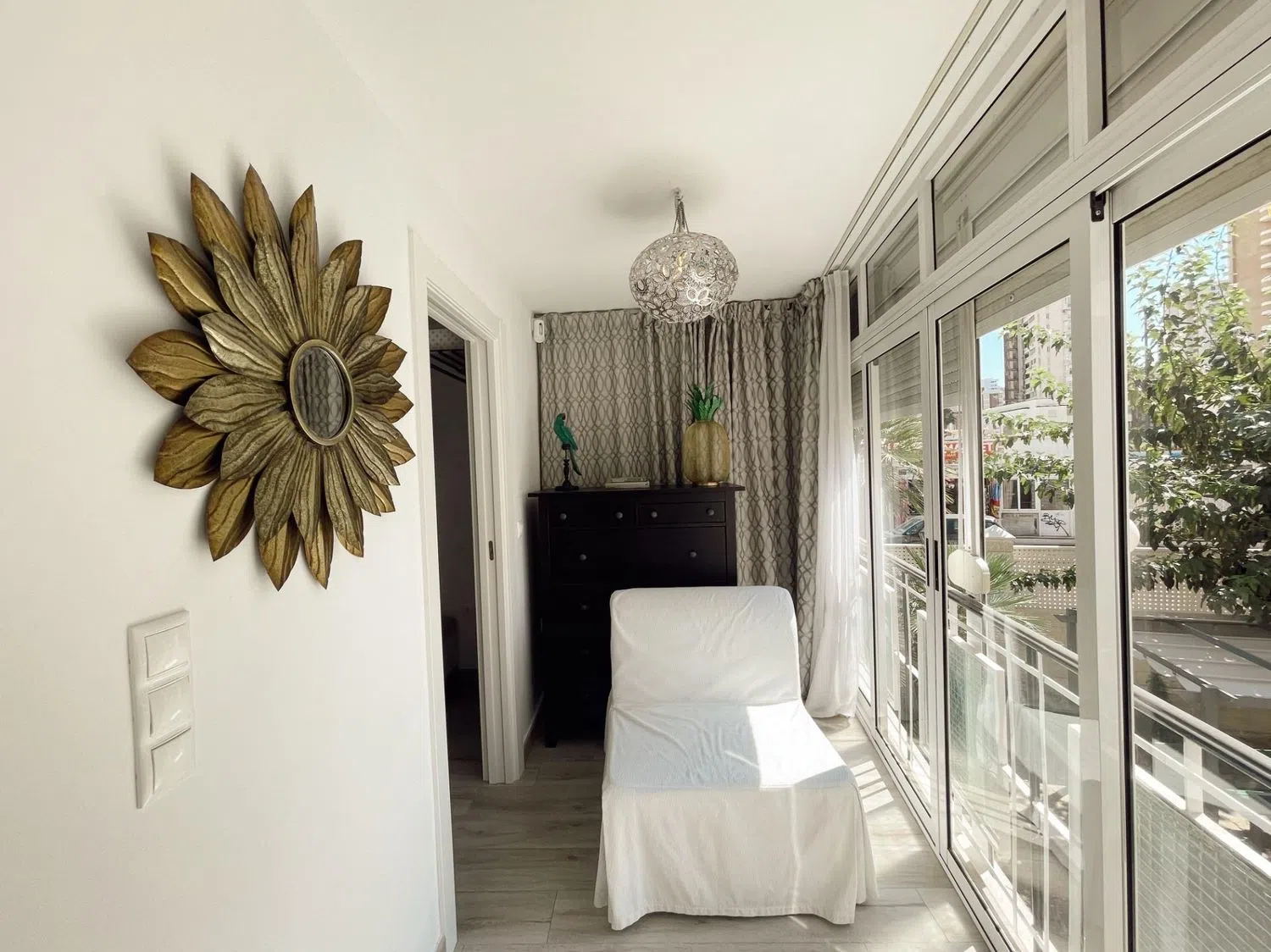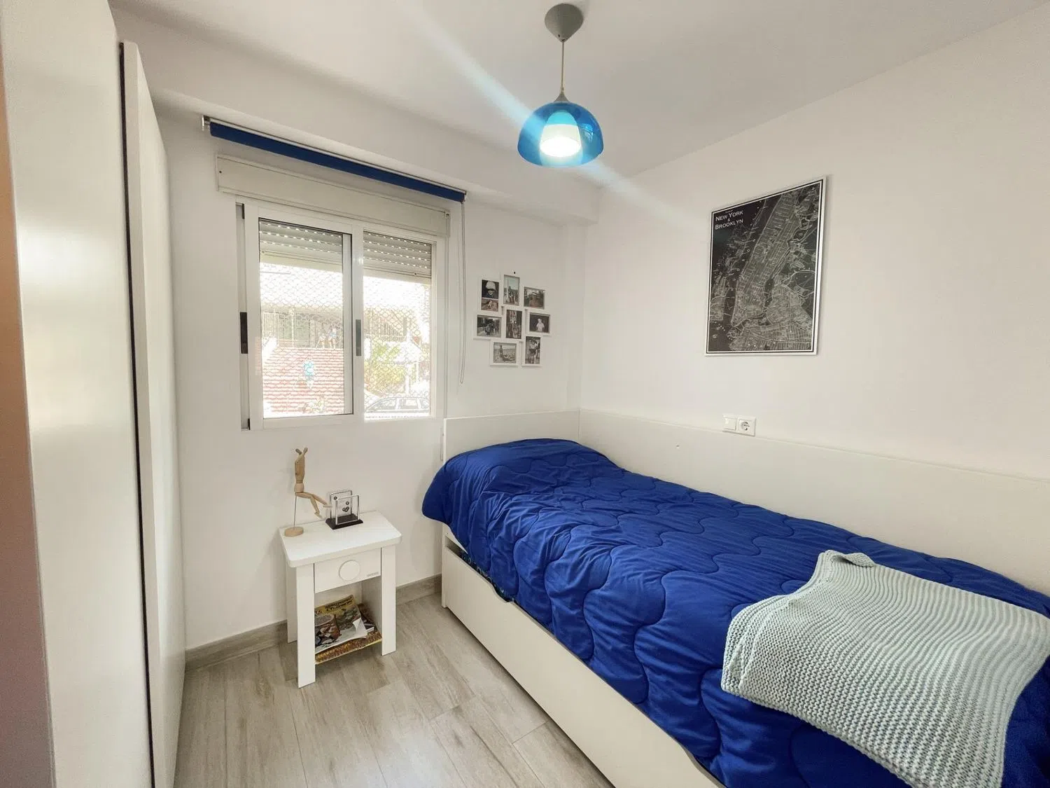 La terraza acristalada está diseñada para ofrecer vistas a la piscina, mientras que mejora el aislamiento acústico y se adapta a las condiciones climáticas durante todo el año, gracias al sistema de doble cristal. La vivienda cuenta con dos habitaciones dobles; la principal es una suite con armarios empotrados, instalación de TV, aire acondicionado y un baño completo reformado al detalle. La segunda habitación, actualmente adaptada para niños, comparte un segundo baño moderno de estilo spa en blanco y negro, con un área de ducha que evoca tranquilidad.