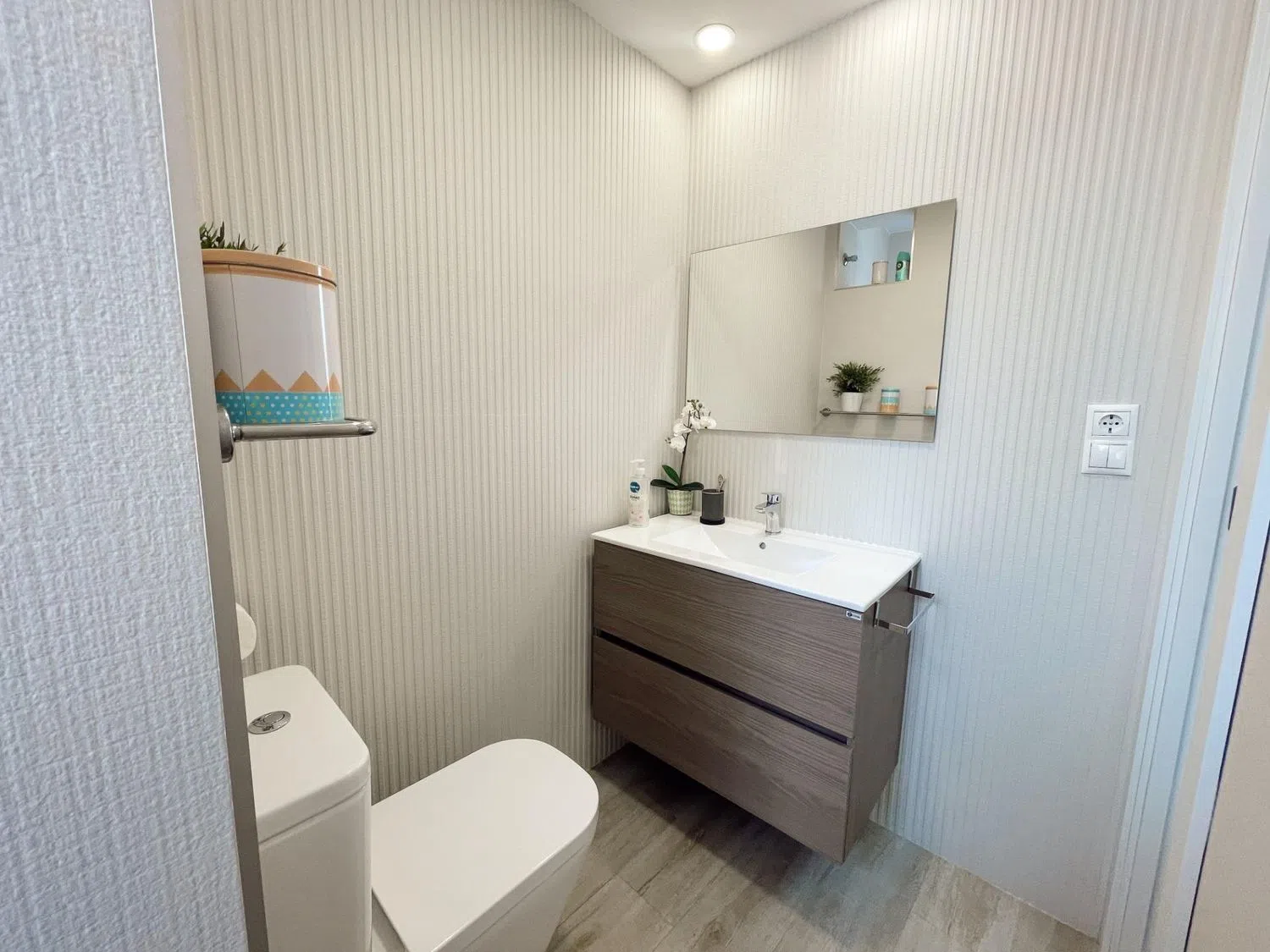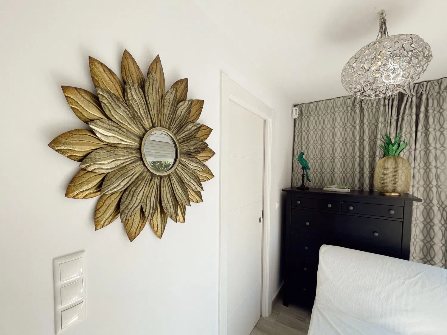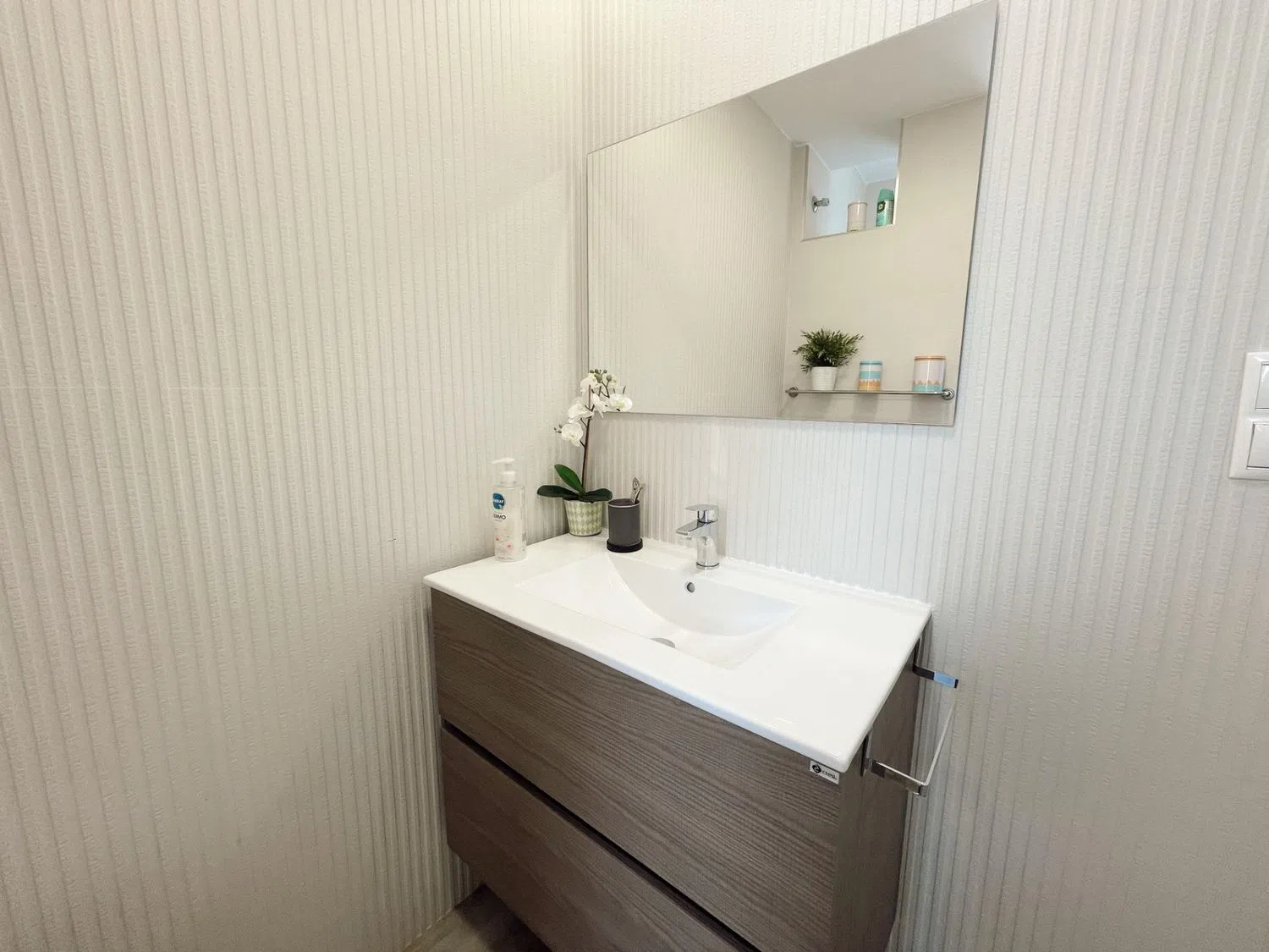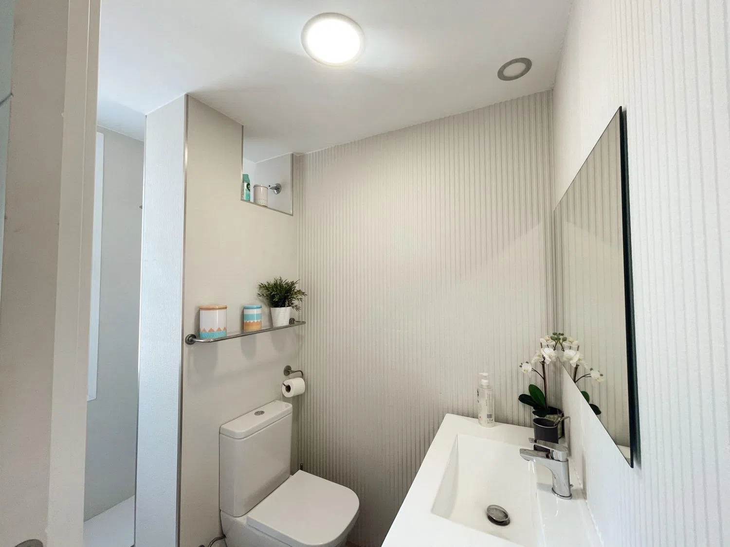 La terraza acristalada está diseñada para ofrecer vistas a la piscina, mientras que mejora el aislamiento acústico y se adapta a las condiciones climáticas durante todo el año, gracias al sistema de doble cristal. La vivienda cuenta con dos habitaciones dobles; la principal es una suite con armarios empotrados, instalación de TV, aire acondicionado y un baño completo reformado al detalle. La segunda habitación, actualmente adaptada para niños, comparte un segundo baño moderno de estilo spa en blanco y negro, con un área de ducha que evoca tranquilidad.