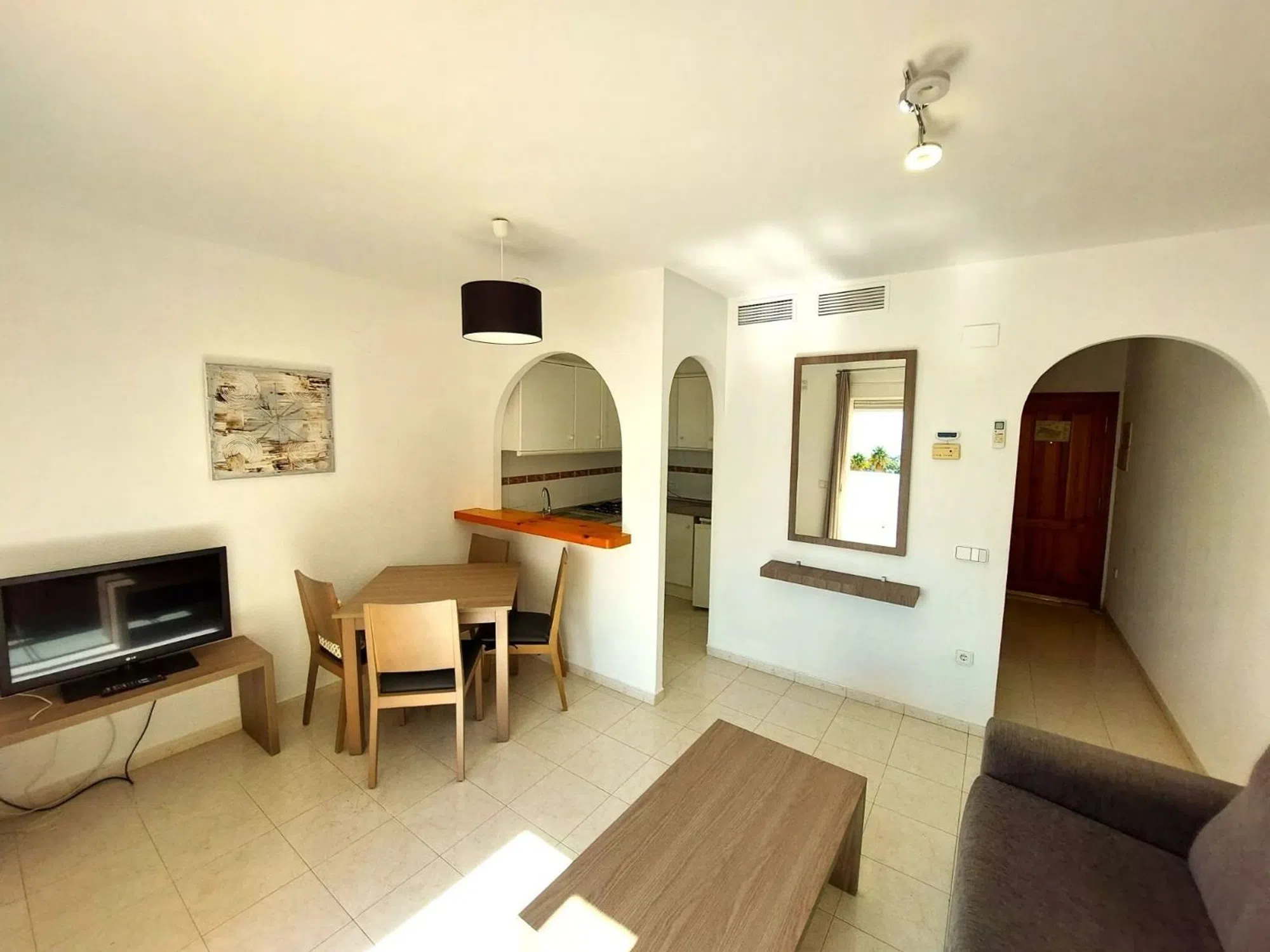 Este bungalow de un dormitorio en Calpe combina comodidad y ocio en un entorno único. La vivienda ofrece un salón con sofá cama, cocina equipada y baño moderno. Desde la terraza principal, unas escaleras de caracol conducen a un amplio solárium privado, ideal para tomar el sol, relajarse o disfrutar de momentos al aire libre con vistas despejadas. La urbanización cuenta con hasta 7 piscinas comunitarias con toboganes, pensadas para divertirse en familia o con amigos. Su excelente localización permite llegar en pocos minutos a las playas y al centro de Calpe, con todos los servicios a mano. Se entrega completamente amueblado y con plaza de aparcamiento exterior dentro del complejo, listo para entrar a disfrutar desde el primer día. Una opción perfecta como segunda residencia o inversión turística. [IW].