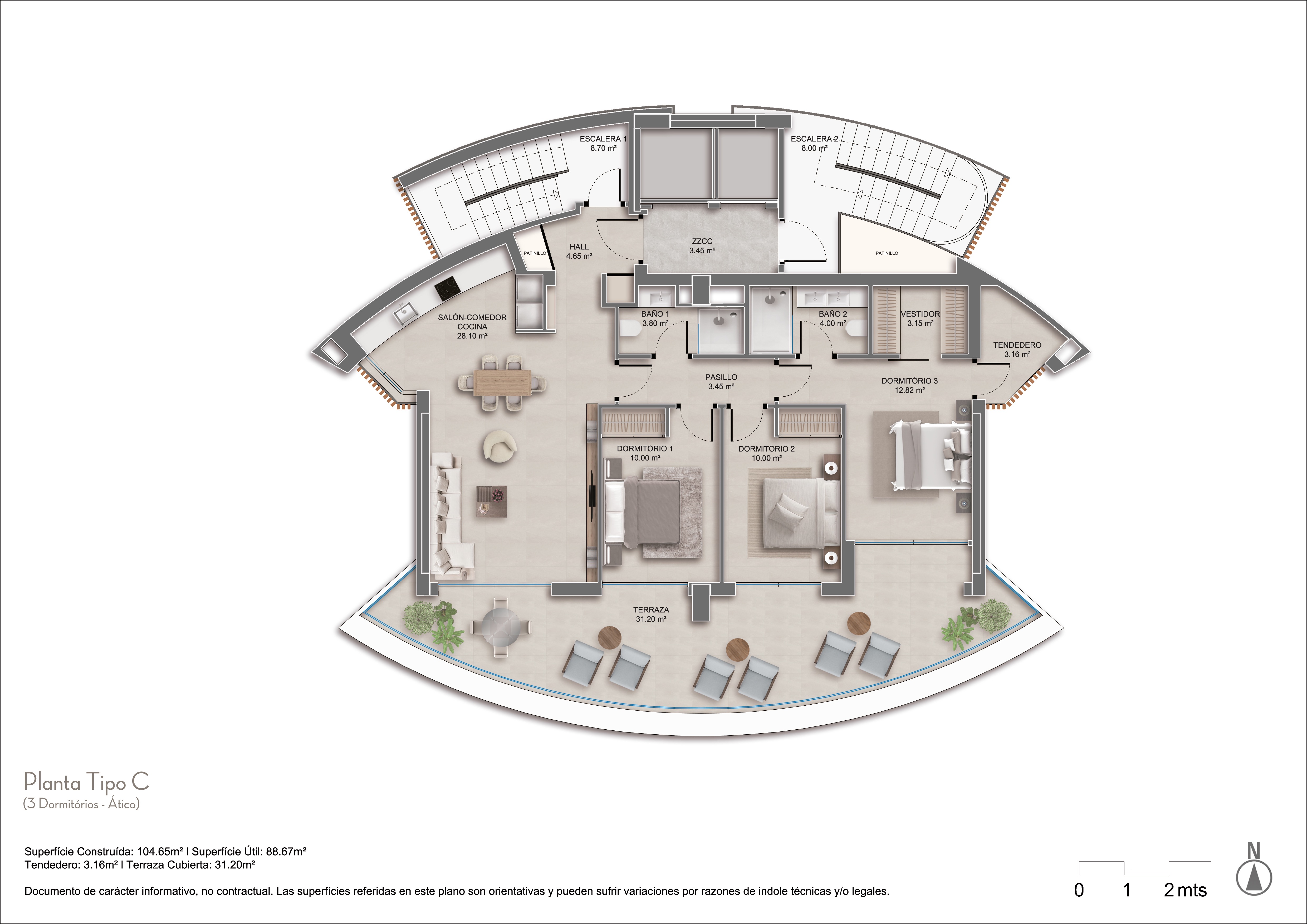 L'immeuble comprend 16 étages et 17 appartements, y compris un penthouse duplex avec son propre espace détente sur le toit. Il dispose d'un ascenseur, d'une piscine commune et d'un parking avec espaces de rangement. La construction et les finitions sont de la plus haute qualité, offrant aux résidents un environnement moderne et sophistiqué.