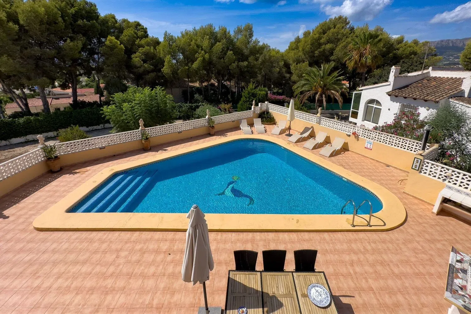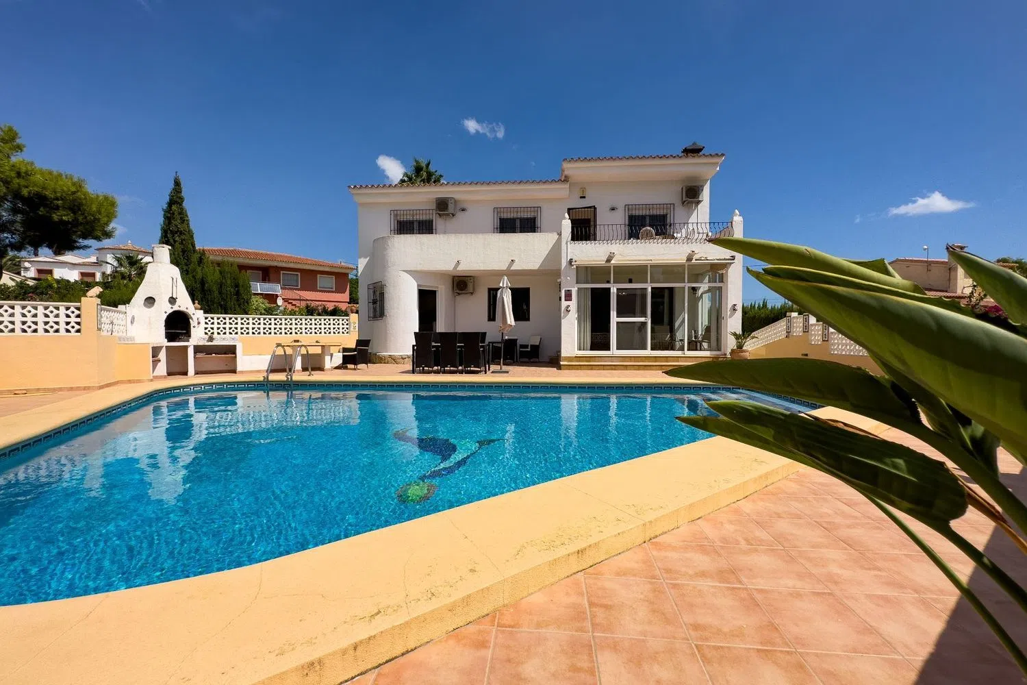 Todos los dormitorios están equipados con aire acondicionado y armarios empotrados, brindando comodidad y funcionalidad. En el exterior, la villa cuenta con una generosa parcela cerrada que ofrece espacio para estacionar varios vehículos y un garaje de una plaza. La gran terraza alberga una piscina y una ducha exterior, así como una agradable barbacoa de obra, ideal para disfrutar de comidas al aire libre.