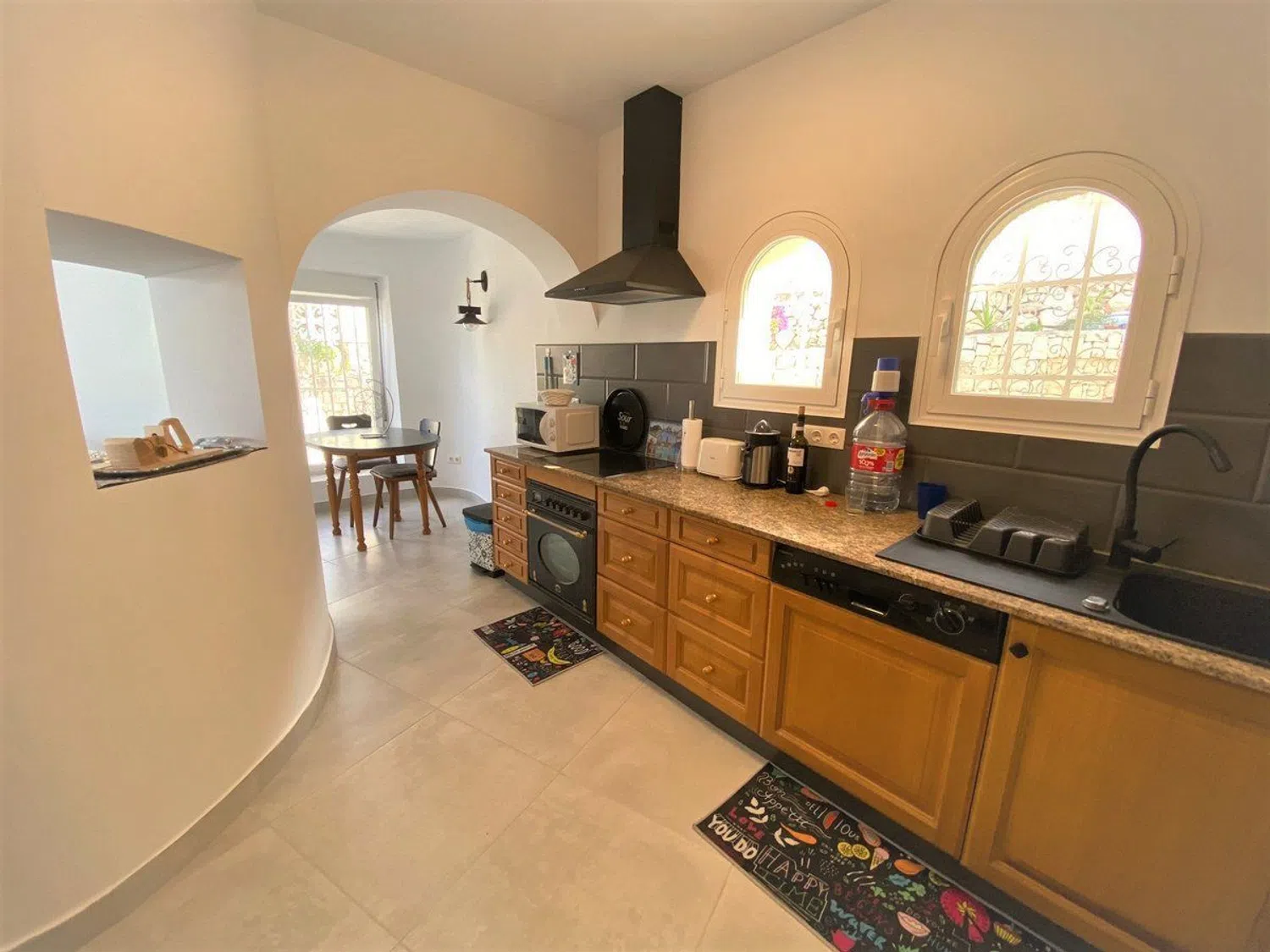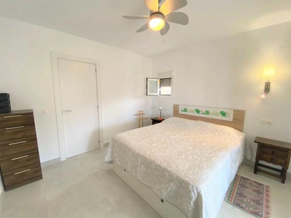 El segundo apartamento se accede a través de la escalera exterior y, aunque no ha sido renovado, se encuentra en buen estado. Este incluye un amplio salón con una cocina americana de concepto abierto, dos dormitorios muy generosos en tamaño, un aseo y un baño con ducha, así como una práctica zona de lavandería y aire acondicionado en los dormitorios. Fuera, hay una gran terraza ideal para cenas con familiares y amigos, además de un gran garaje cerrado de aproximadamente 45 m², que alberga un taller de aproximadamente 15 m² con ventanas adecuadas.