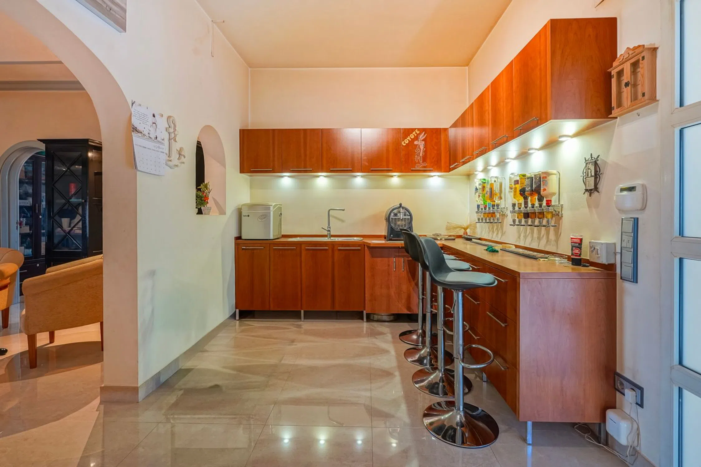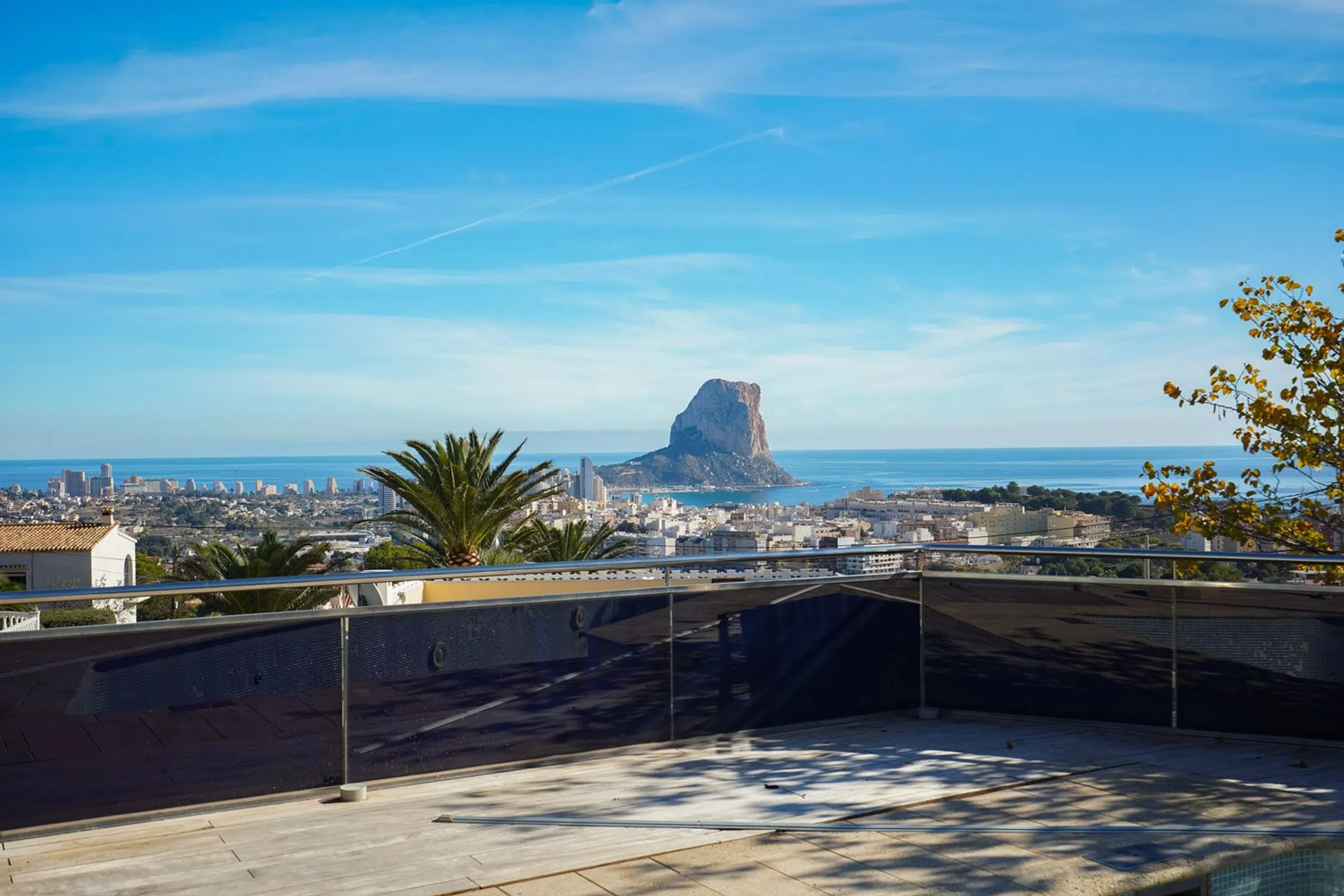 Impresionante villa con vistas panorámicas al mar,Esta impresionante villa, construida en 2006 sobre una amplia parcela de 2.210 m2, está distribuida en tres plantas y ofrece unas vistas panorámicas excepcionales que se extienden desde el Cap d'Or en Moraira hasta más allá del Peñón de Ifach y el skyline de Calpe.La planta principal destaca por su amplitud y comodidad. Al entrar encontramos un luminoso vestíbulo que da acceso a un amplio bar integrado, ideal para recibir invitados, y a un gran salón con salida directa a la terraza cubierta. La generosa cocina, totalmente equipada y diseñada con muebles a medida e iluminación interior, ofrece unas preciosas vistas al mar. En esta misma planta se ubican dos amplios dormitorios, ambos con vestidor y baño en suite, lo que proporciona un alto nivel de confort y privacidad.La planta baja está dedicada al ocio e incluye una espectacular sala multimedia equipada con sistema de sonido Bose 5.1, amplificador Denon, proyector Canon 3D con gafas, pantalla eléctrica, luces de discoteca y otros elementos que la convierten en un verdadero centro recreativo privado. En esta planta también encontramos un tercer dormitorio, un gimnasio (que podría convertirse en un cuarto dormitorio), un baño exterior, un amplio garaje y un trastero.El nivel superior alberga una magnífica terraza con una pérgola eléctrica regulable, un jacuzzi de seis plazas de la marca Roca, una sauna nueva de Goccia Spa, una ducha de hidromasaje y un cerramiento de cristal con aperturas laterales y estores eléctricos. La iluminación LED ambiental completa un espacio diseñado para disfrutar de la relajación y la privacidad con unas vistas incomparables.El exterior de la villa es igualmente impresionante. La zona de la piscina cuenta con un gran solárium rodeado por tres robustas pérgolas de madera capaces de soportar vientos de hasta 180 km/h, una doble cascada decorativa con pasarelas, un horno moruno y una barbacoa argentina sin estrenar. El jardín alberga una amplia variedad de árboles frutales, entre los que se incluyen dos grandes higueras, un gran almendro, un manzano, un peral, un limonero, un pomelo, un naranjo, un mandarino, un granado, un aguacate, un albaricoquero y una parra. También se ha instalado un sistema de iluminación alrededor de las diferentes zonas del exterior. El acceso a la finca se facilita mediante cuatro puertas automáticas, lo que permite entrar y salir fácilmente con perros. Además del garaje, hay varias plazas de aparcamiento.La vivienda dispone también de un avanzado sistema fotovoltaico compuesto por tres torres solares motorizadas que siguen automáticamente la trayectoria del sol, paneles adicionales en la cubierta, cuatro torres de baterías de litio y tres inversores Victron Energy, generando un total aproximado de 30 kW.En materia de seguridad y funcionalidad, la villa cuenta con un sistema de videovigilancia con 24 cámaras, fosa séptica de doble depósito, descalcificador, filtros adicionales y un cuarto técnico con cloración salina, bomba de calor para la piscina y un termo independiente para la ducha exterior. El garaje, equipado con nuevo mobiliario a medida, se complementa con ventiladores industriales estratégicamente ubicados para evitar humedades. Los suelos de las plantas principales están revestidos de maderas nobles, aportando elegancia y calidez. Además, los espacios bajo la cimentación ofrecen potencial para crear un bar, pub o sala adicional. La propiedad dispone también de depósitos subterráneos para recogida de agua de lluvia, aunque requieren reparación.En conjunto, se trata de una villa única por su amplitud, privacidad, espectaculares vistas y enorme potencial. Aunque necesita algunas reformas y reparaciones, ofrece una base excepcional para crear una residencia exclusiva en un entorno tranquilo cerca de la costa.Partida Cucarres es una de las zonas residenciales más tranquilas y codiciadas de Calpe. Situada en las laderas.