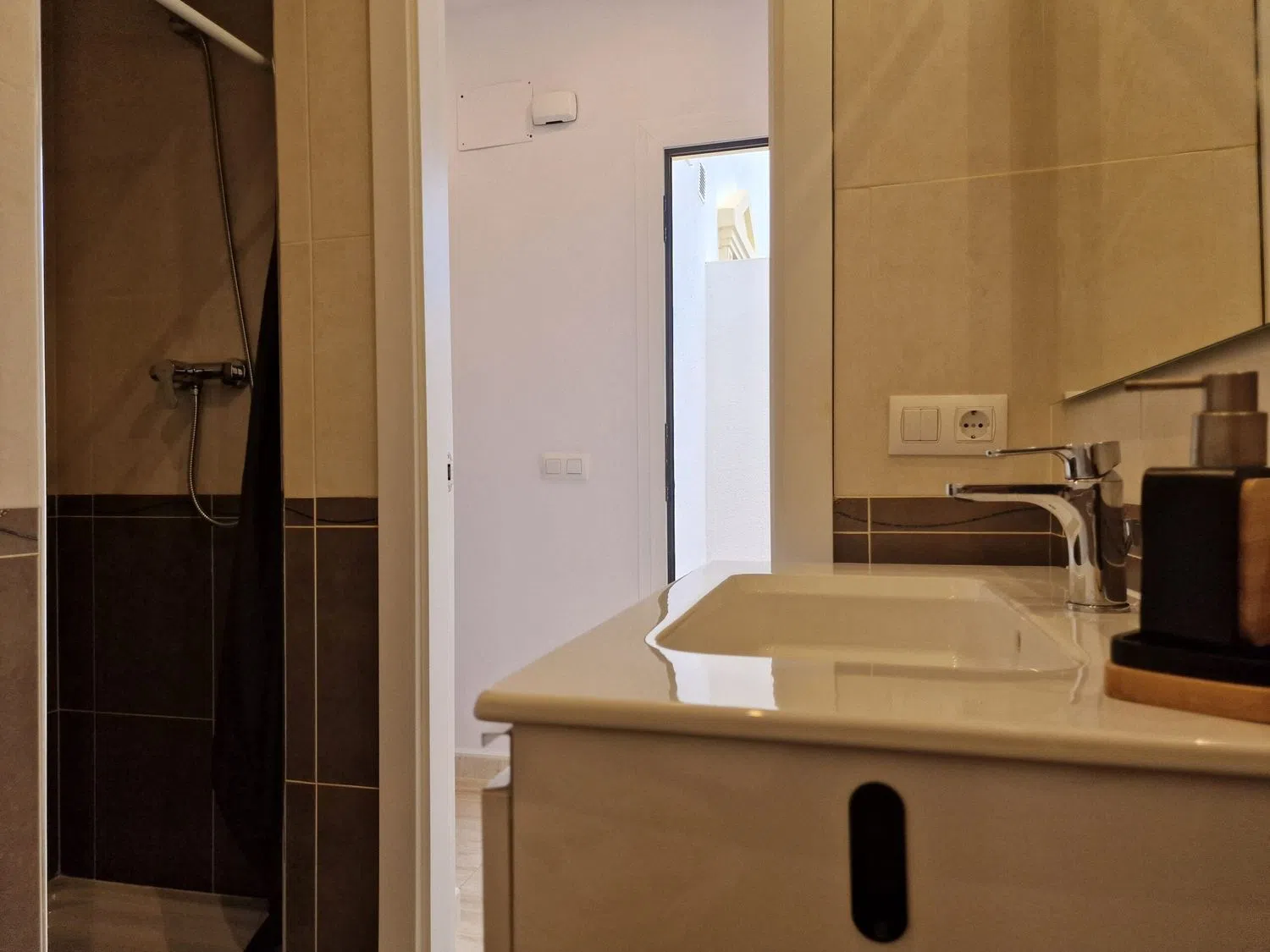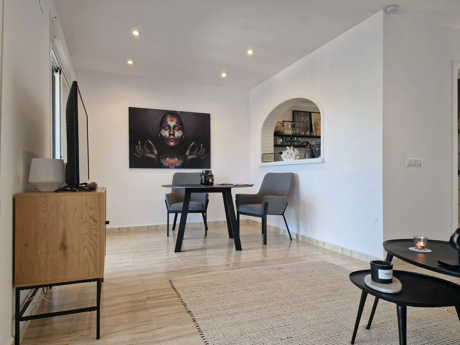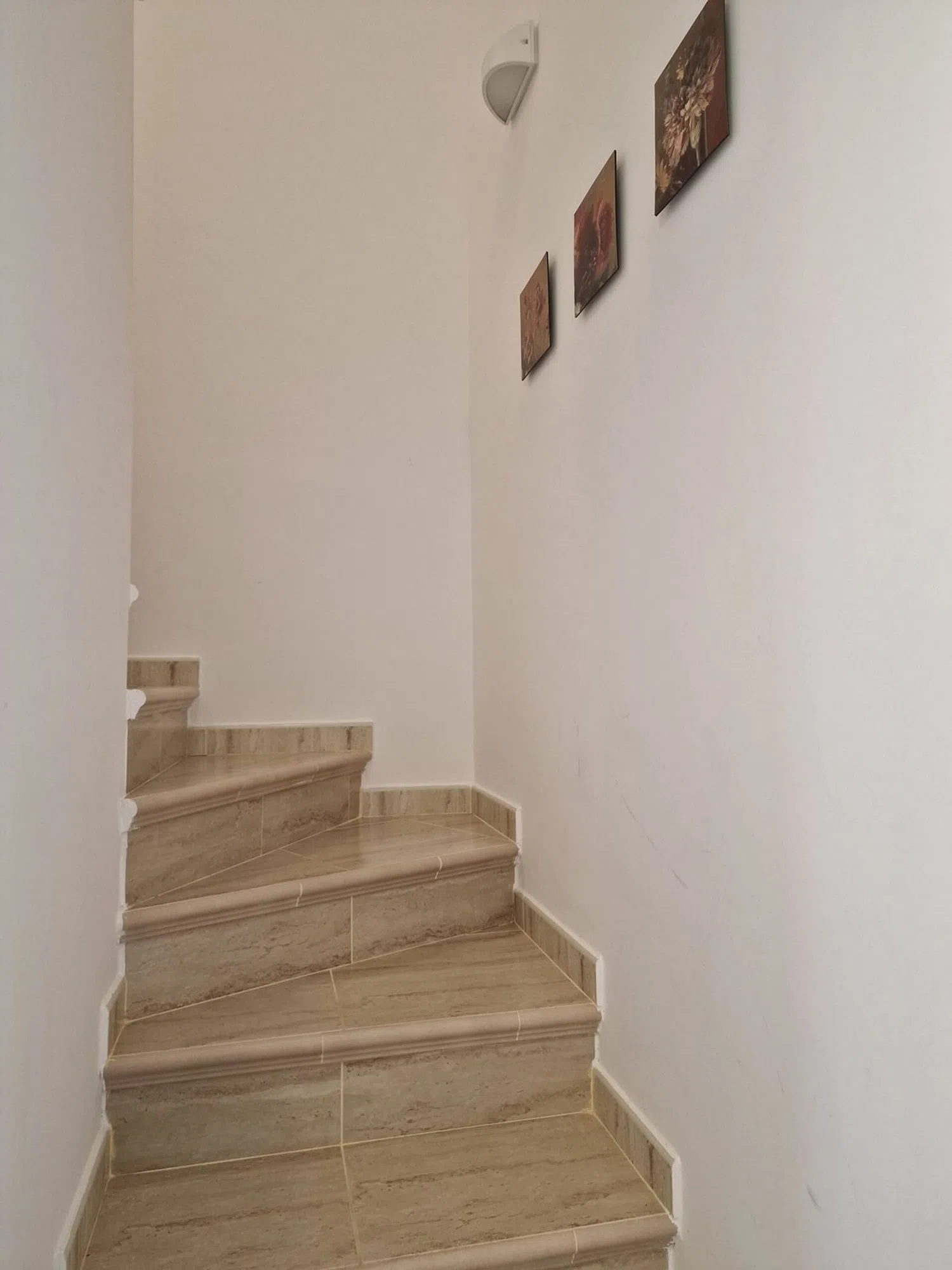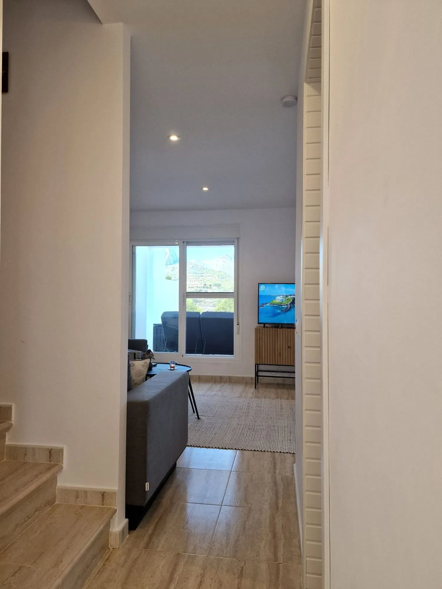 En la planta superior, hay dos acogedores dormitorios que comparten un baño y una terraza adicional que también ofrece vistas encantadoras. Los espacios están equipados con aire acondicionado para garantizar el confort durante todo el año. Además, los residentes tienen acceso a una piscina compartida entre las cuatro viviendas del bloque, perfecta para refrescarse en los días soleados.
